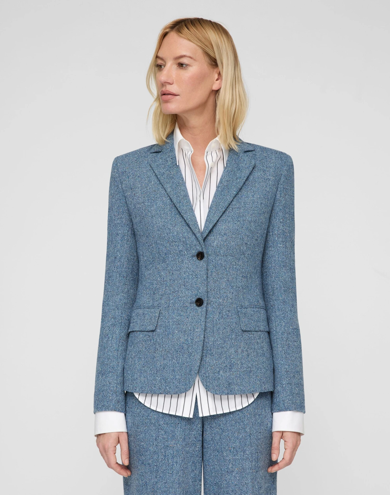 This double-button blazer is crafted from soft yet structured Italian Donegal tweed, flecked with subtle pops of color. Tailored to a slim fit with precise darting, it’s finished with a felted undercollar, flap pockets and buttoned cuff vents.