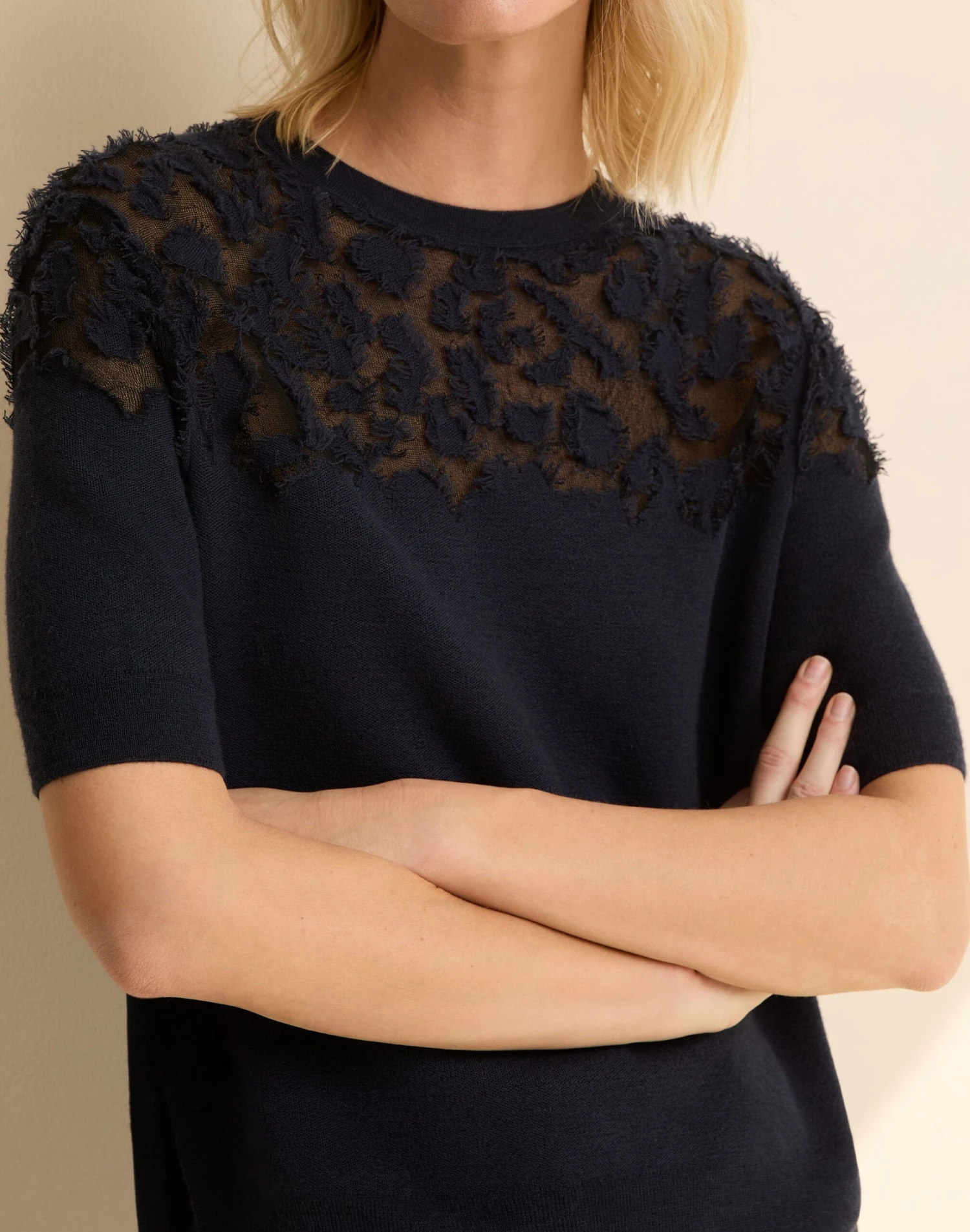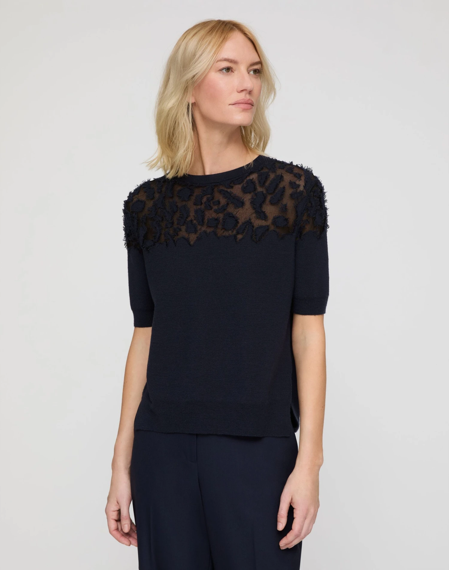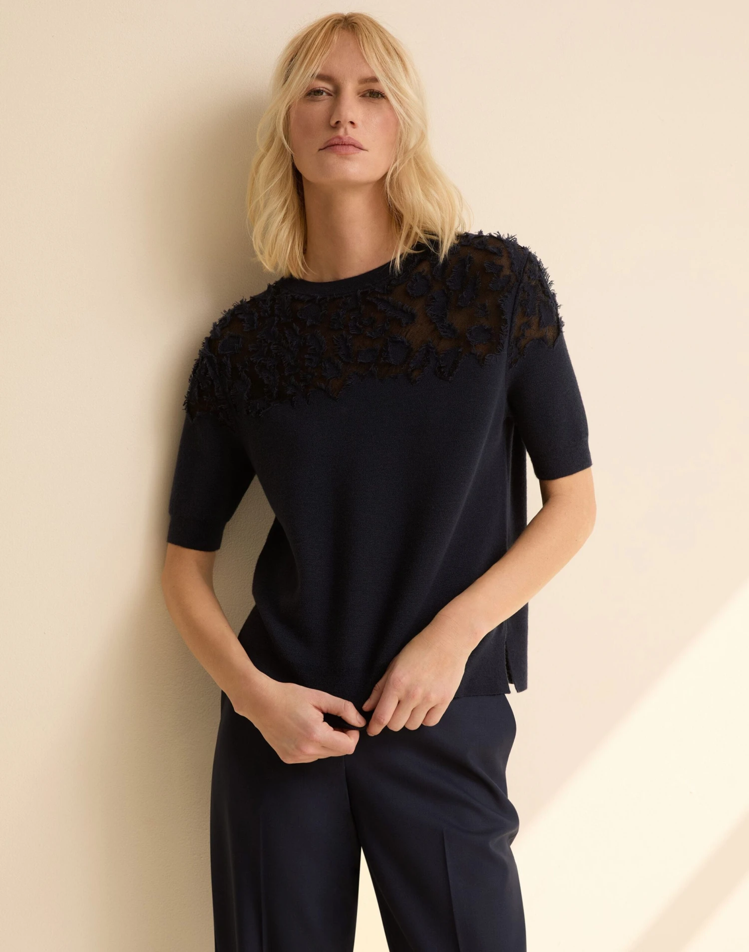 This finely knit cashmere crewneck sweater blends sheer viscose yarns in a jacquard-knit design, accented with hand-cut eyelash fringe. The relaxed fit extends to above elbow sleeves, finished with ribbed trim.