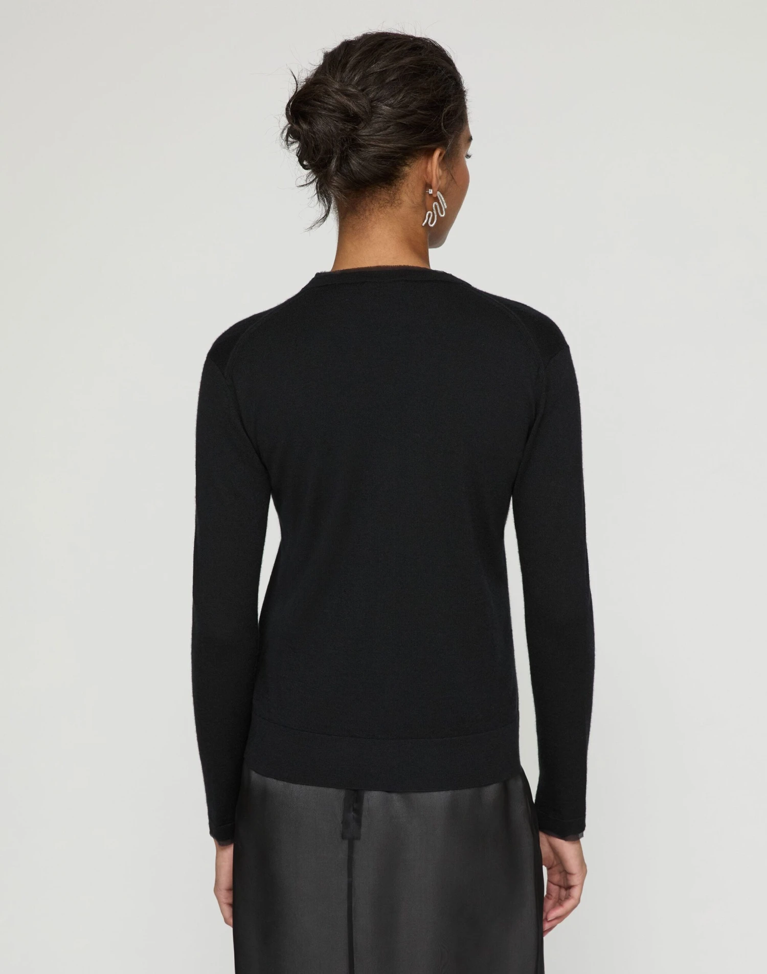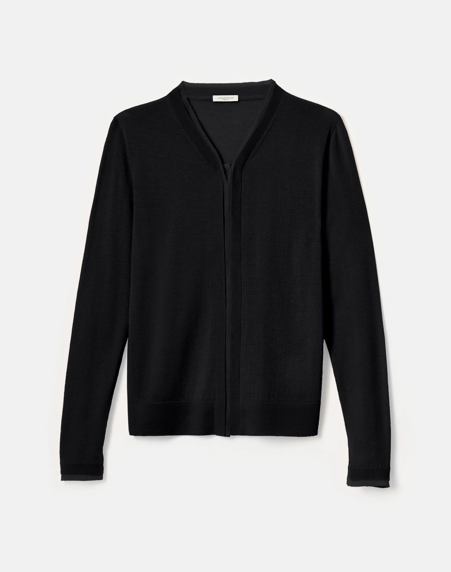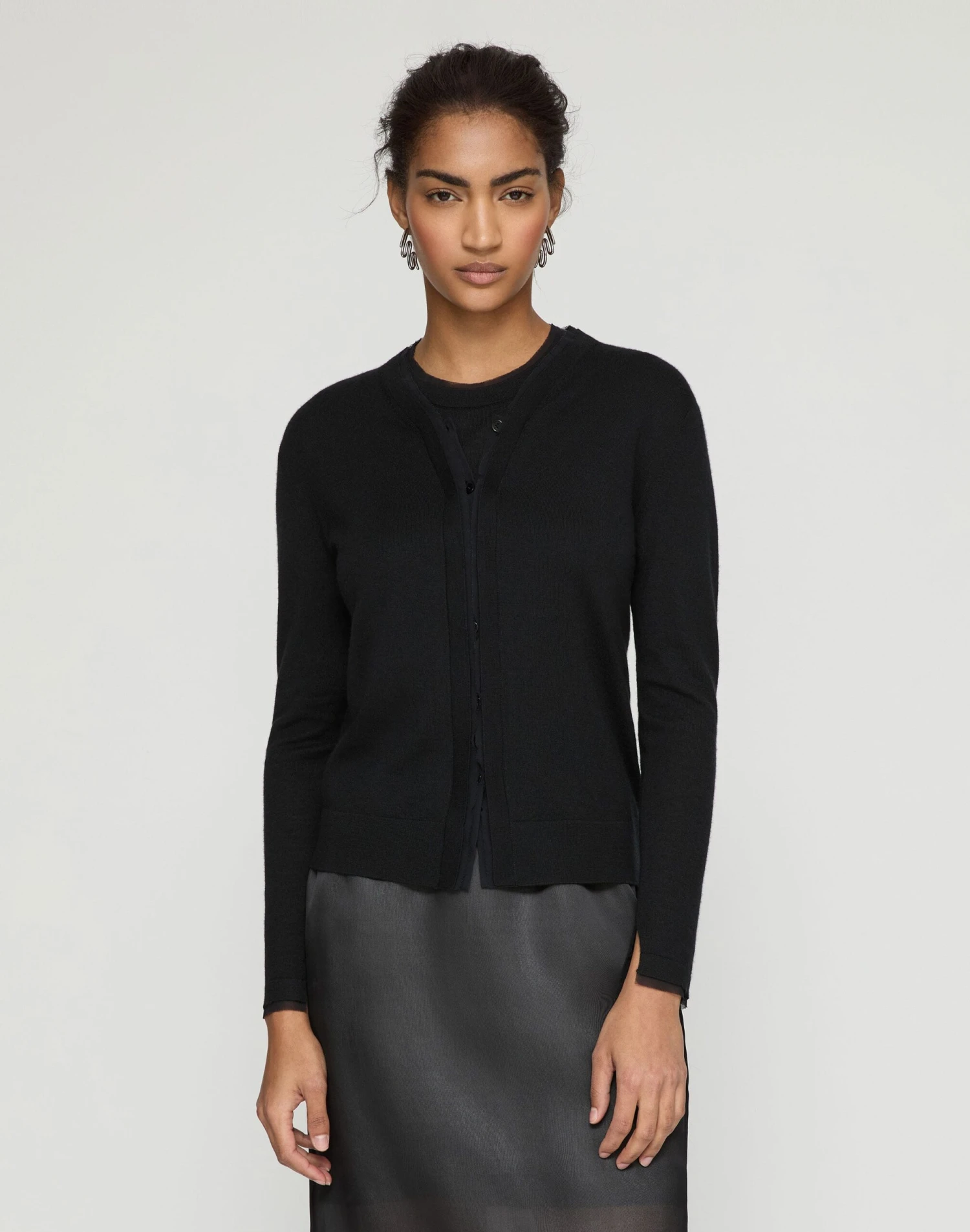 Exceptionally soft and ultra-light in fine gauge cashmere, this feminine V-neck cardigan is rendered in delicate contrast with silk chiffon trim the extends the neckline, placket and cuff. It’s designed for a slim fit with long slender sleeves and tonal buttons fastened at the front. Layer with the matching sweater for an elevated twinset.