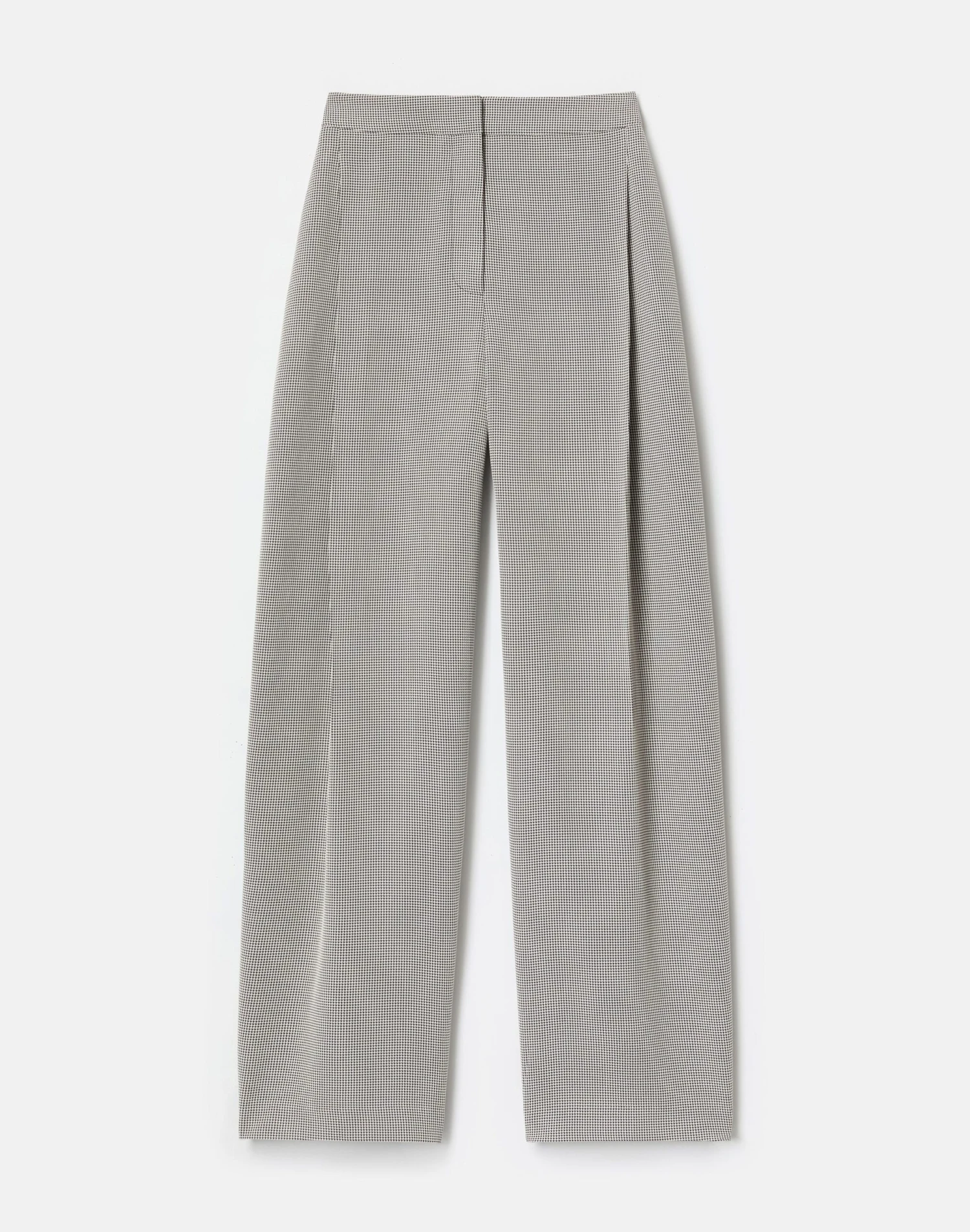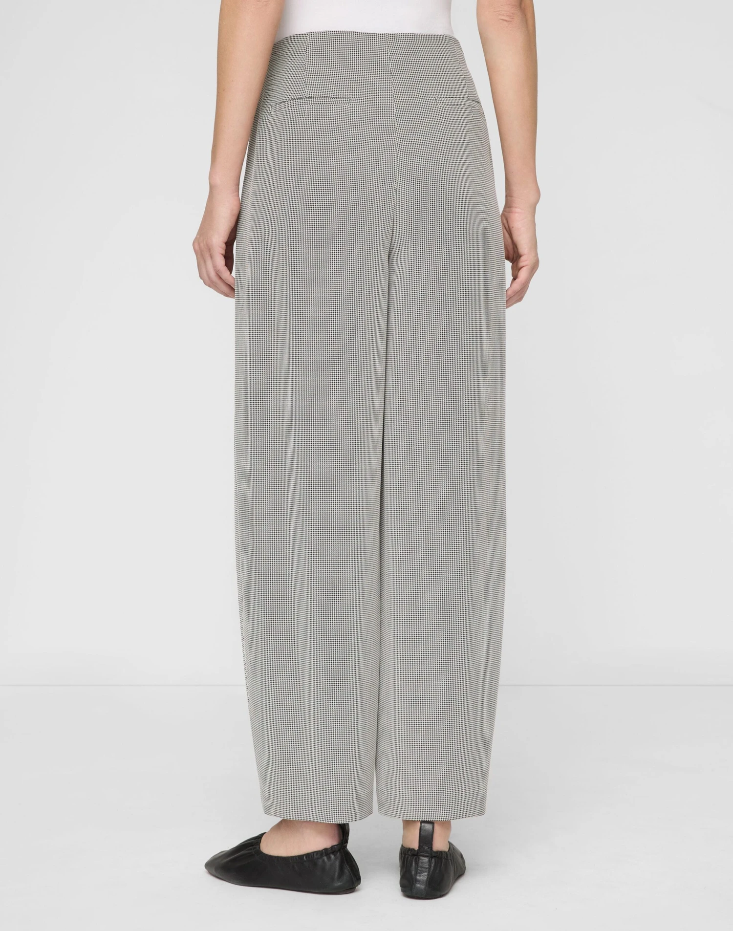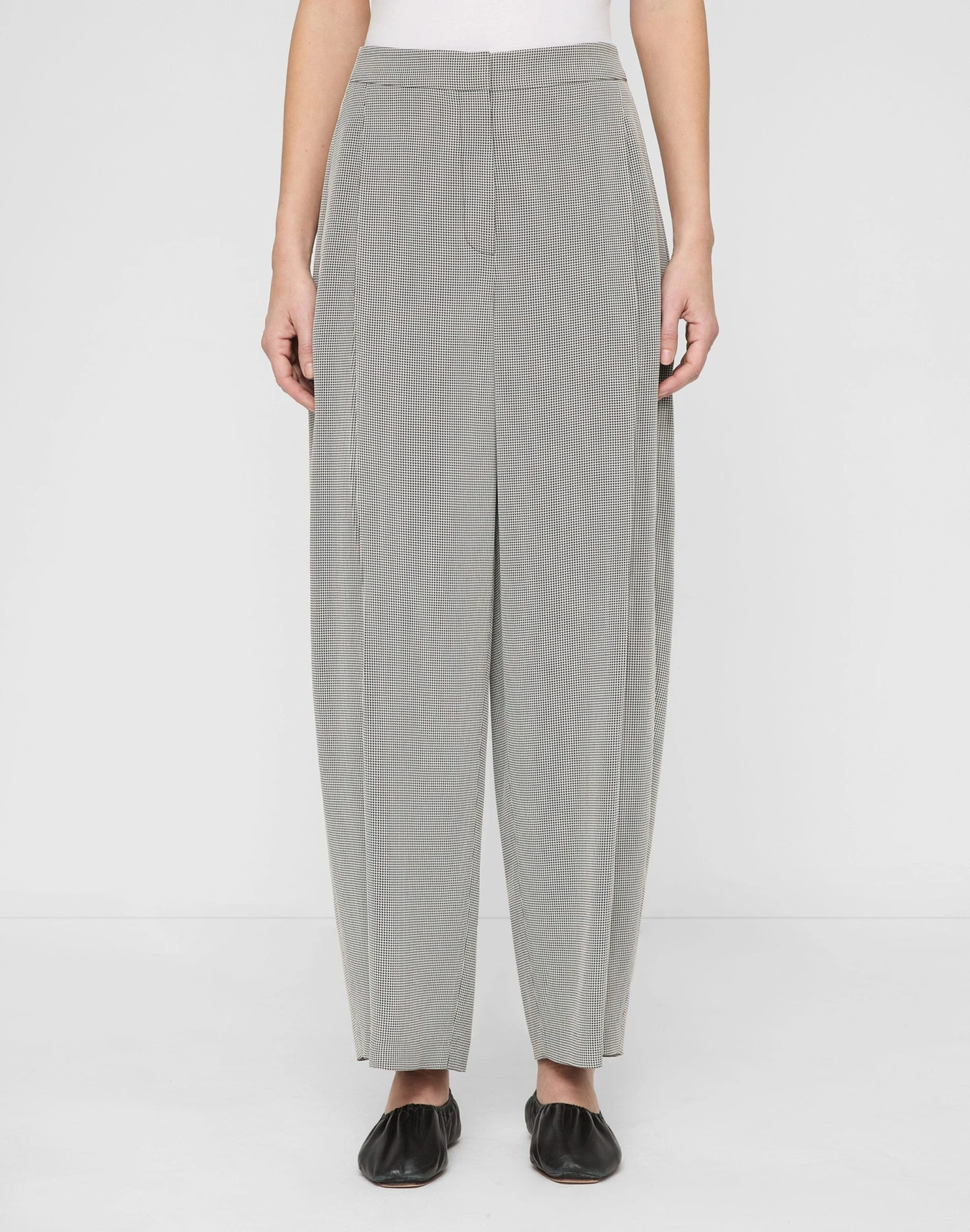 The mid-rise Cooper pant sits just below the natural waist, with front pleats and a full barrel leg that finishes at the ankle. It’s tailored from Italian houndstooth jacquard, with a smooth hand and fluid drape.