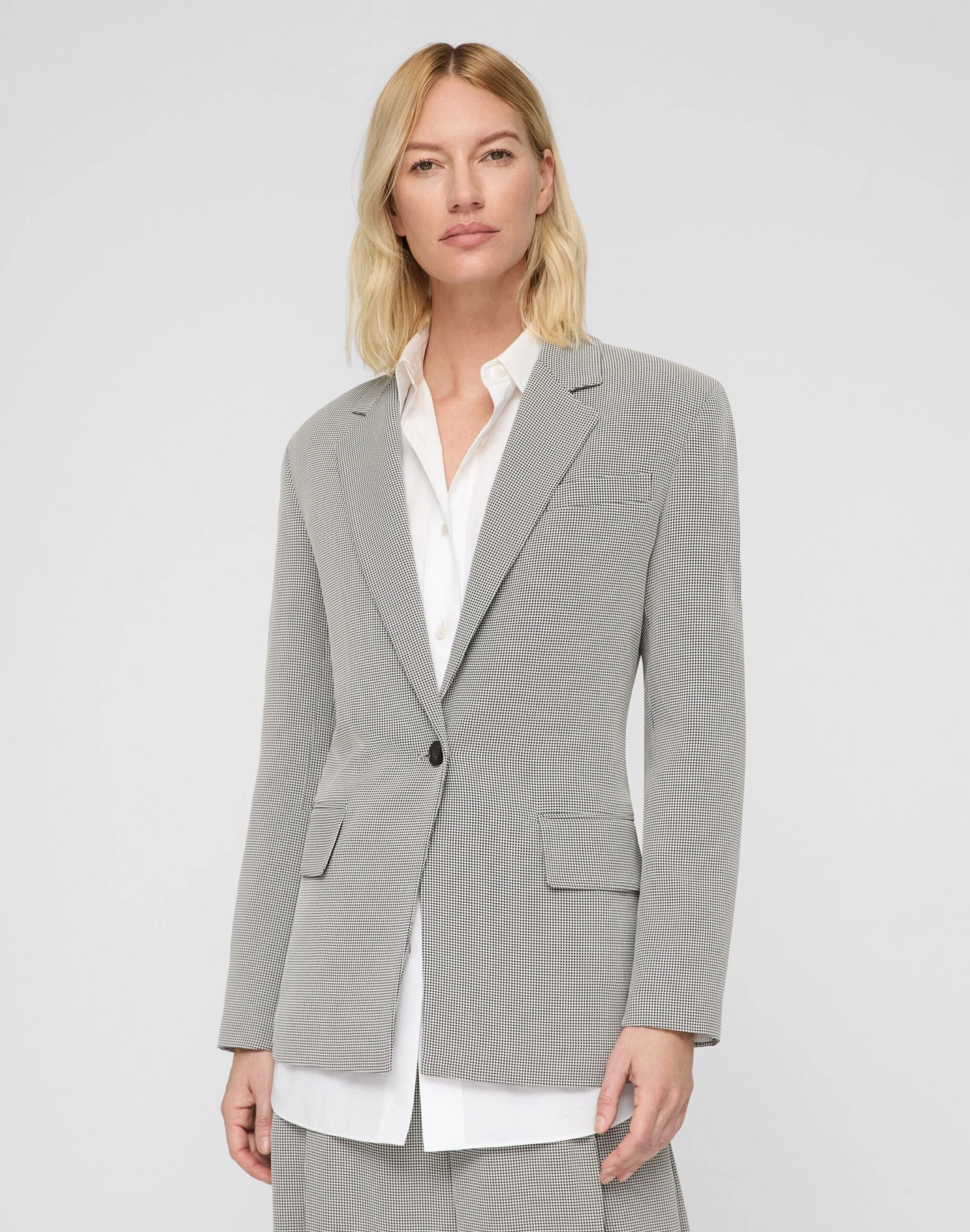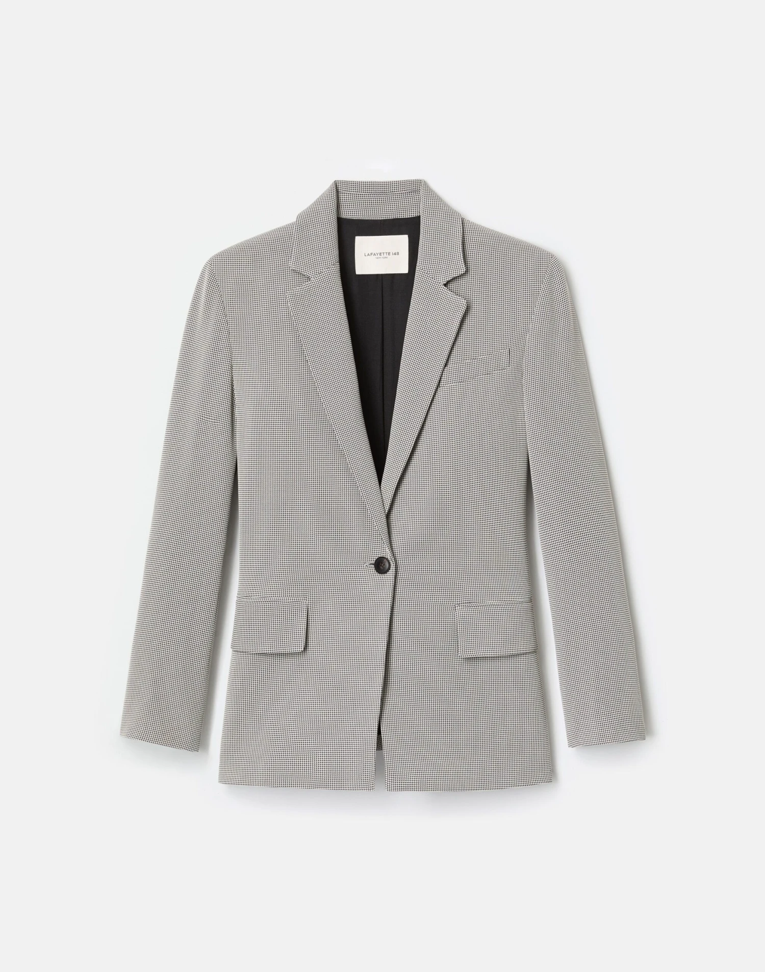 Traditional menswear tailoring is transformed in this single-button blazer, crafted from lightweight, liquid-like Italian houndstooth jacquard with fluid drape. Its fitted design is framed by lightly structured drop shoulders and finished with a chest welt and flap pockets at the hips.