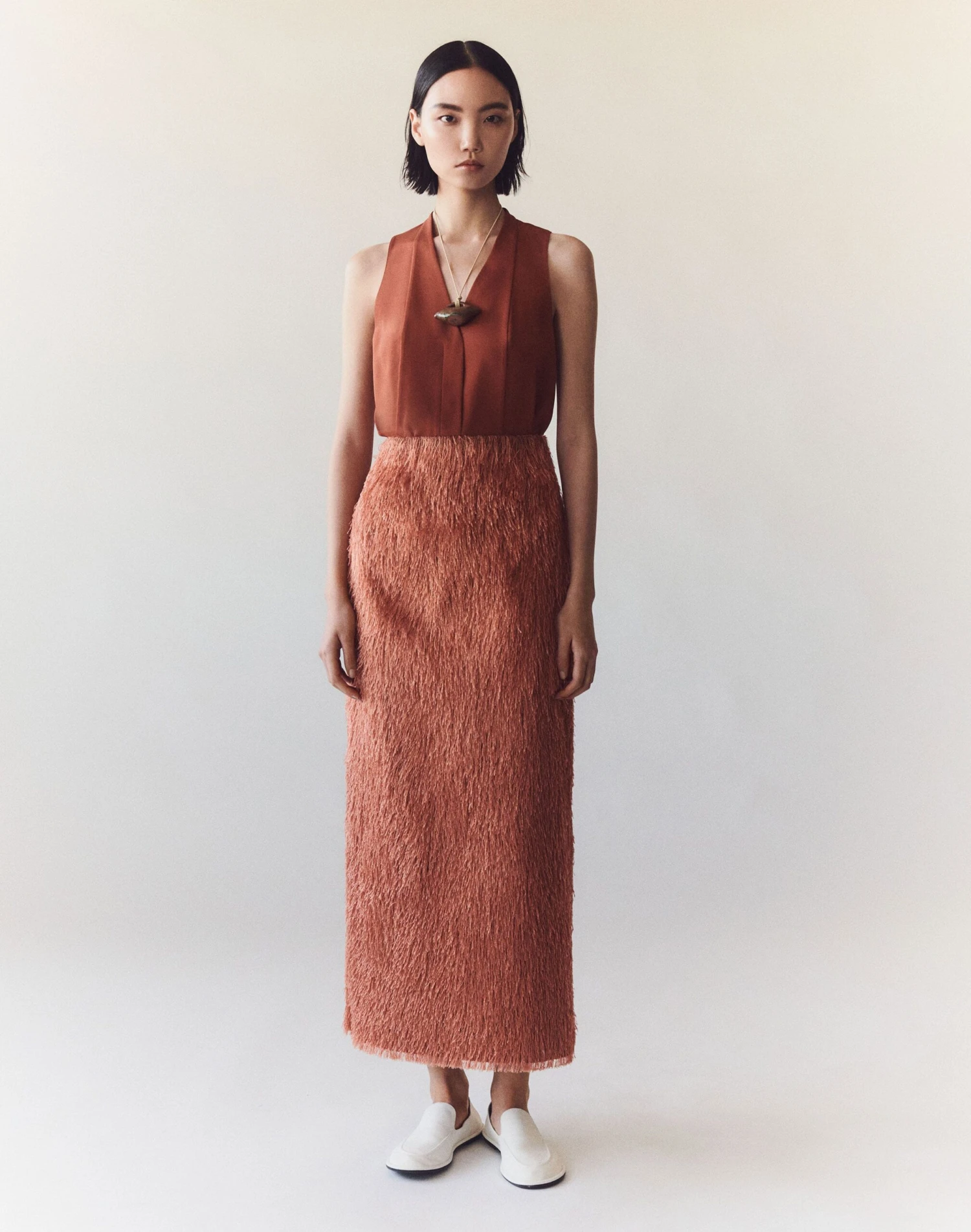 Fur-like eyelash fringe jacquard is light and lustrous, crafted from a masterful Italian mill. Its unexpected dimension animates this straight-cut maxi skirt, shaped to the natural waist with a slit at the back.