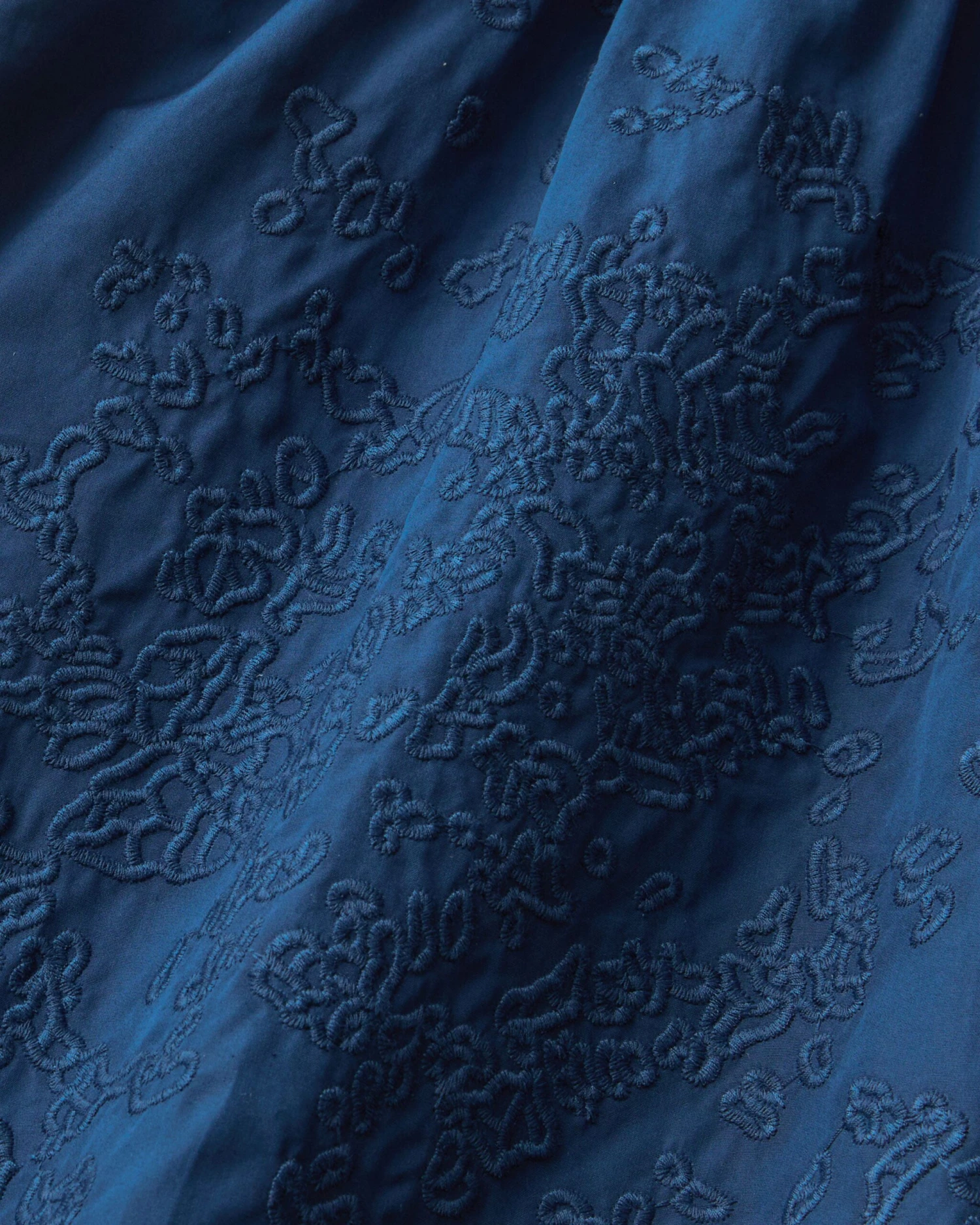 Hand-cutouts and textural embroidery interpret Pre-Fall 2025’s ceramic-inspired artwork on this A-line midi skirt. Lightly structured in organic cotton poplin, the gathered high-waist creates soft volume, and pairs with the coordinating cropped shirt.