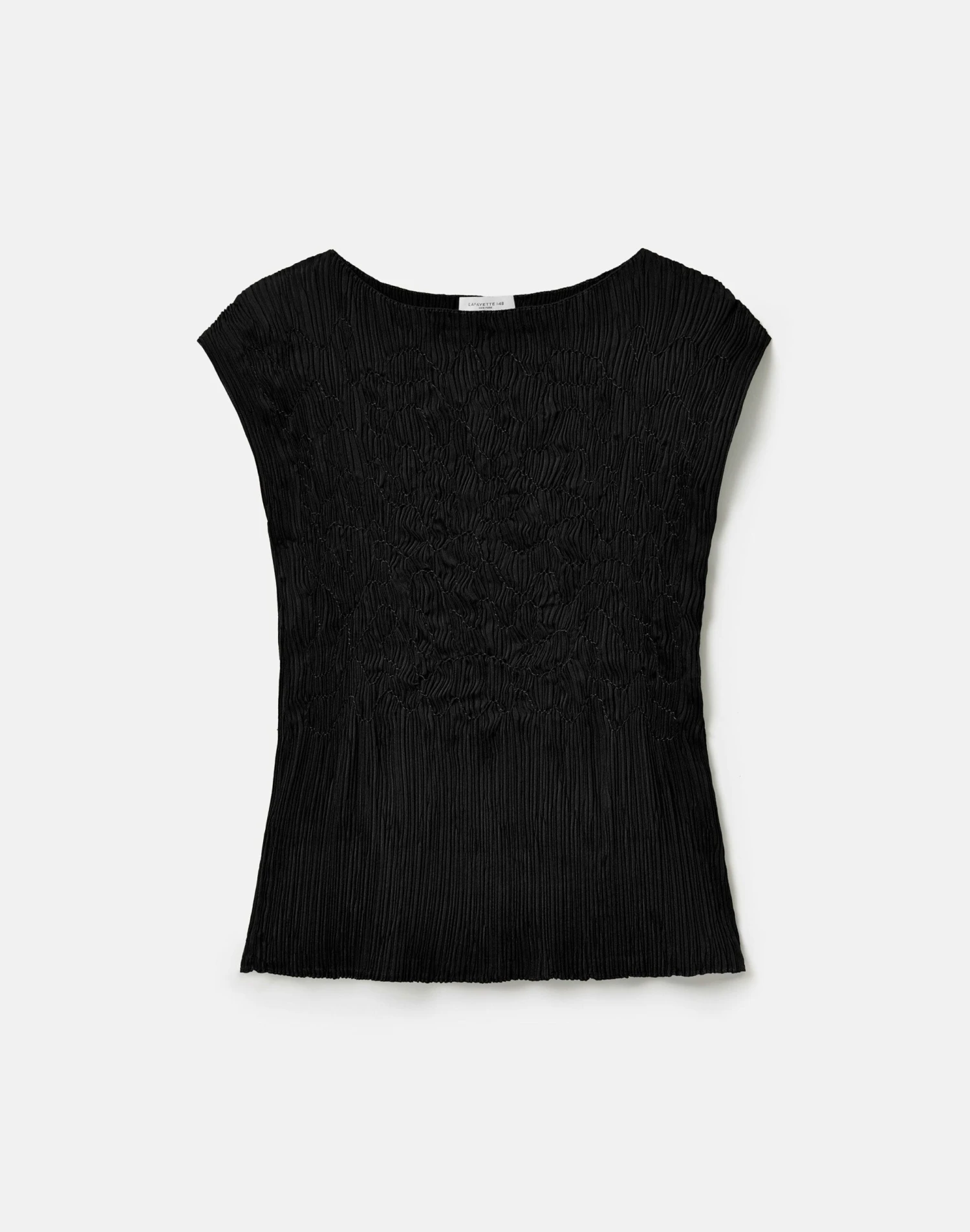Hand-embroidered smocking defines this satin blouse, with each piece individually finished in dimensional plissé. The fitted bodice flows into a soft flared hem, framed by a bateau neckline and cap sleeves.