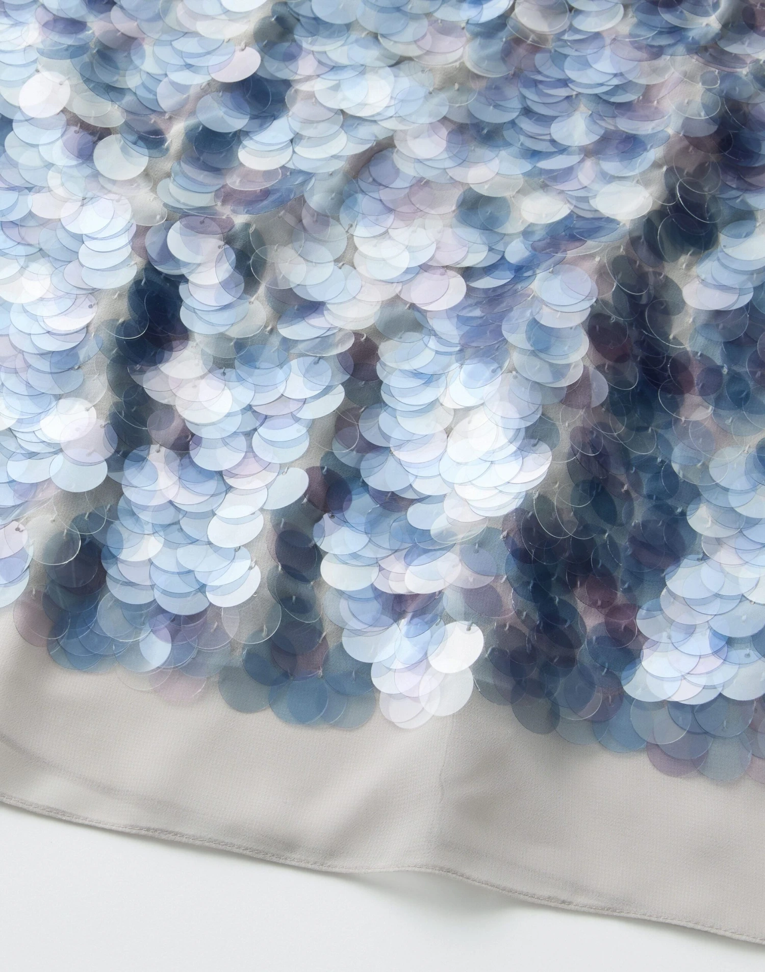 A mélange of hand-placed paillettes reflects the pearlescent ceramic glazes of Pre-Fall 2025. Hand-embroidered on fluid georgette with a body-skimming drape, the straight-fit skirt flows to a calf-length hem.