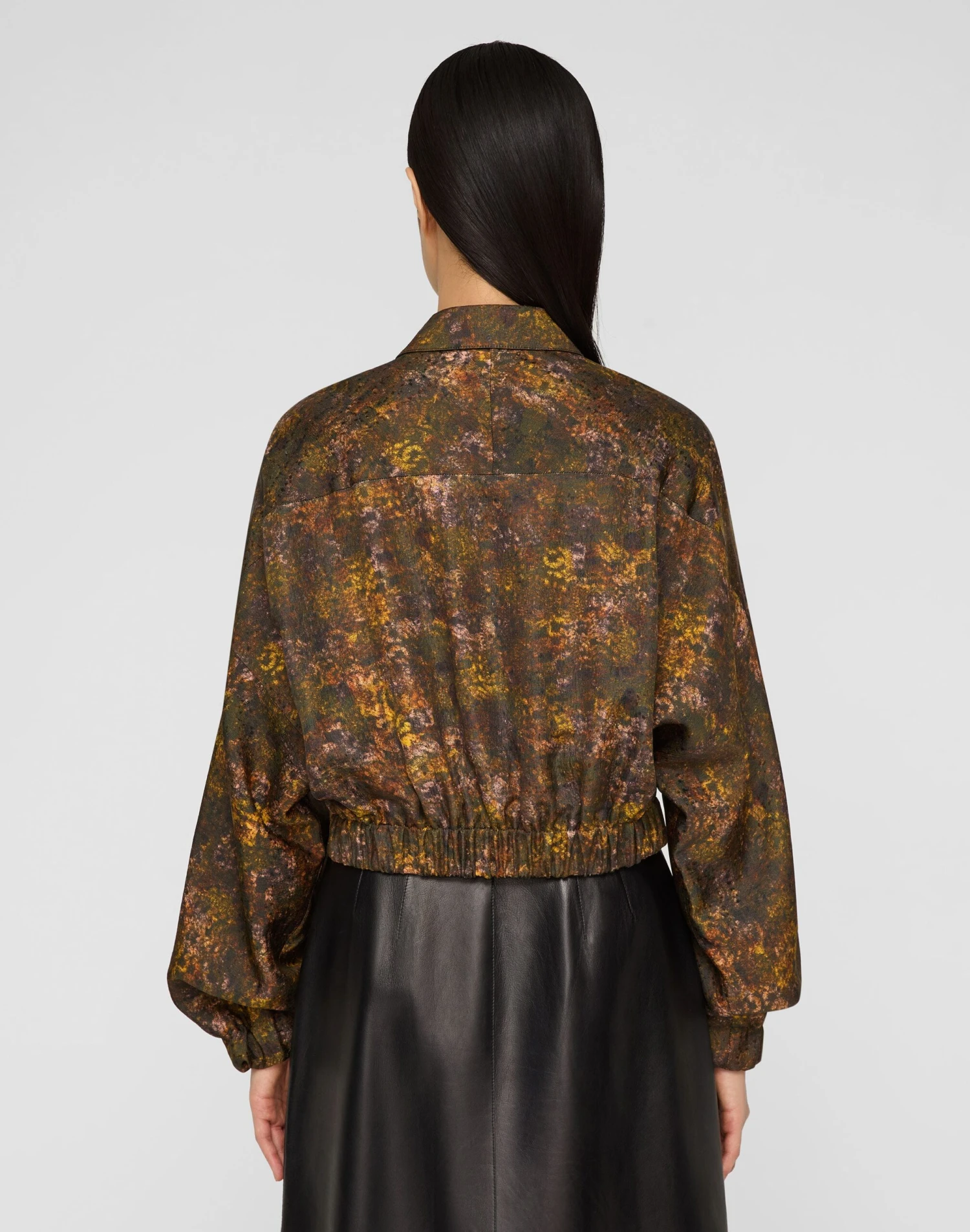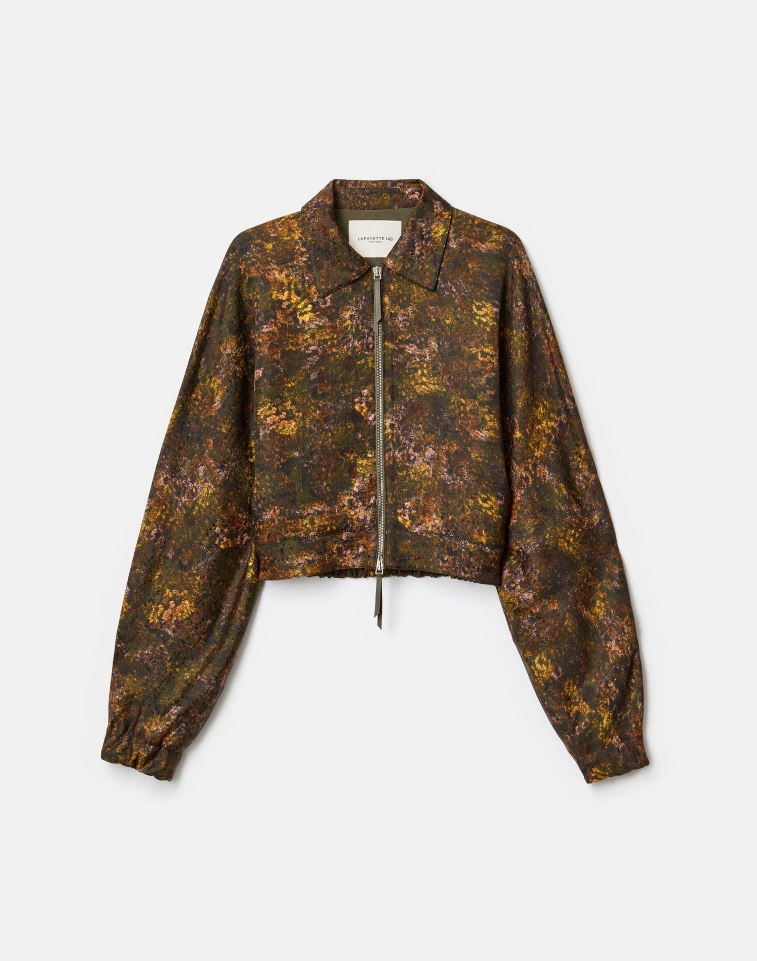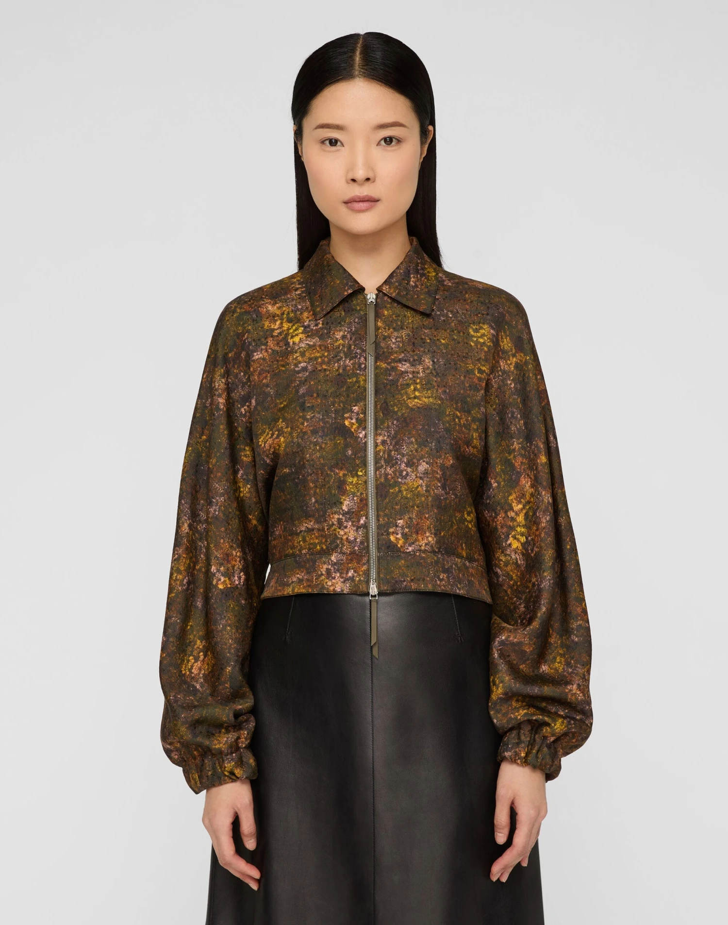 This collared bomber jacket features dolman sleeves and gathered trim, finished with a leather-tipped, two-way zipper. It’s printed in Fall 2025’s Impression motif on semi-lustrous silk-wool jacquard.