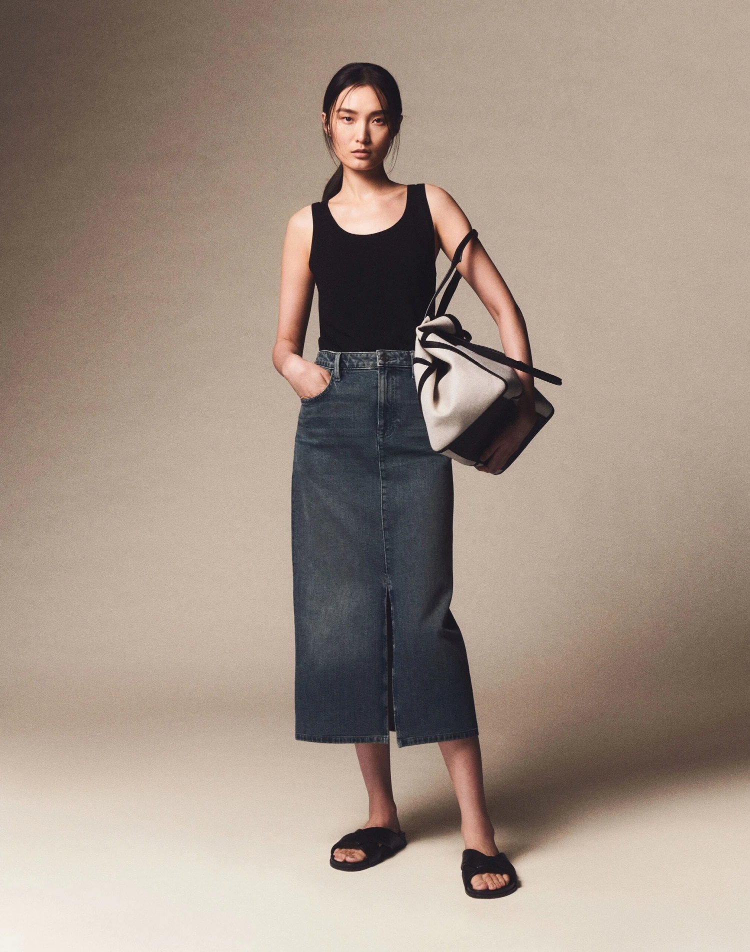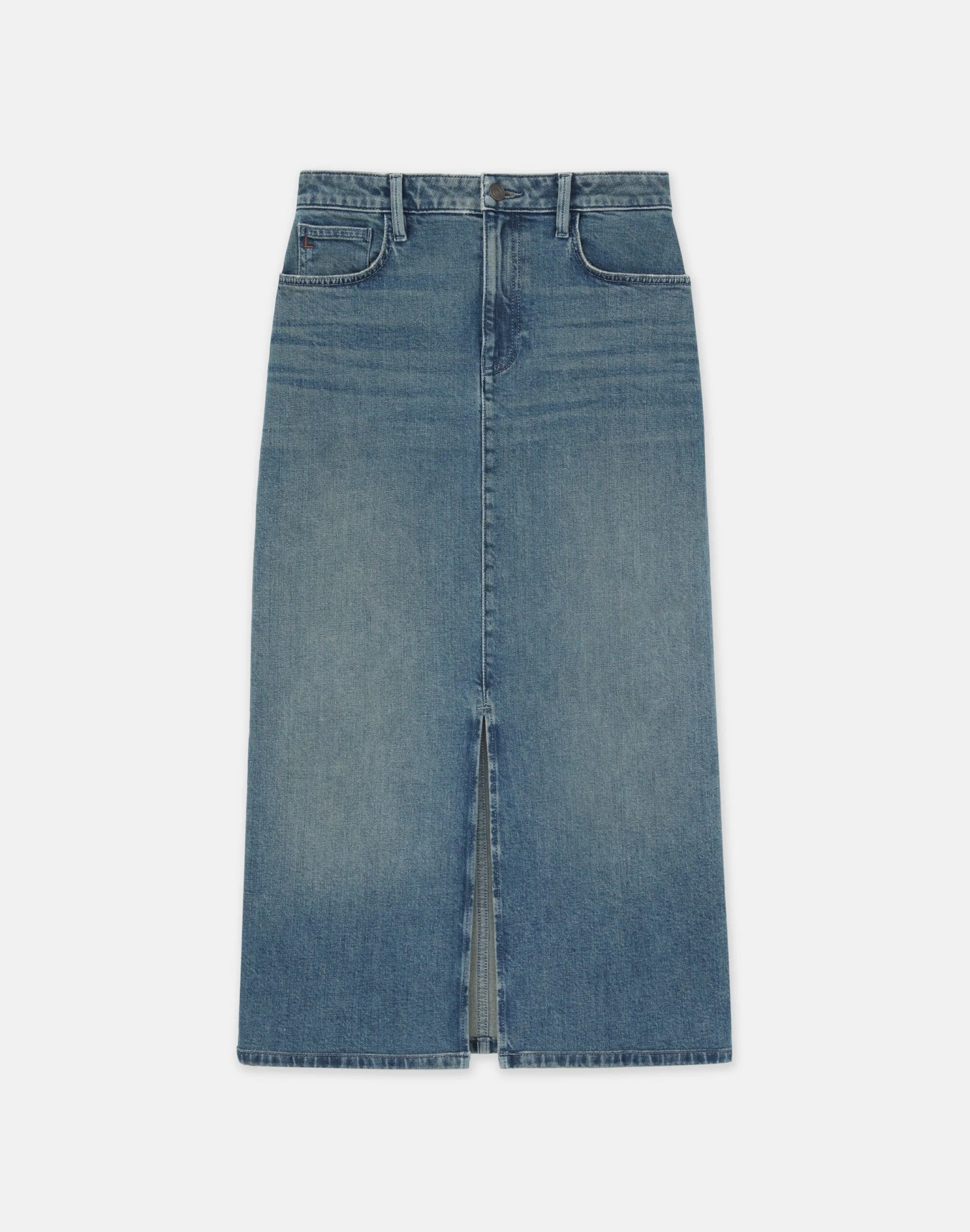 This impeccably tailored, straight-cut denim midi skirt is offset by a high center slit and features traditional jean styling: 5-pocket design, contrast topstitching and L148 branded hardware. It’s expertly crafted in the USA from the House’s soft yet structured, Italian cotton denim sourced from a celebrated, sustainably-minded mill.