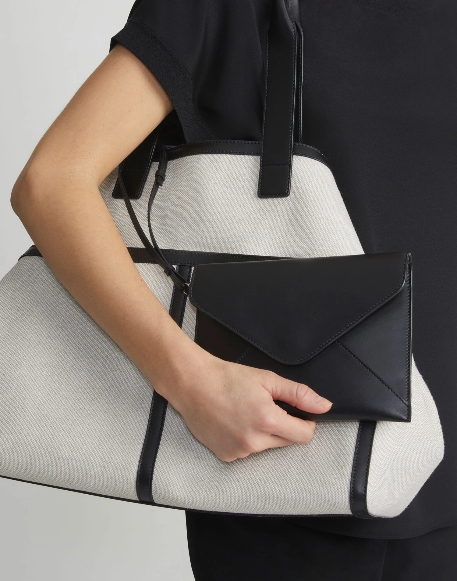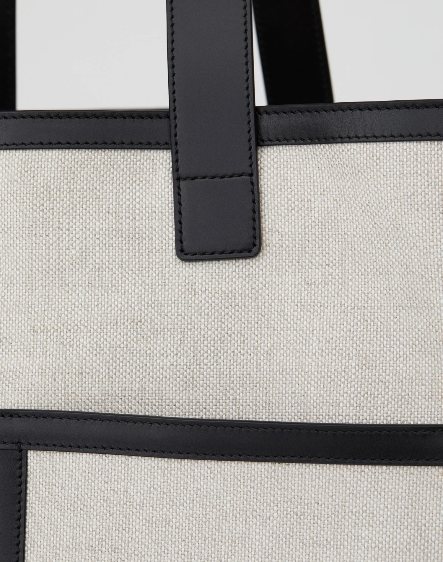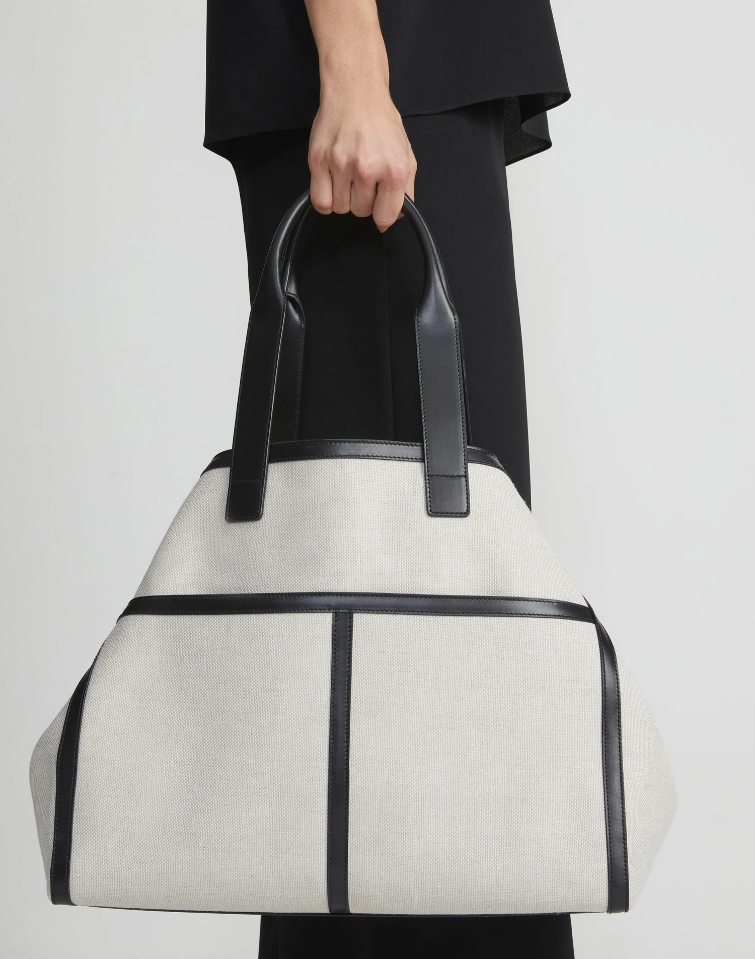 Inspired by traditional utilitarian gardening bags, the House’s oversized L Tote is remastered for Spring 2024 with luxurious vachetta-trimmed patch pockets in naturally tactile Italian linen-hemp. The interior hook closure transforms the sculptural shape into a compact trapezoid for toting from city to field with a removable envelope wristlet for further versatility.