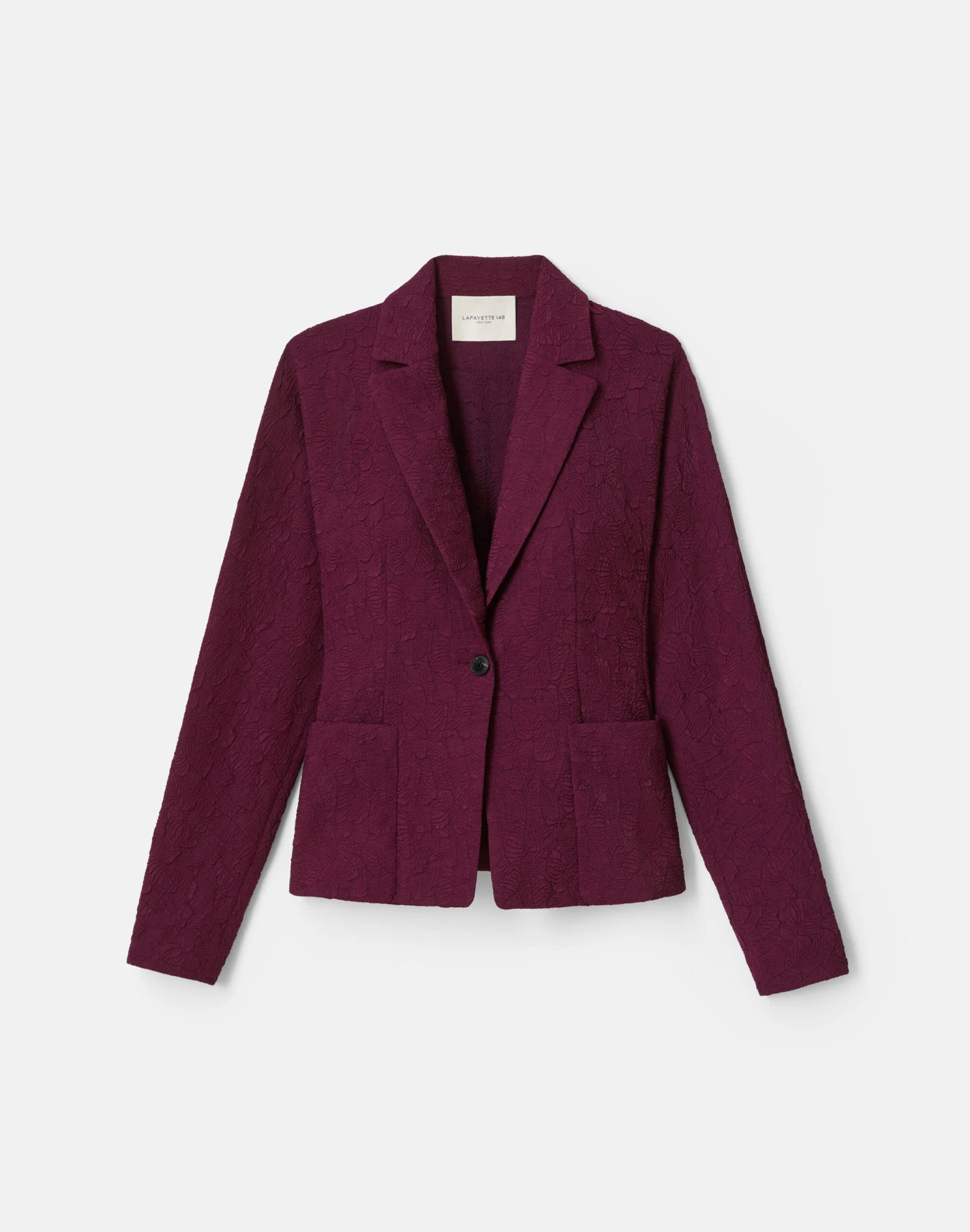 This light, Italian-crafted matelassé jacquard features a dimensional pattern inspired by the ceramic textures of Pre-Fall 2025. The single-button blazer is defined by a sculptural pintucked back that tapers at the waist, creating a soft peplum effect. Pair it with the coordinating midi skirt.