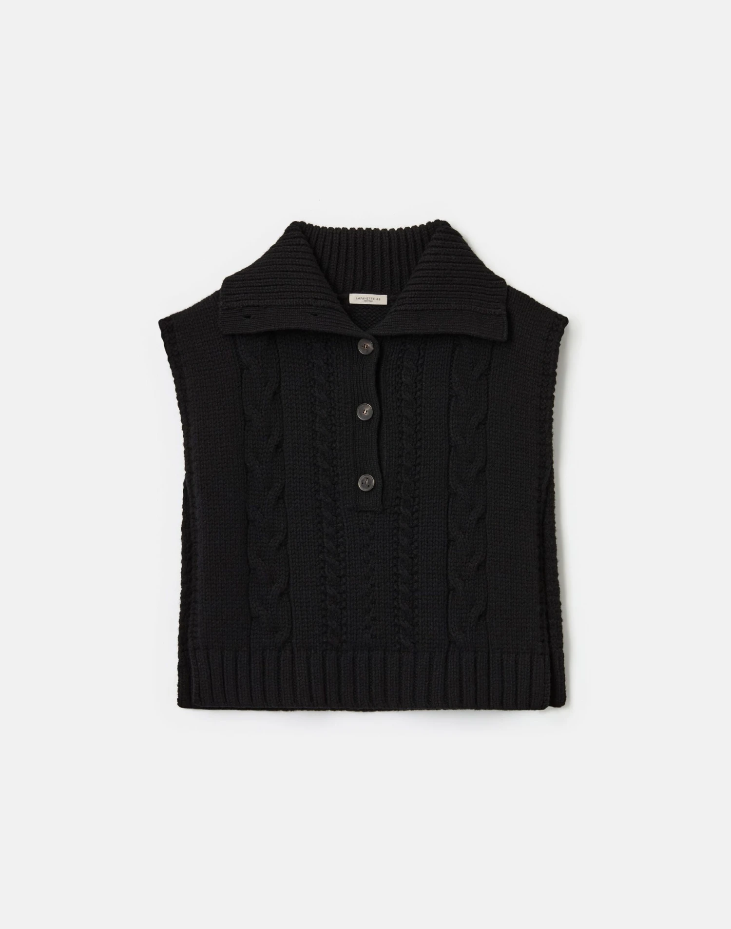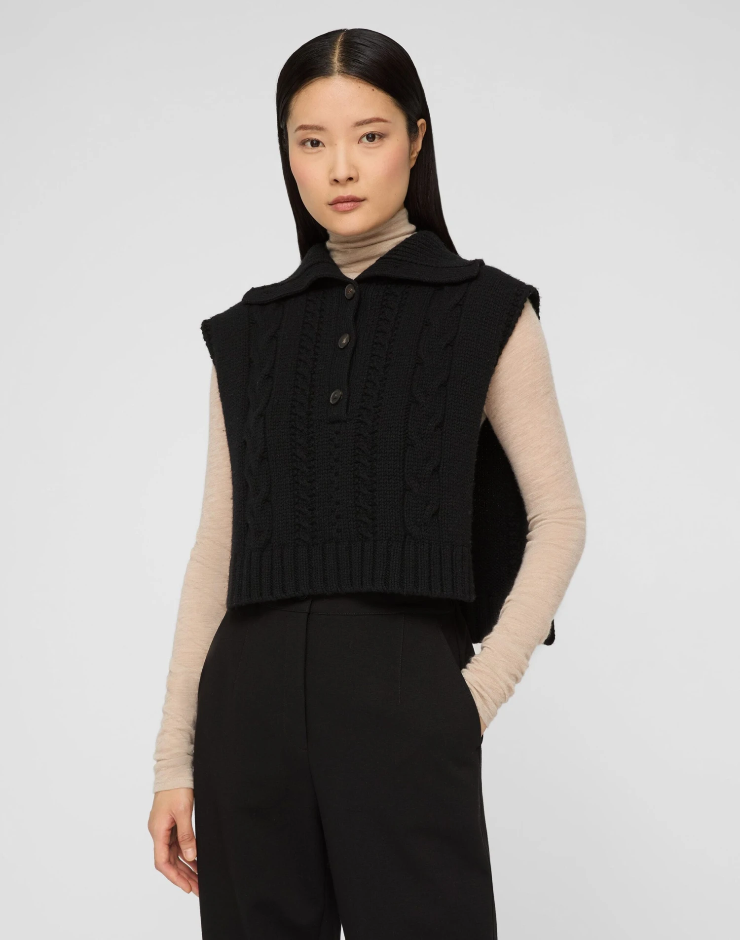 Cable-knit from Italian Merino wool-cashmere yarns, this dickey offers cozy versatility for winter layering under coats and jackets. Open sides slip over the shoulders, while a polo collar buttons into a turtleneck.