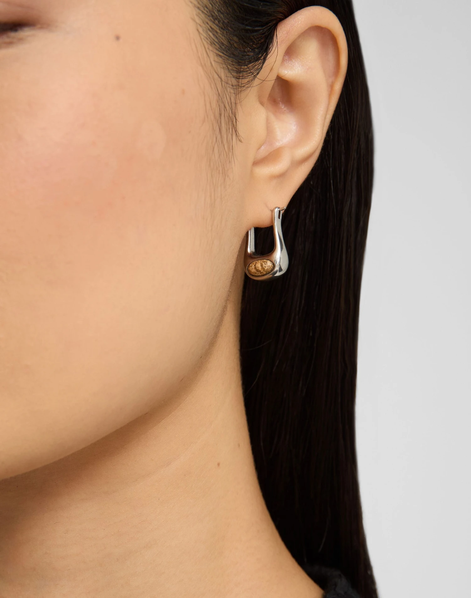 Handcrafted in Italy and inspired by Modernist design, these sculptural curved hoop earrings are inlaid with jasper stone—each one of a kind, with natural variations in color and pattern. A hinged latch closure secures at the back.
