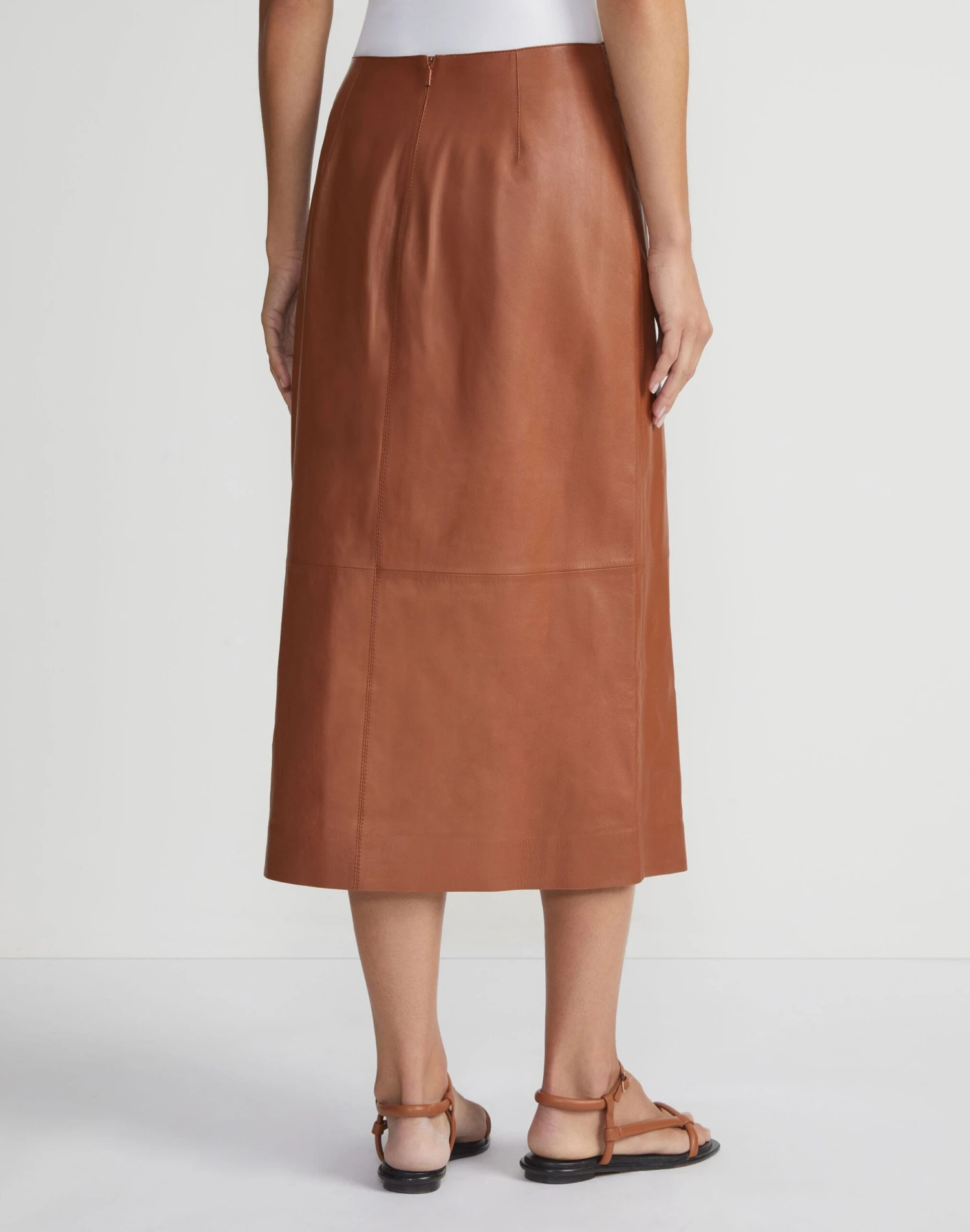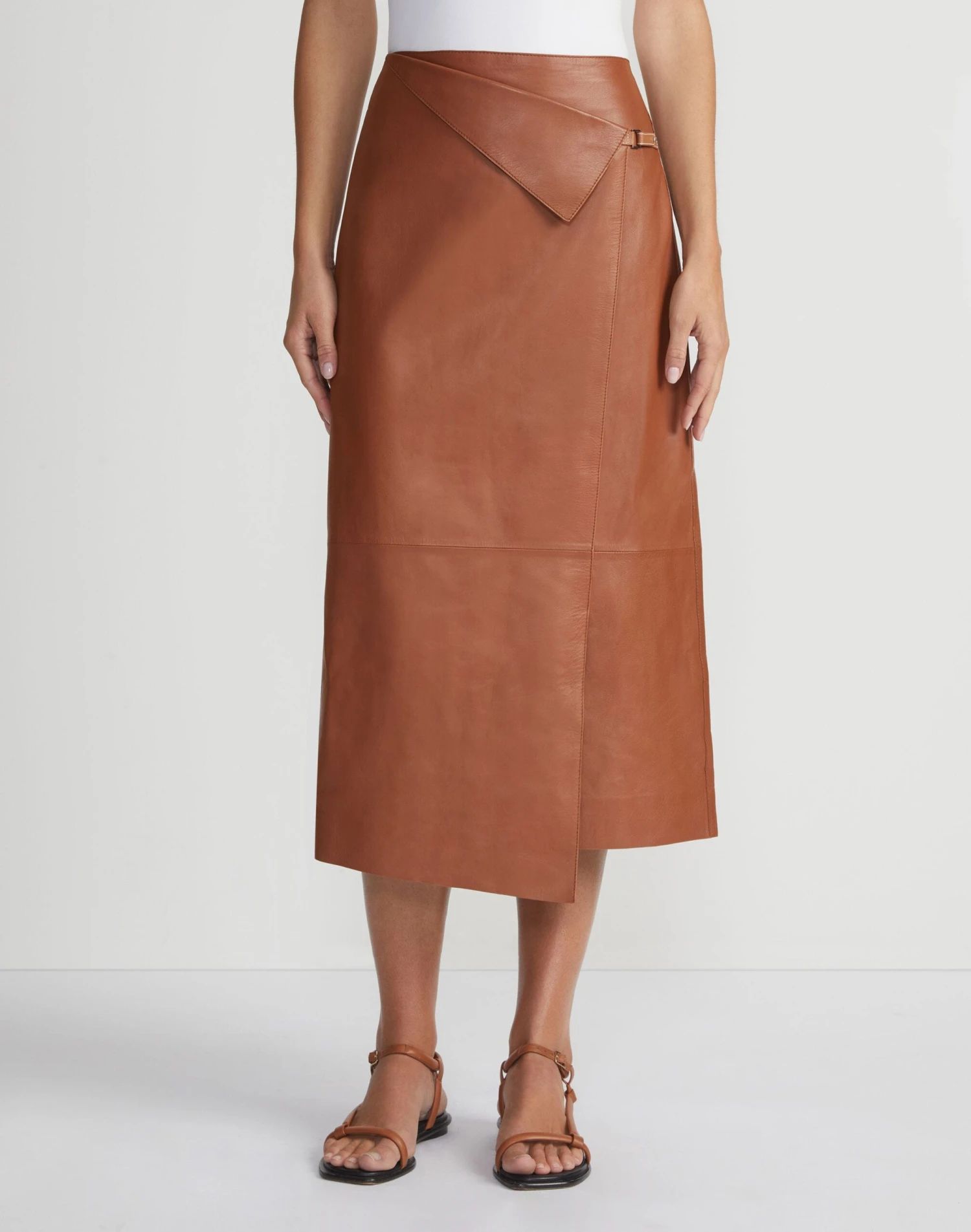 The finest, ultra-soft Italian nappa lambskin brings timeless luxury to the endlessly versatile midi skirt. Tailored to the waist with contouring darts, the skirt flows into an A-line cut that grazes the calf, featuring an asymmetric paneled design with a tab closure that merges understated design with utilitarian style.