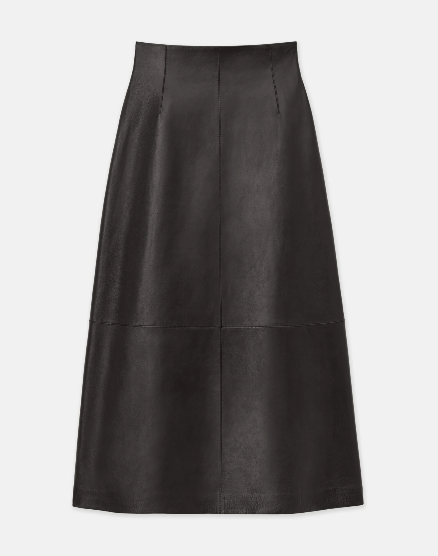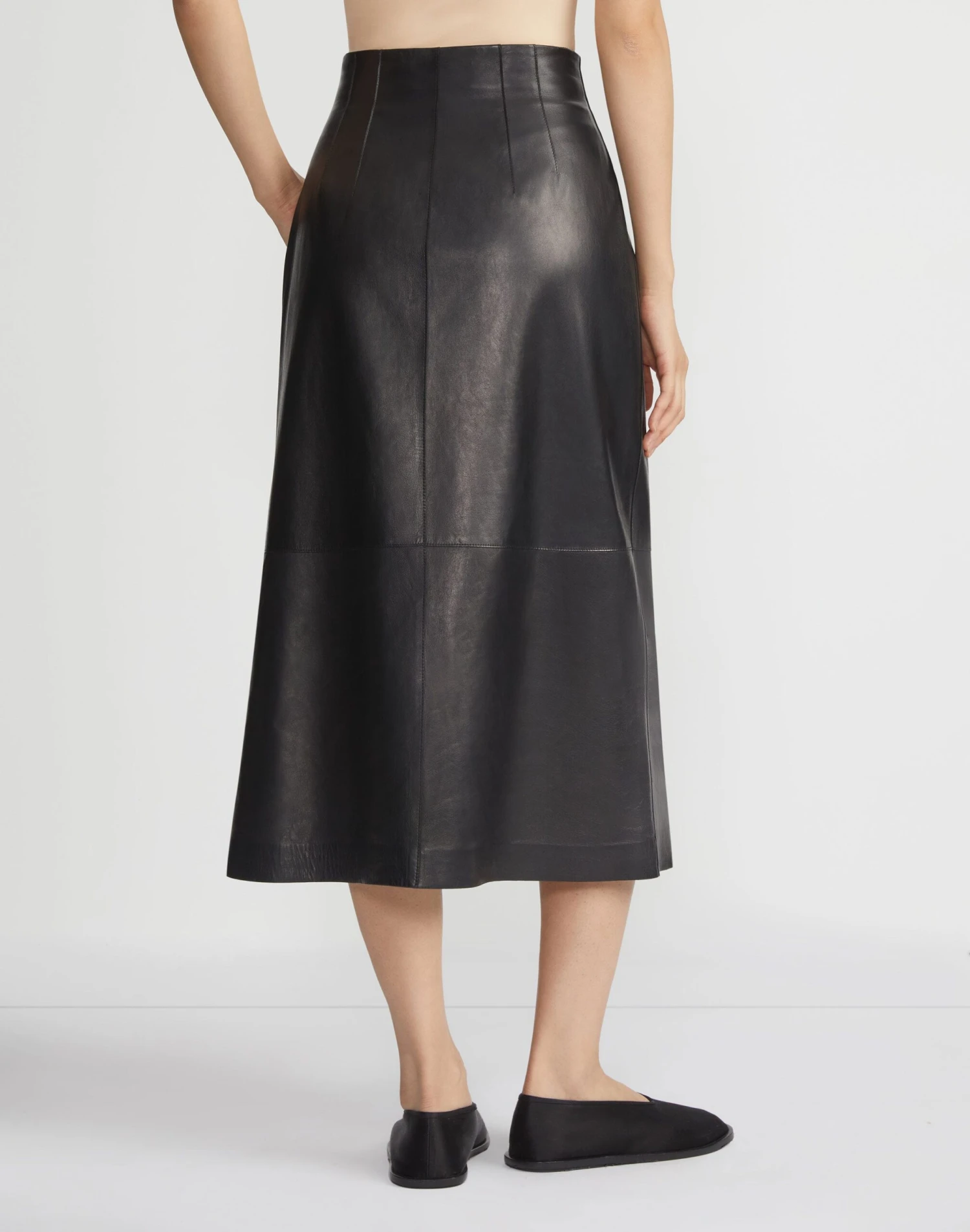 This high-waisted leather skirt is expertly crafted from the finest Italian nappa lambskin, with a supple hand and lightweight feel and finished with hand-painted raw edges and topstitched cutlines. A concealed side zip and detailed darting define the waist in a sculpting A-line design that extends to calf length with a vented back hem.