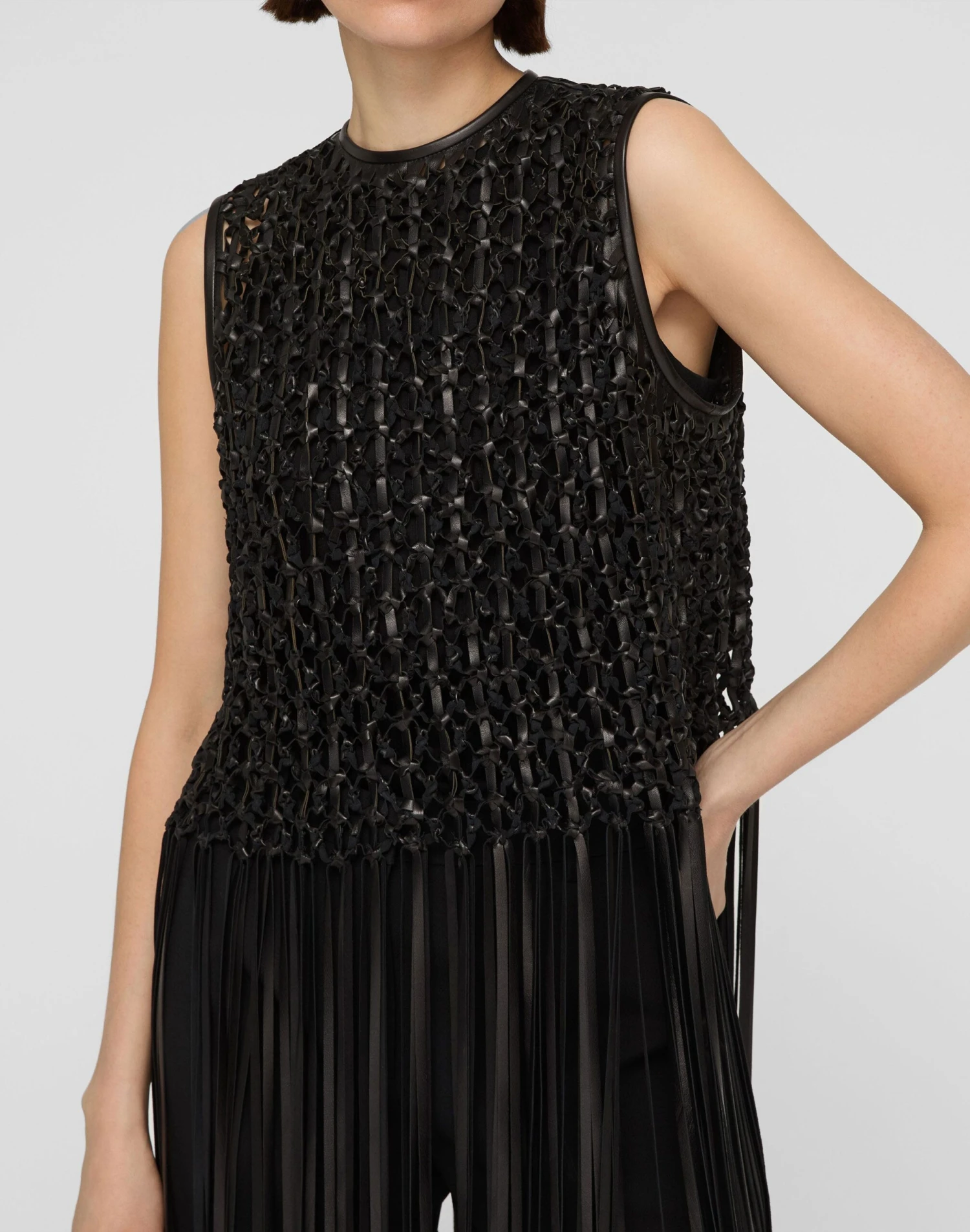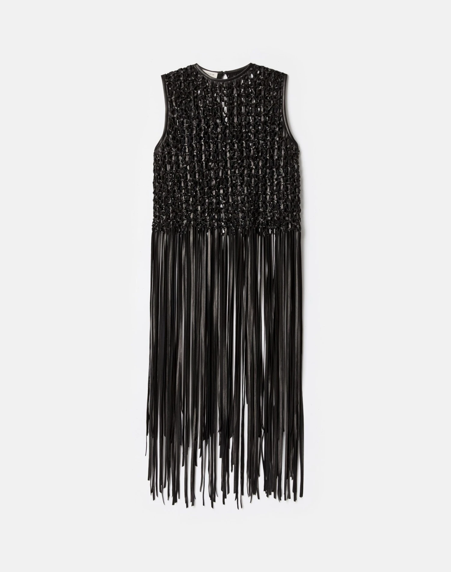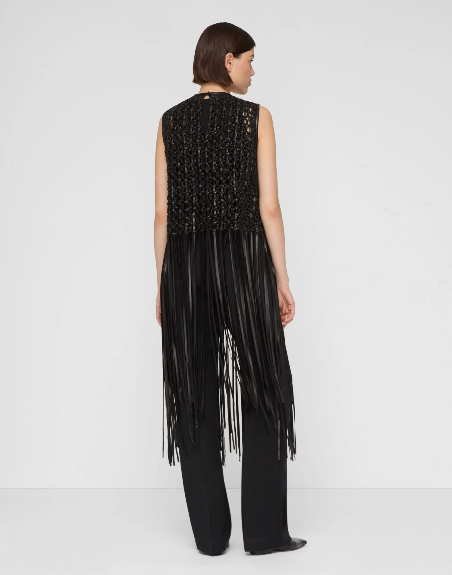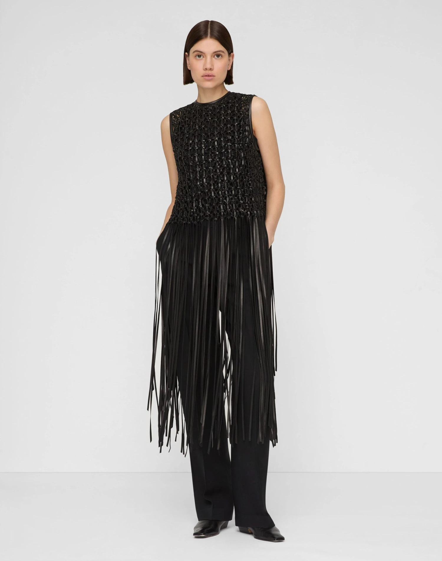This Italian nappa lambskin blouse showcases the artisanal craftsmanship of the House’s leather atelier, translating the Fall 2025 collection’s handwoven motif into hand-macramé with exaggerated fringing that sweeps across the knee. The intricate openwork design fastens at the nape with a keyhole button.