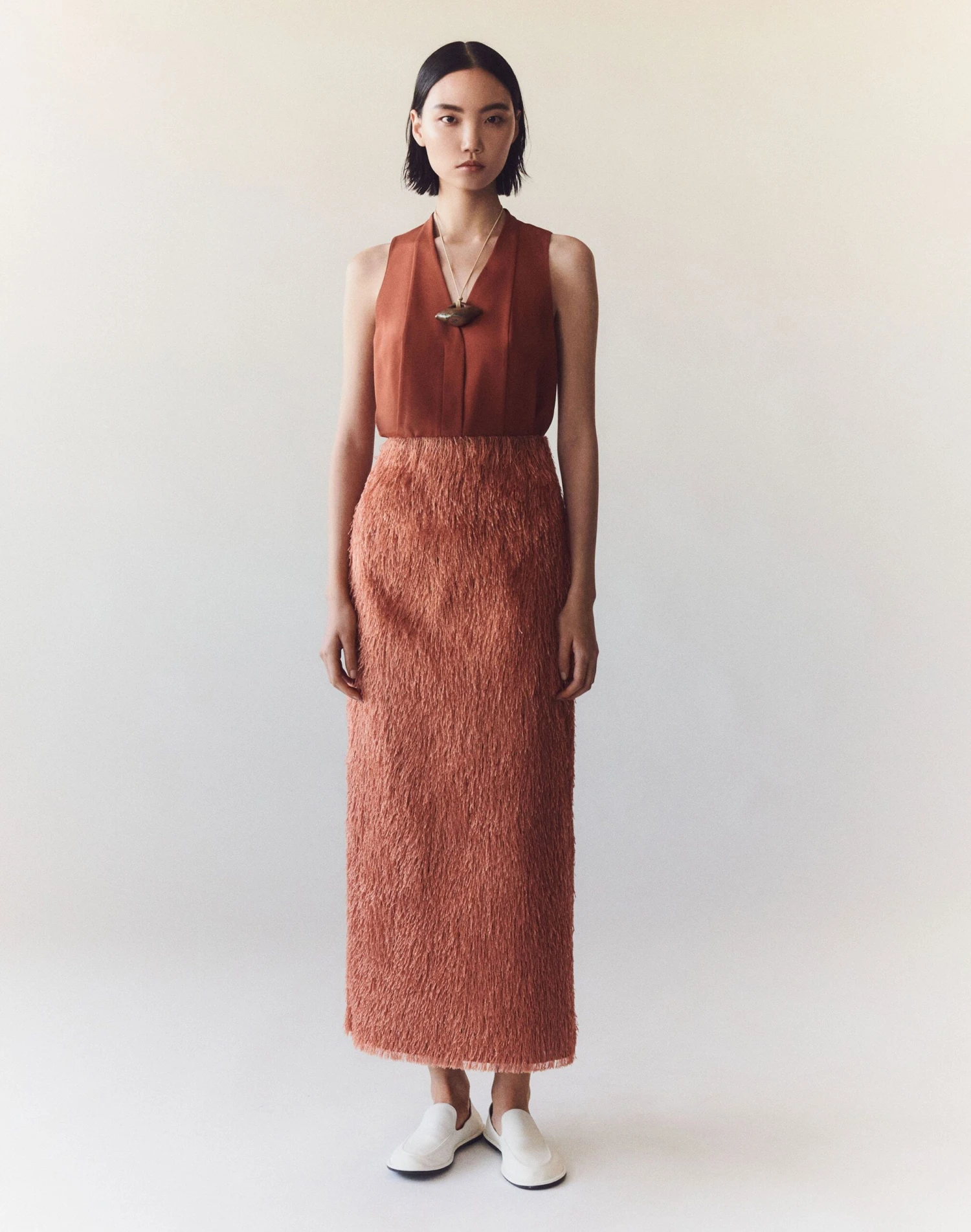 This sleeveless blouse is crafted in cool, lustrous and breathable organic stretch silk, cut in a fluid, slightly flared shape and finished with a V-neckline, concealed button front and split sides.