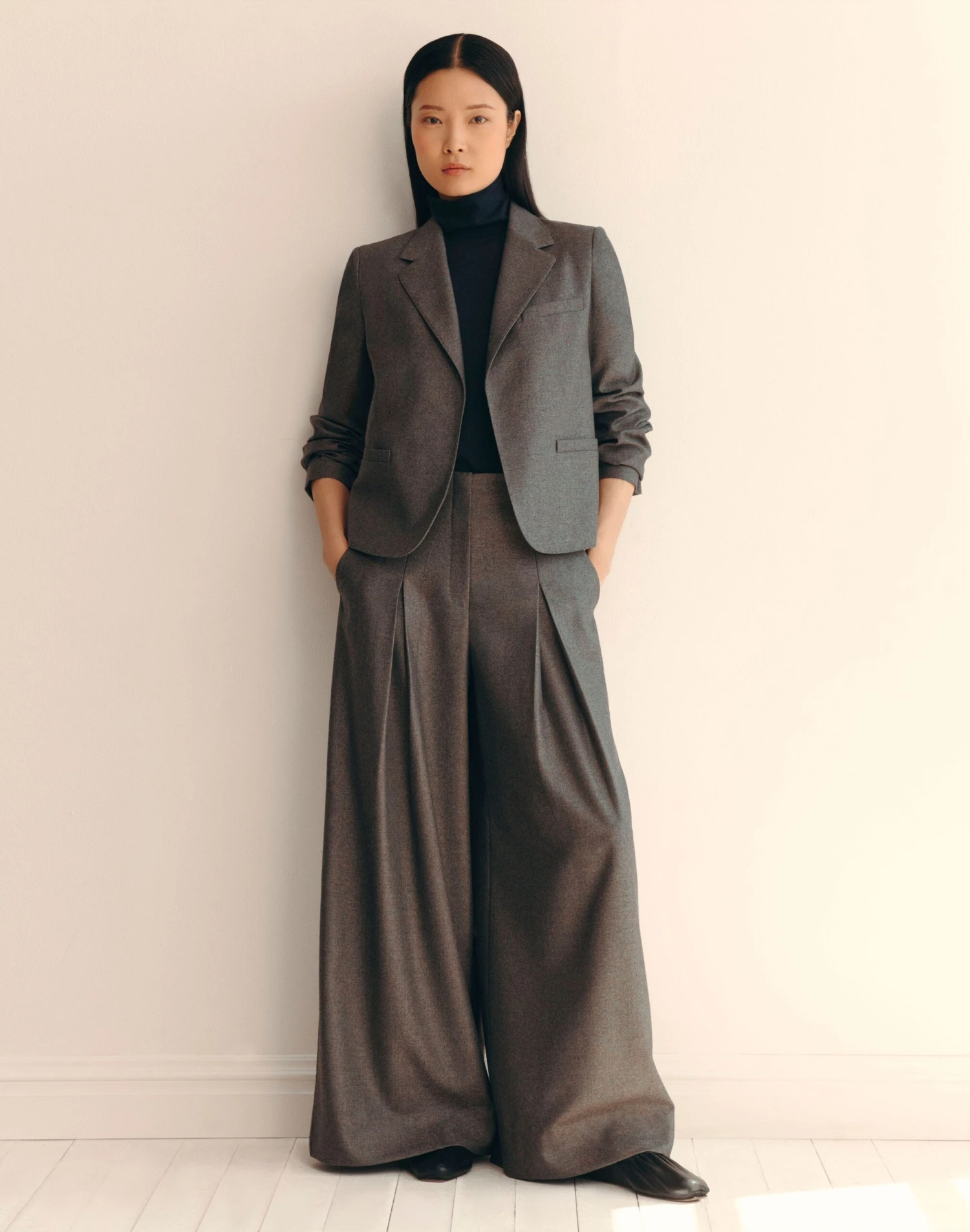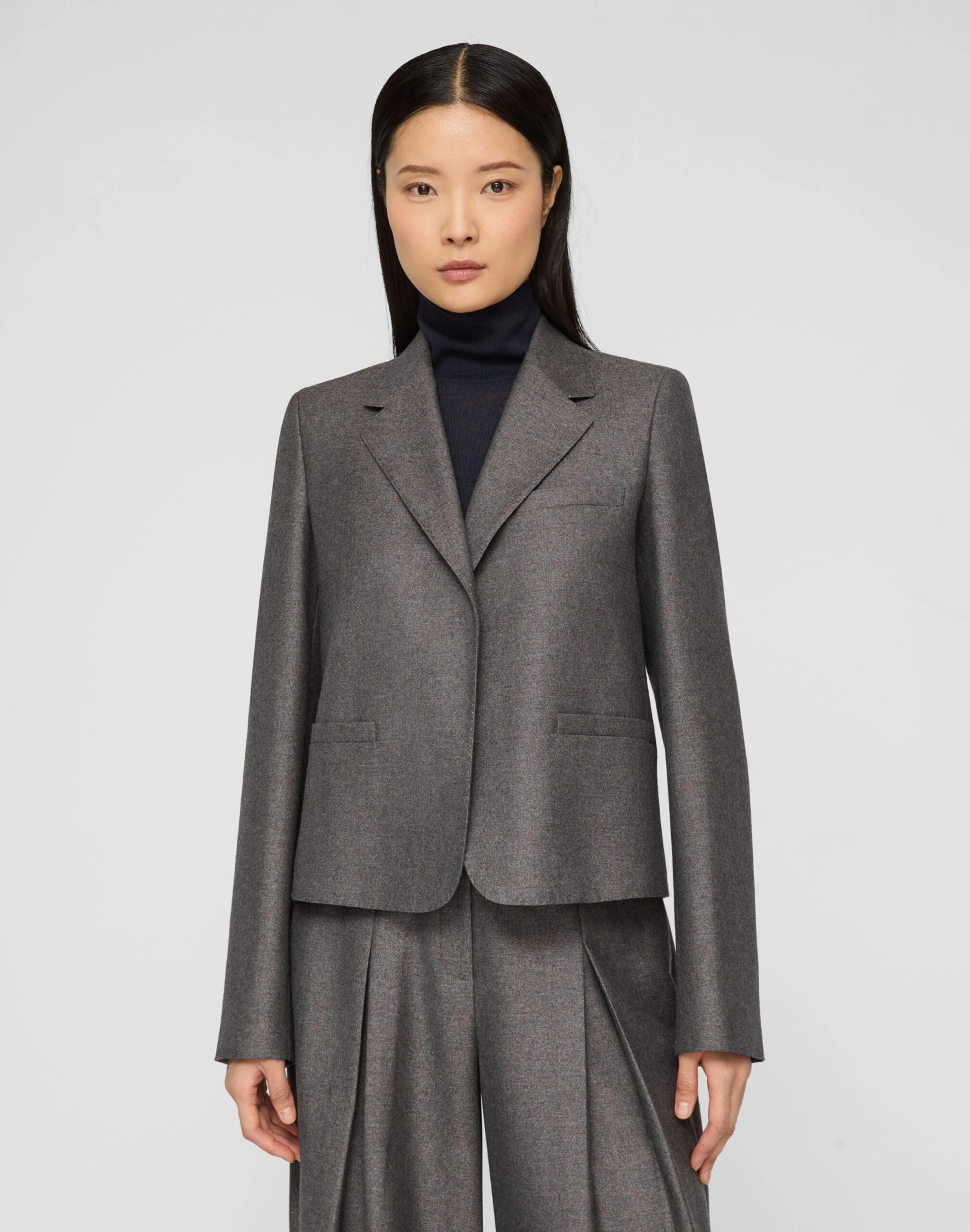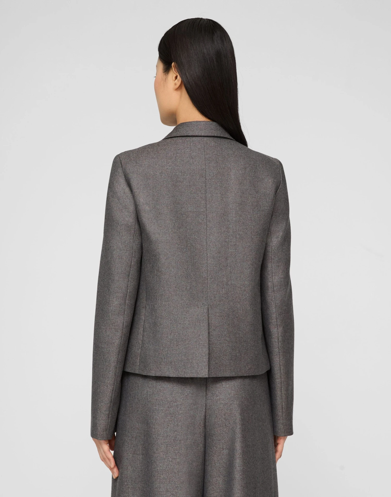 The cropped Boyfriend blazer features a boxy, straight shape, tailored in a pixelated twill weave from fine combed wool yarns, with a subtle iridescent shimmer and soft, smooth hand. The open-front design is traced in pickstitching and finished with a felted undercollar.
