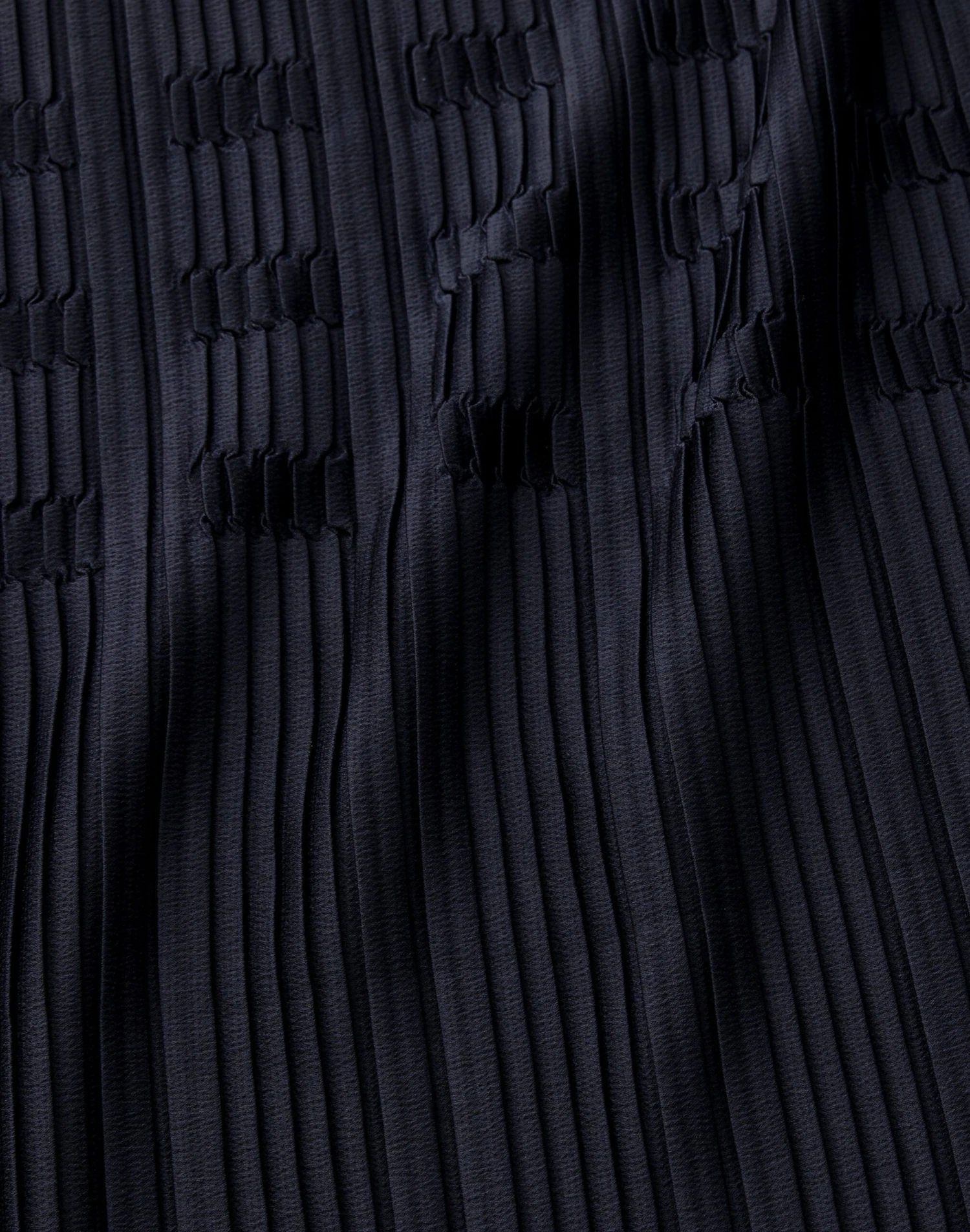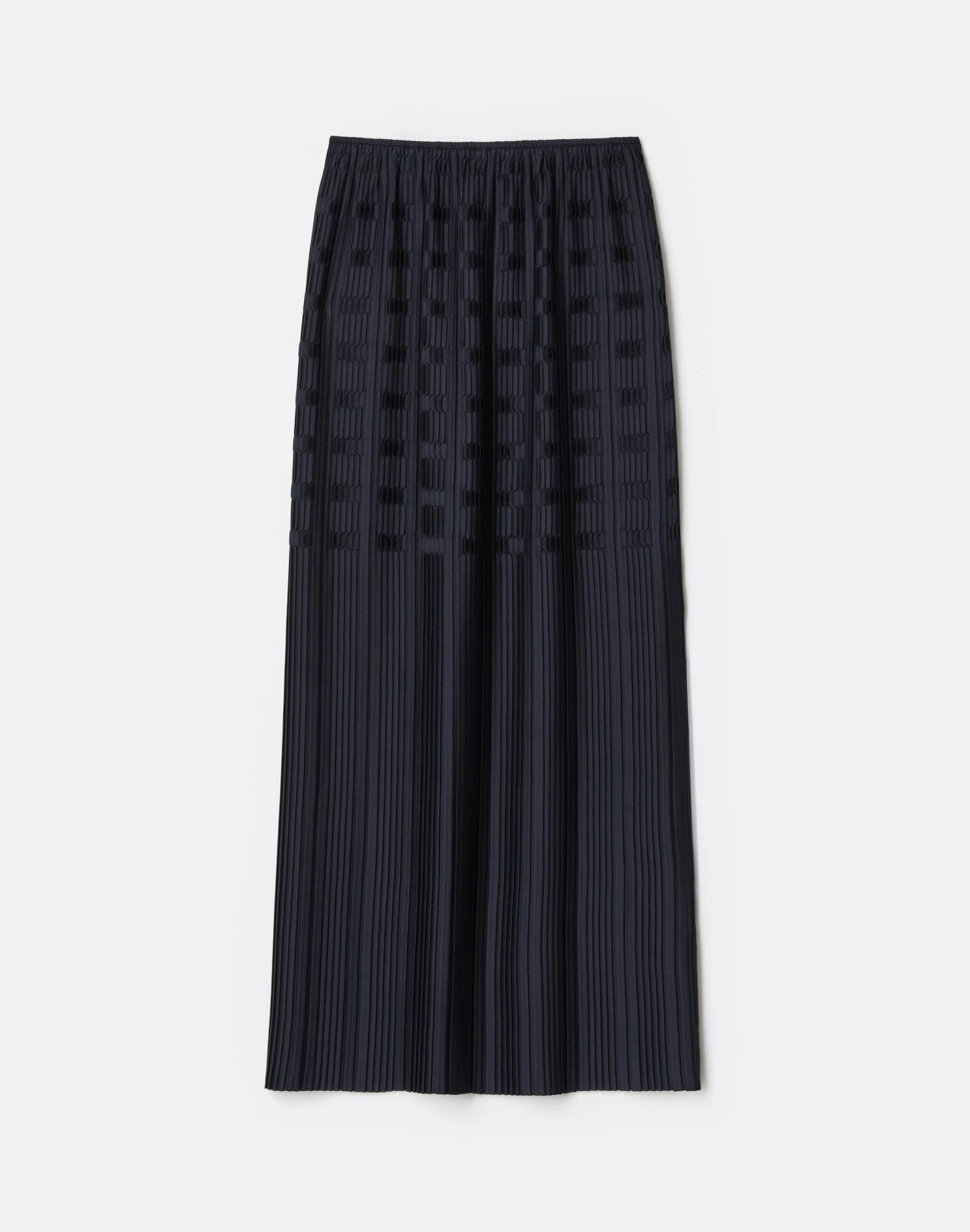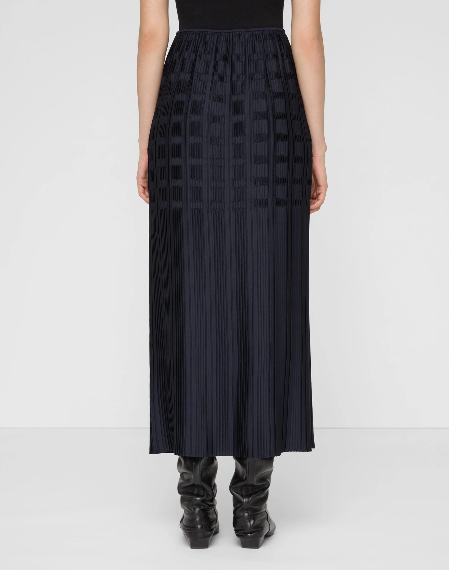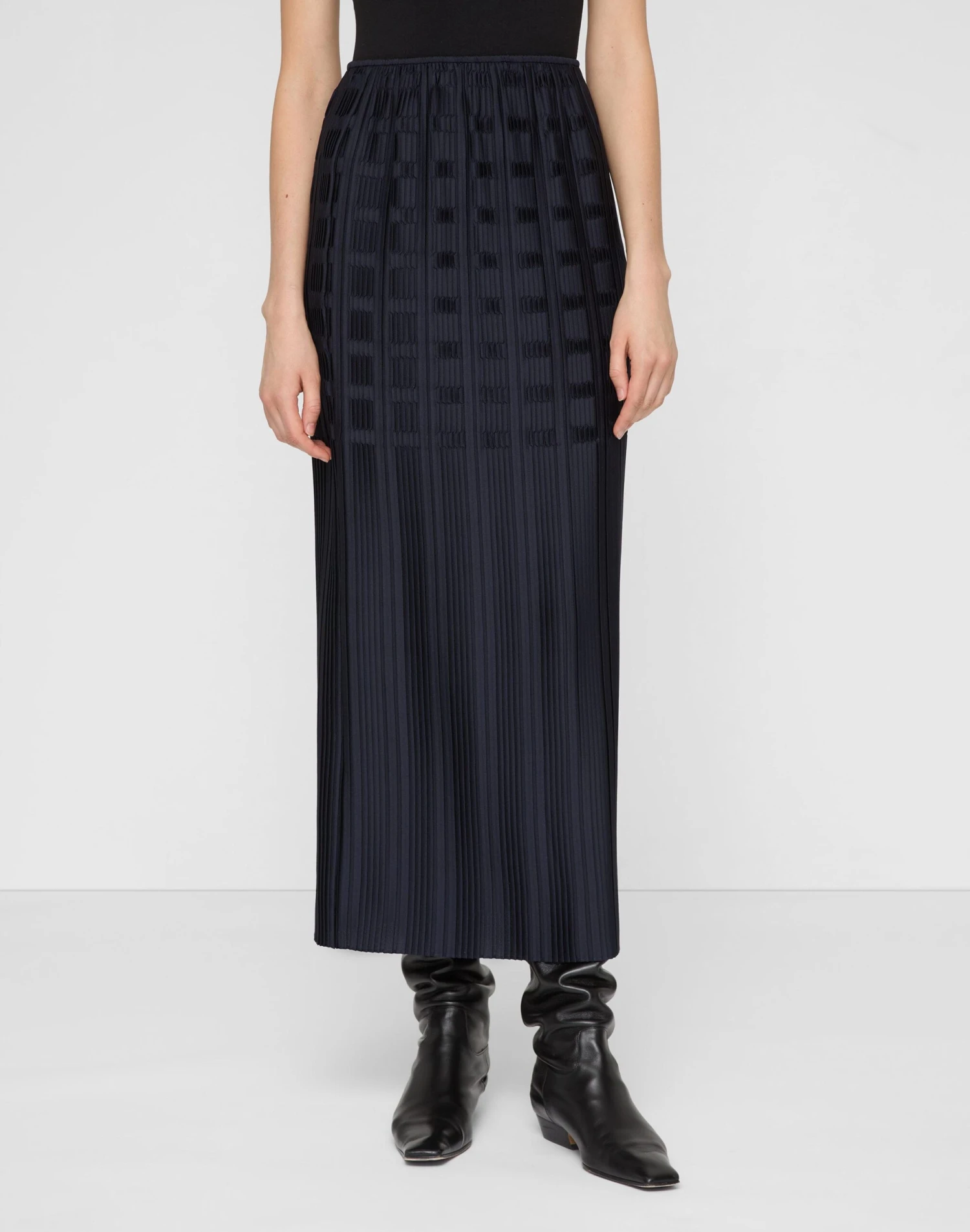 This midi skirt reinterprets signature plissé technique with a basketweave effect, crafted from luminous recycled satin. The straight silhouette falls to a calf-length hem and is finished with a stretch waistband.