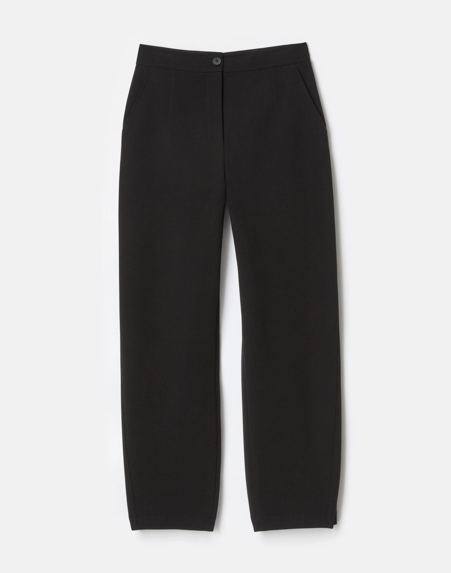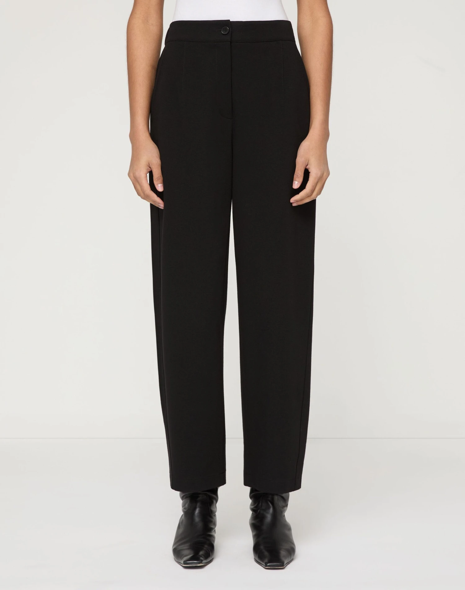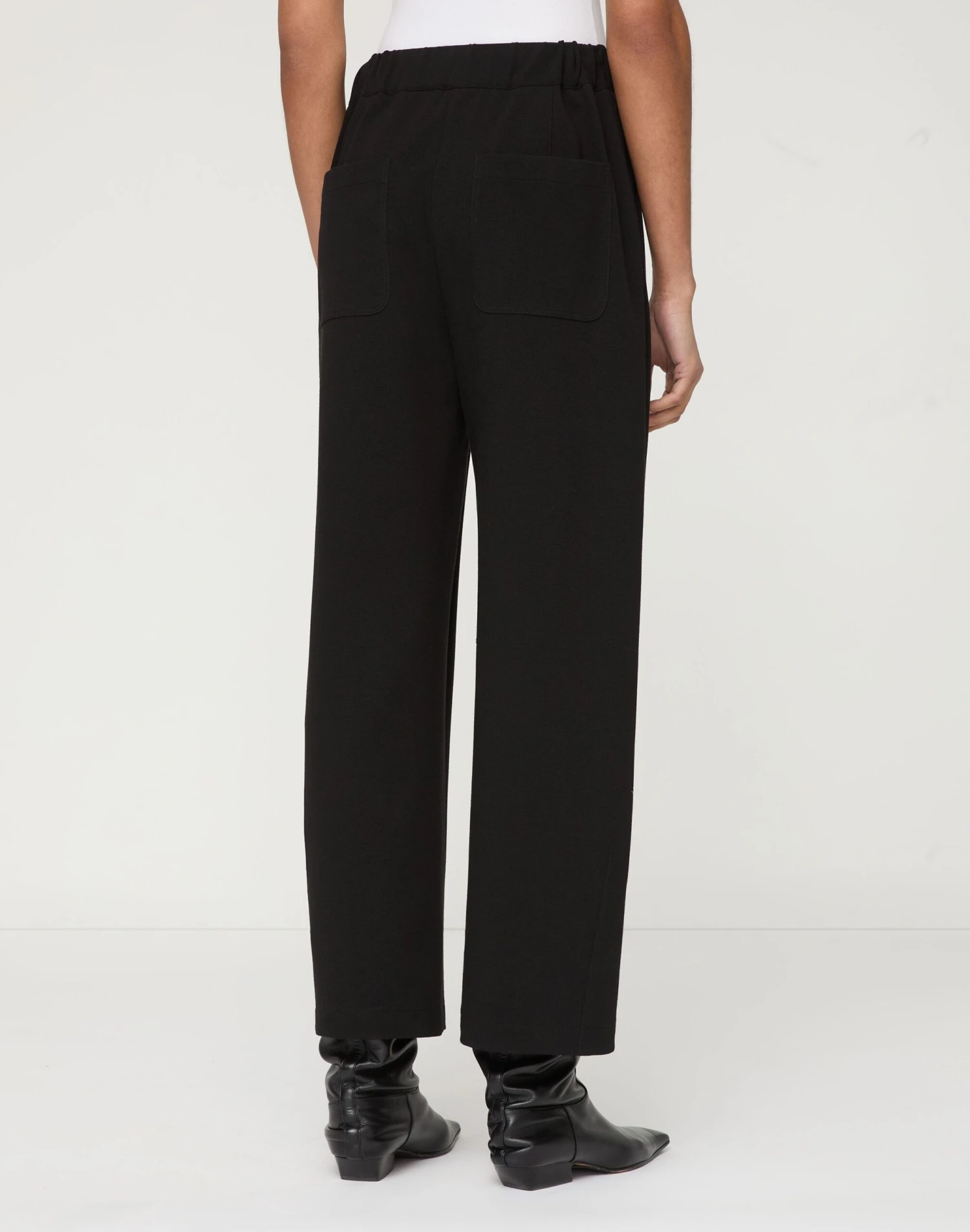 The Downing pant sits high at the waist with a curved barrel leg tapered at the ankle. Designed for ease with an elasticized back waistband and patch pockets, it’s cut from Italian Punto Milano—a contouring midweight jersey with a smooth finish.