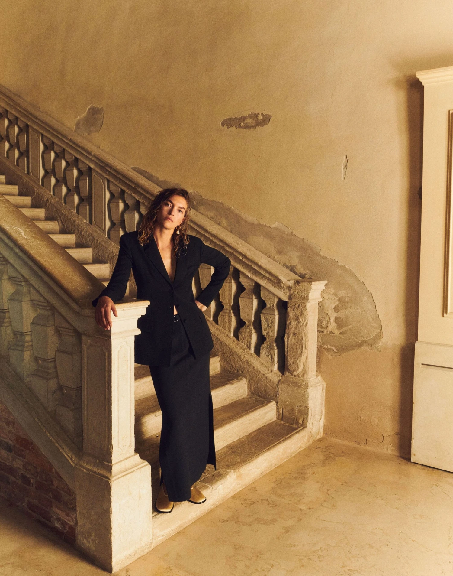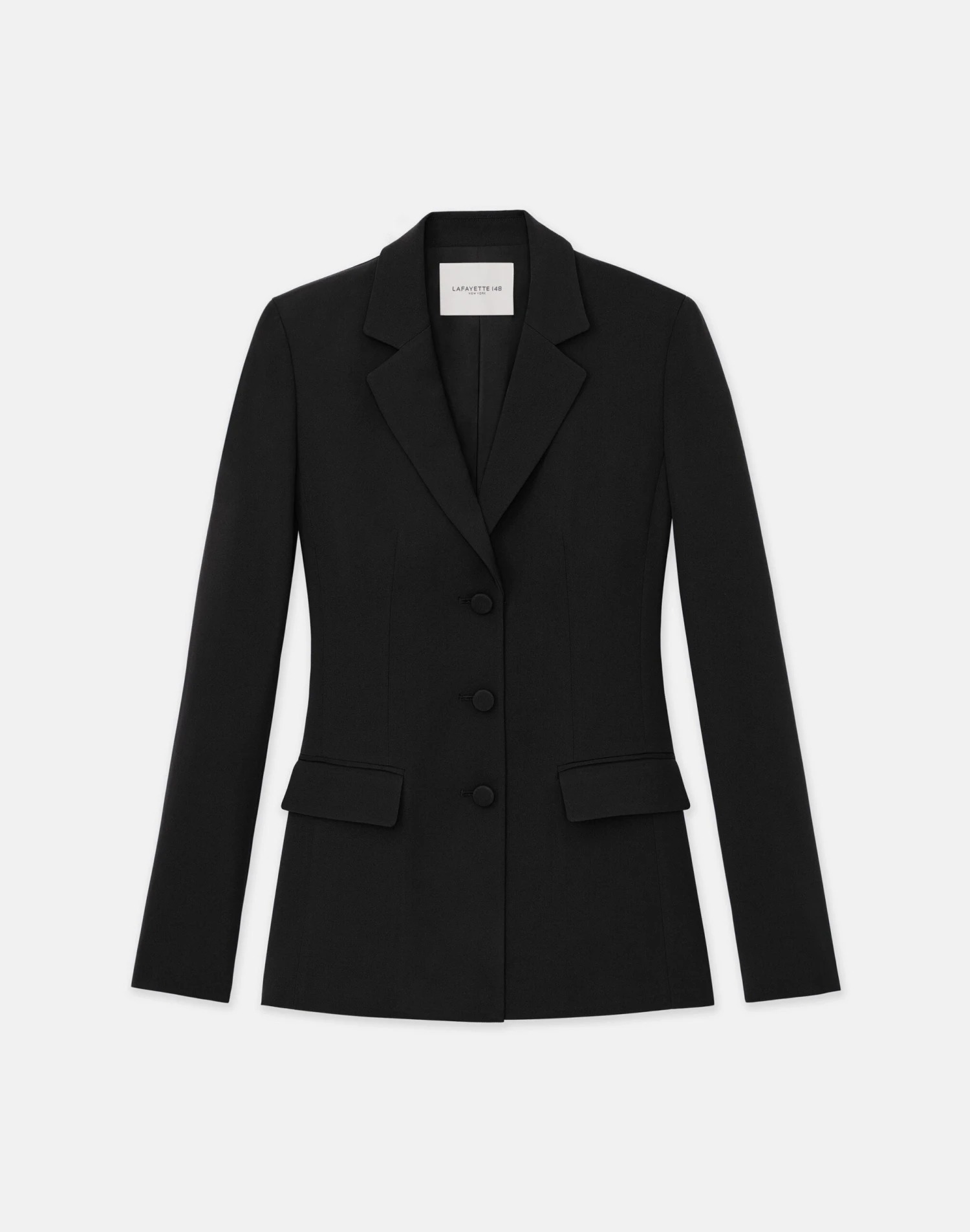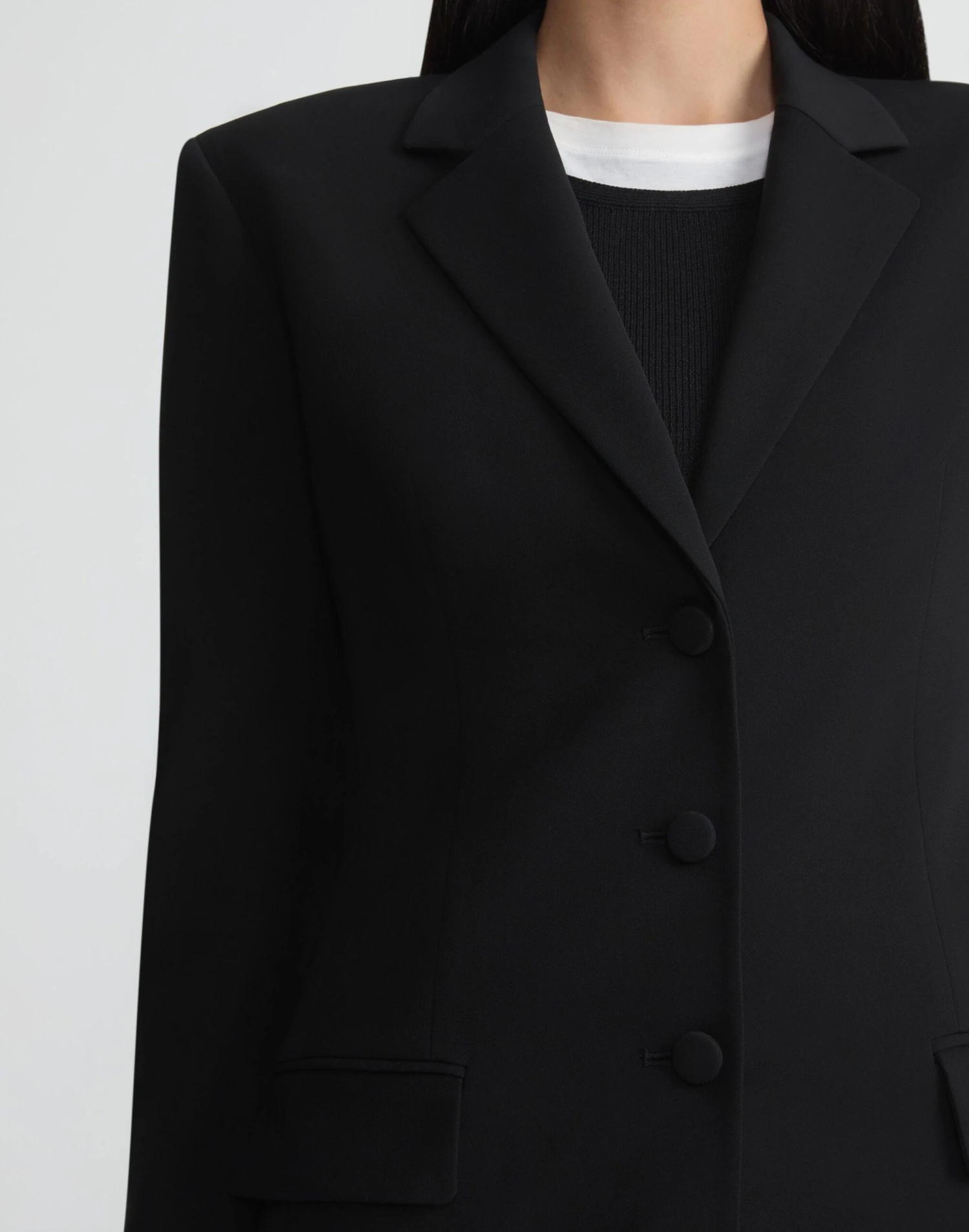 A study in considered proportions and sculptural lines, this three-button blazer is masterfully tailored in responsible Finesse Crepe—a tactile, seasonless fabric with impeccable drape. The notched lapel design is shaped with broad structured shoulders and contoured seaming highlighting a fitted silhouette.