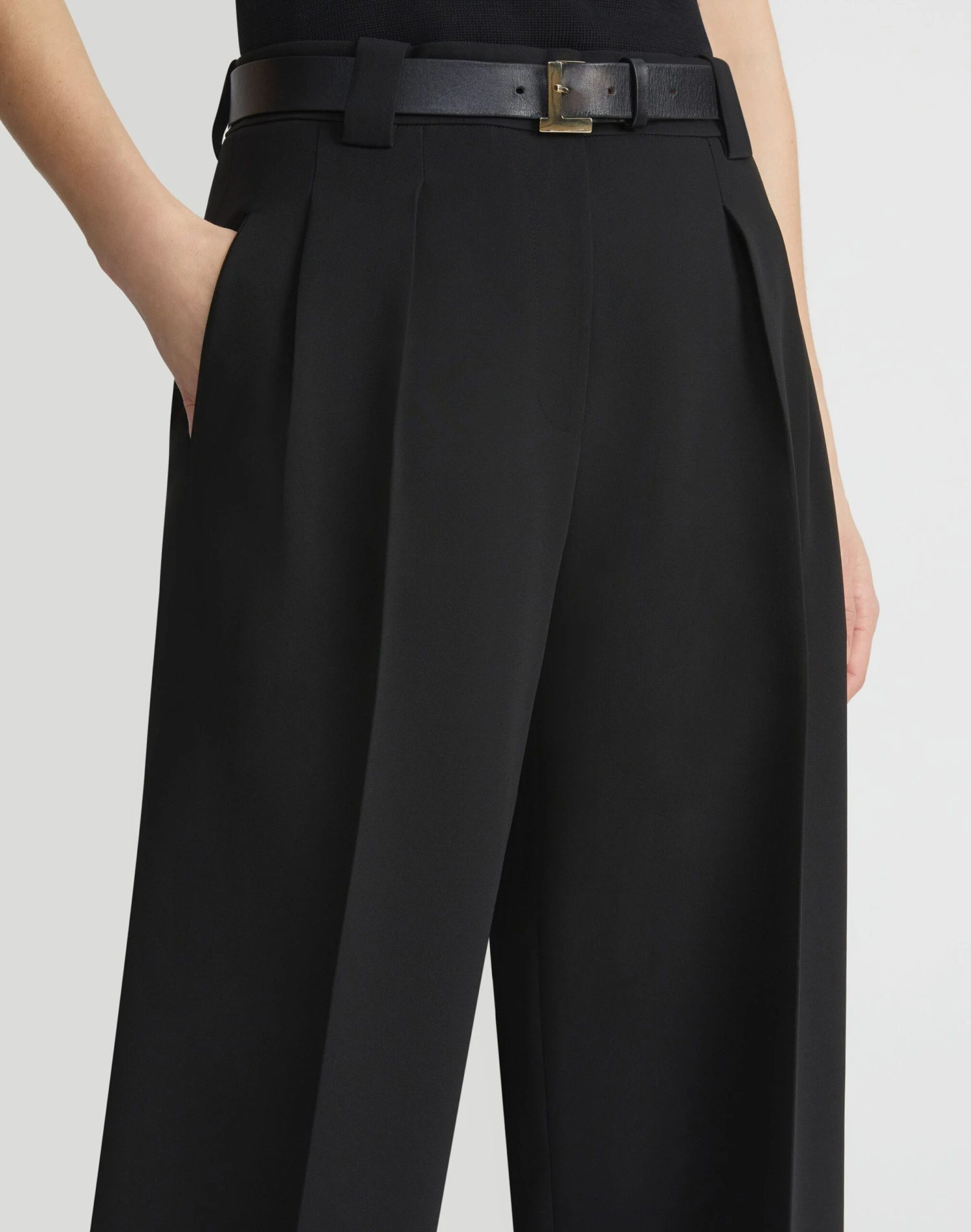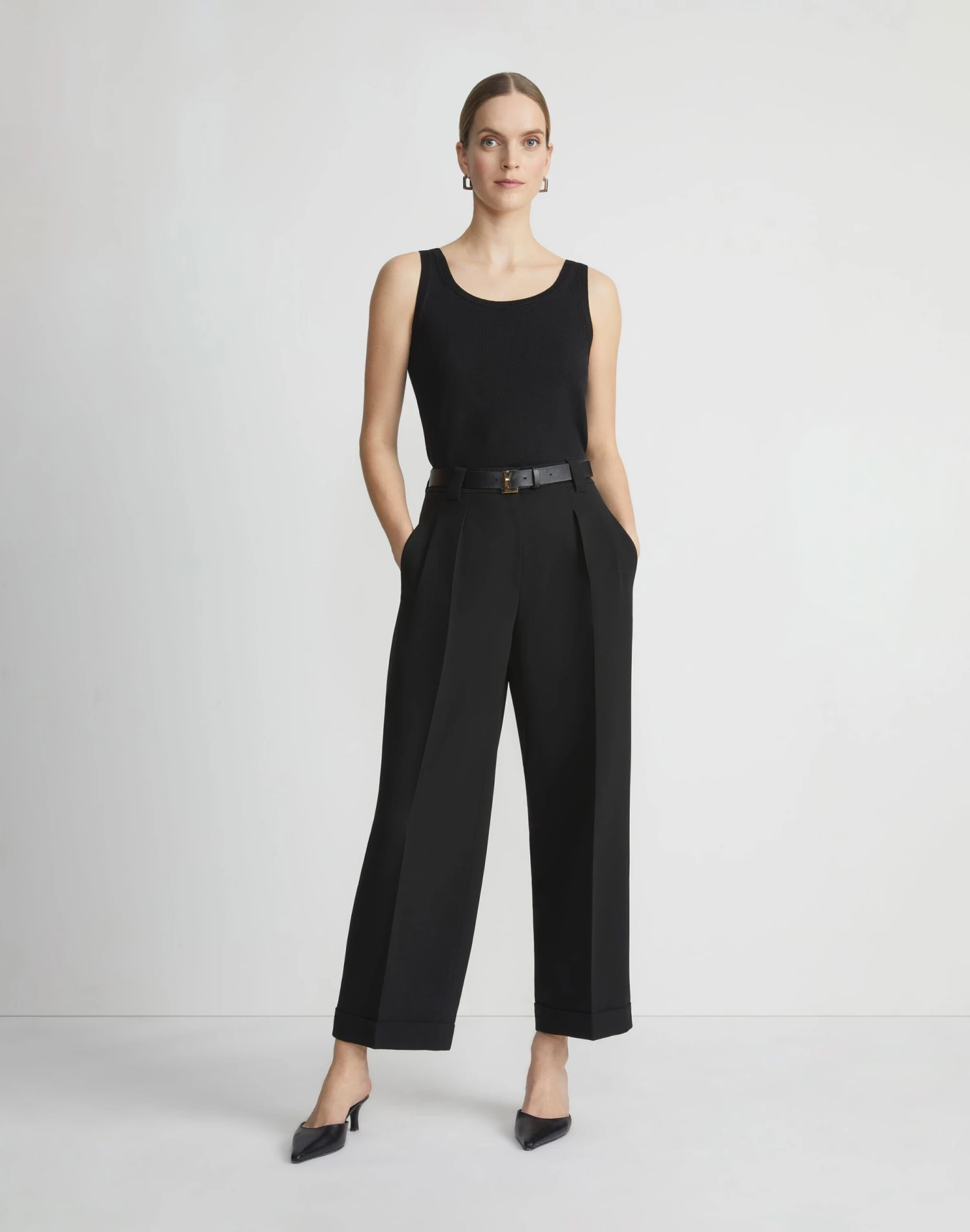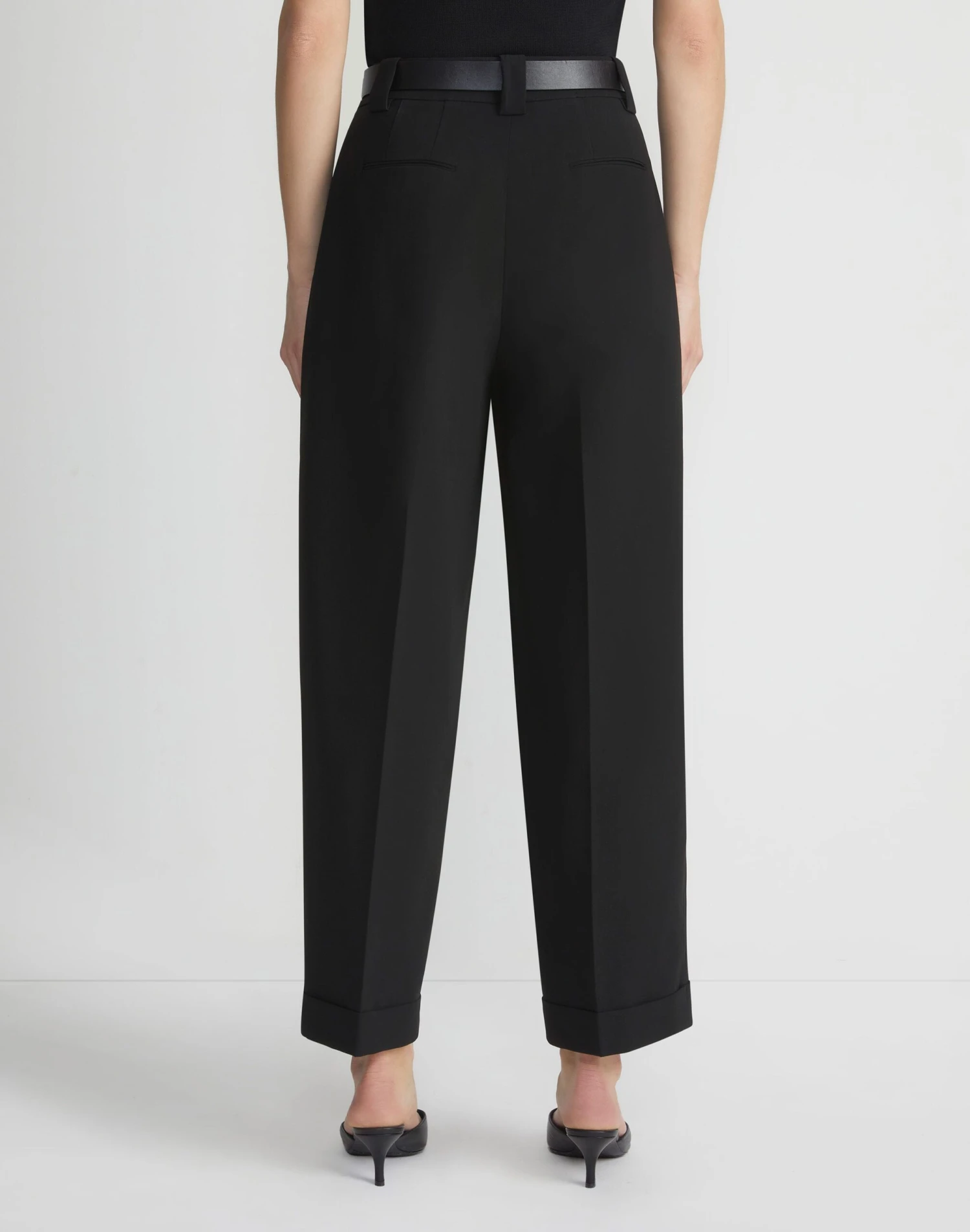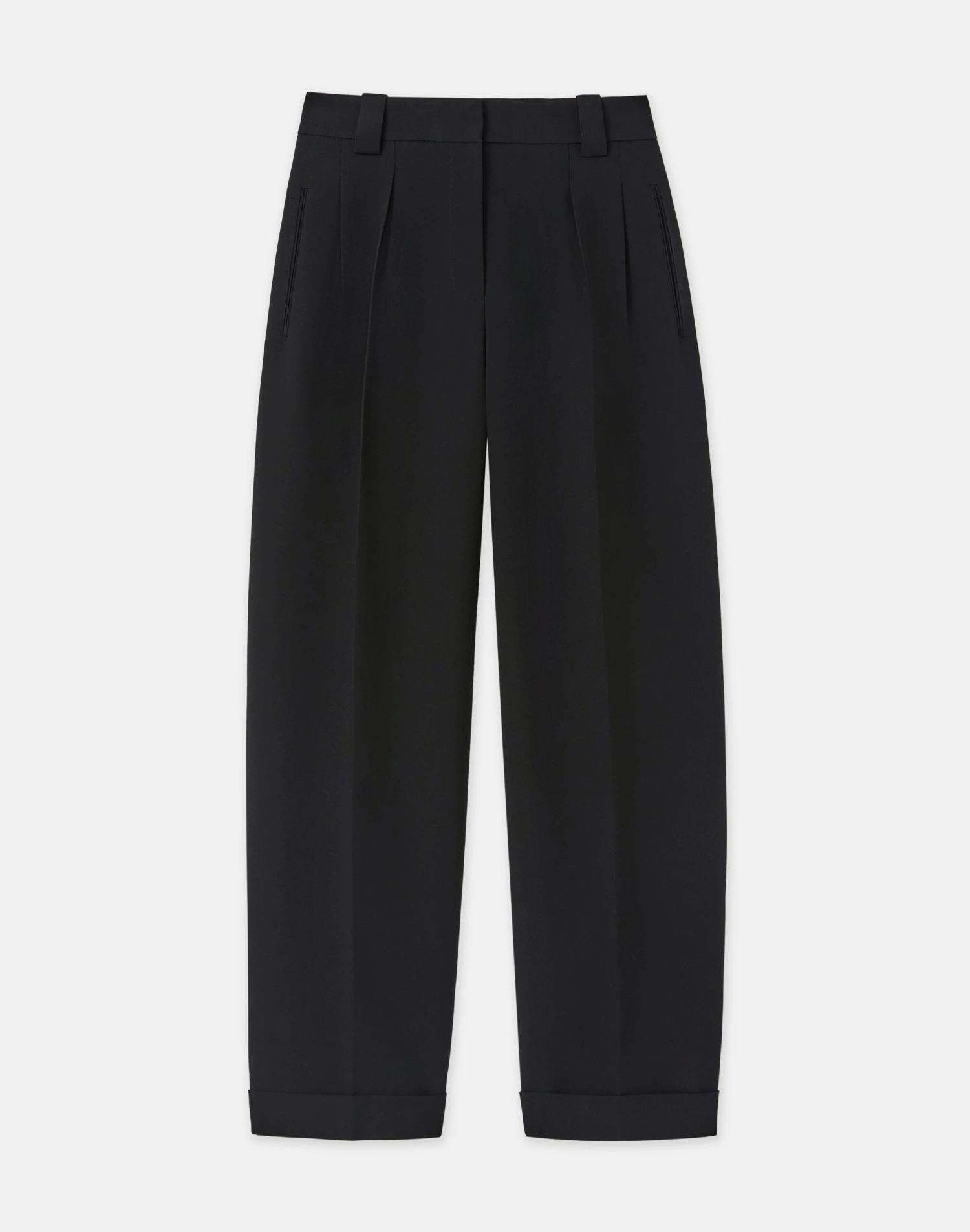 Lafayette 148’s signature Wyatt pant features a curved barrel leg and front pleats, offering balanced proportions and measured volume. The high-rise design sits at the waist and finishes with cuffed ankle hems, tailored from responsible Finesse Crepe for seasonless versatility and a fluid drape.