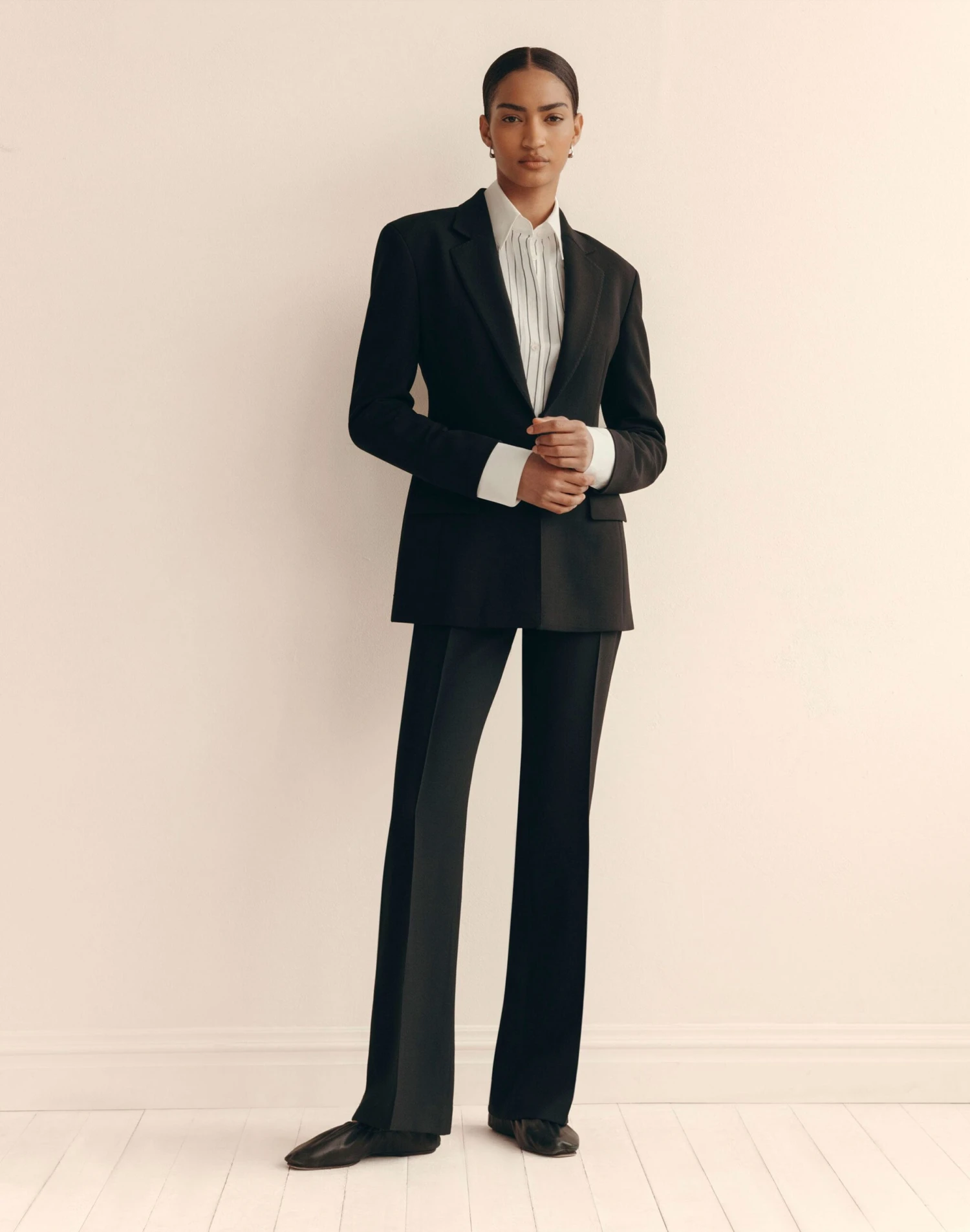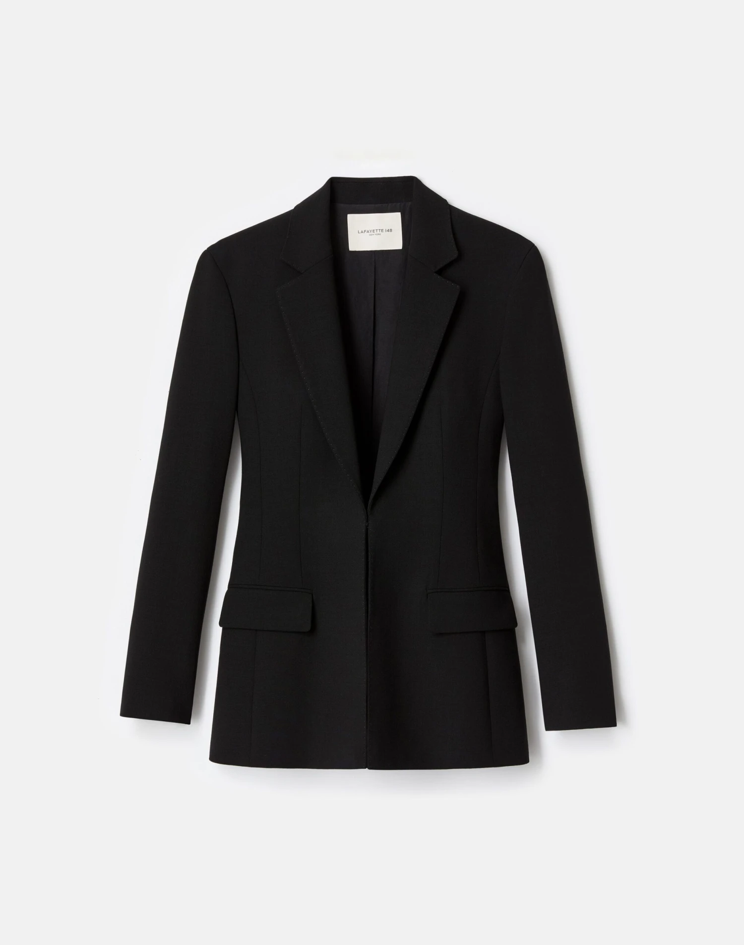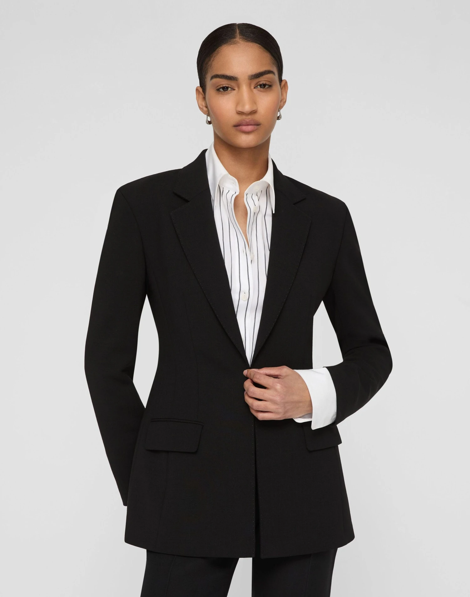 This fitted blazer tapers from softly structured shoulders to a nipped waist with a discreet closure. It’s tailored from double-face Italian wool—a responsibly sourced, midweight fabric blended with a hint of stretch for resilient shape.