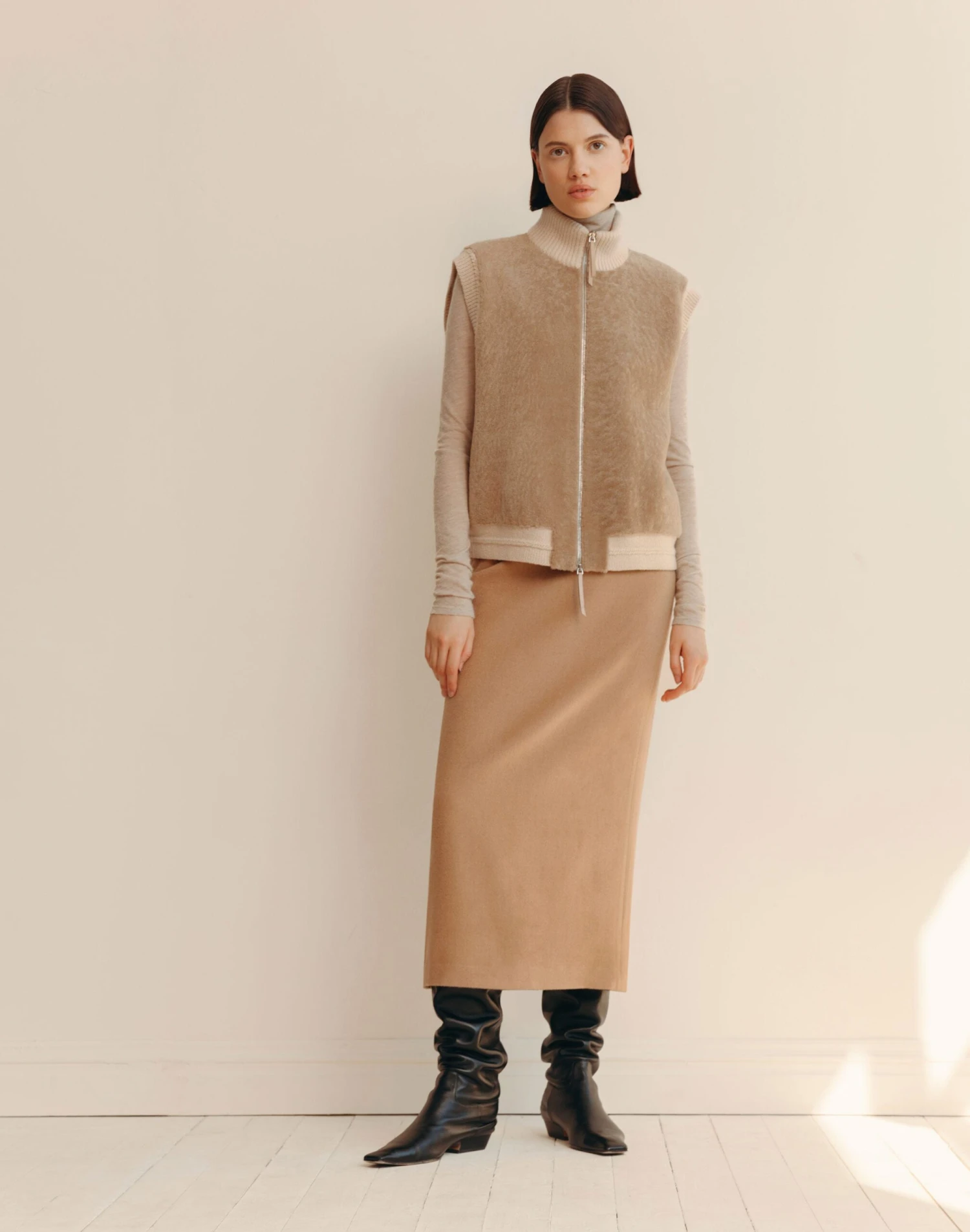 Understated luxury meets natural materiality in this bomber vest, with a lofty shearling front and quilted camel hair back insulated for warmth. Framed by wool-cashmere knit trims, its relaxed shape is fastened by a double-ended zipper finished with leather pulls.
