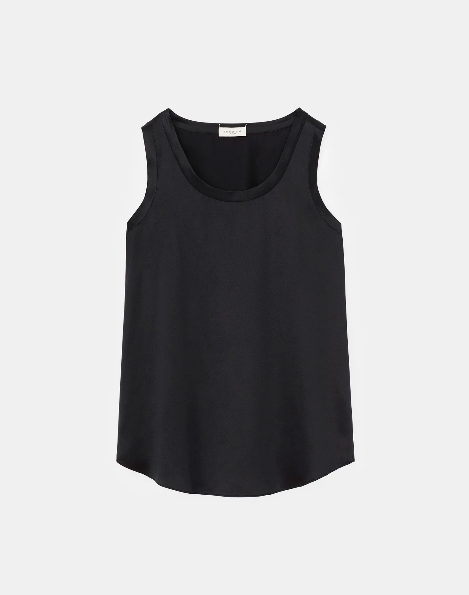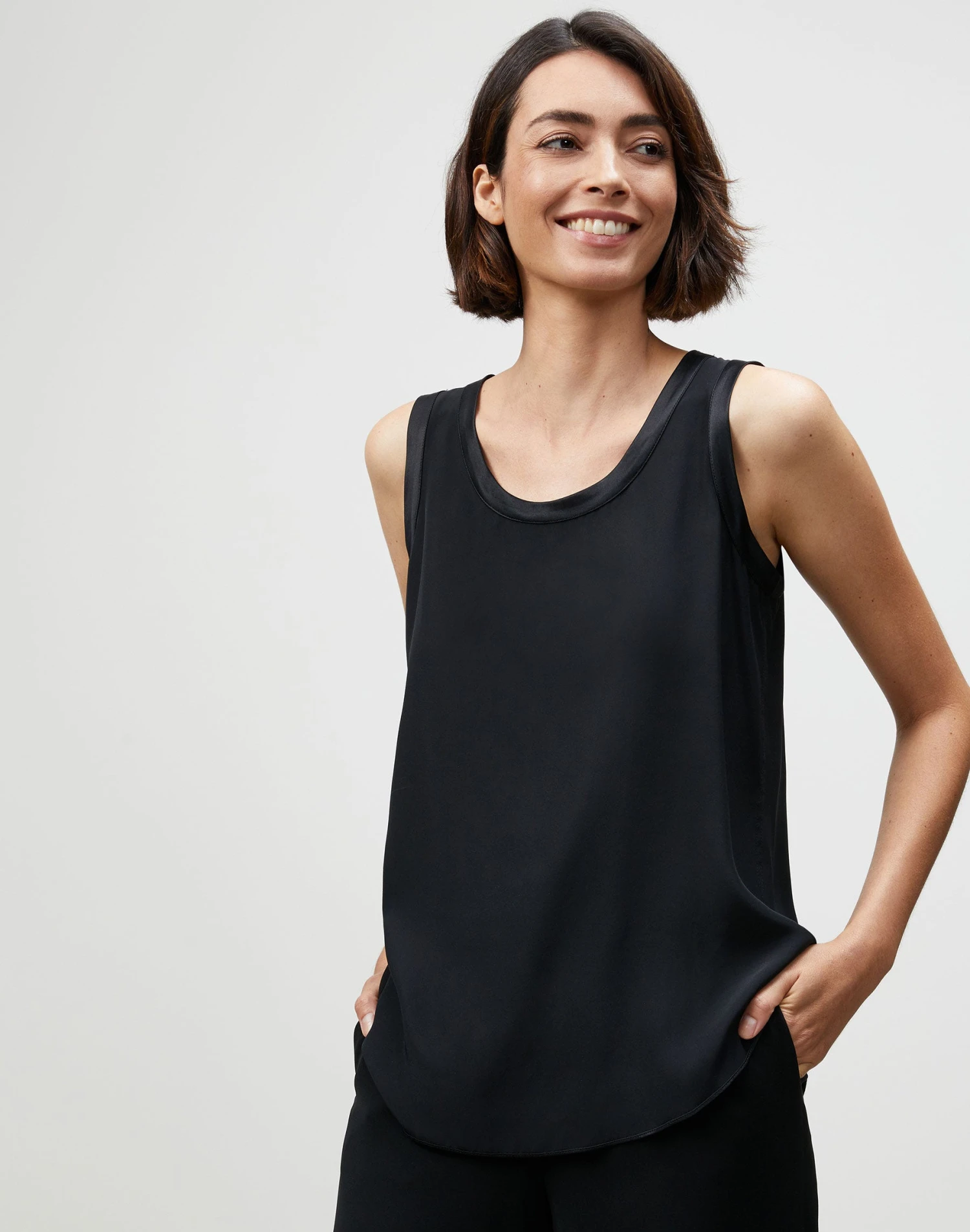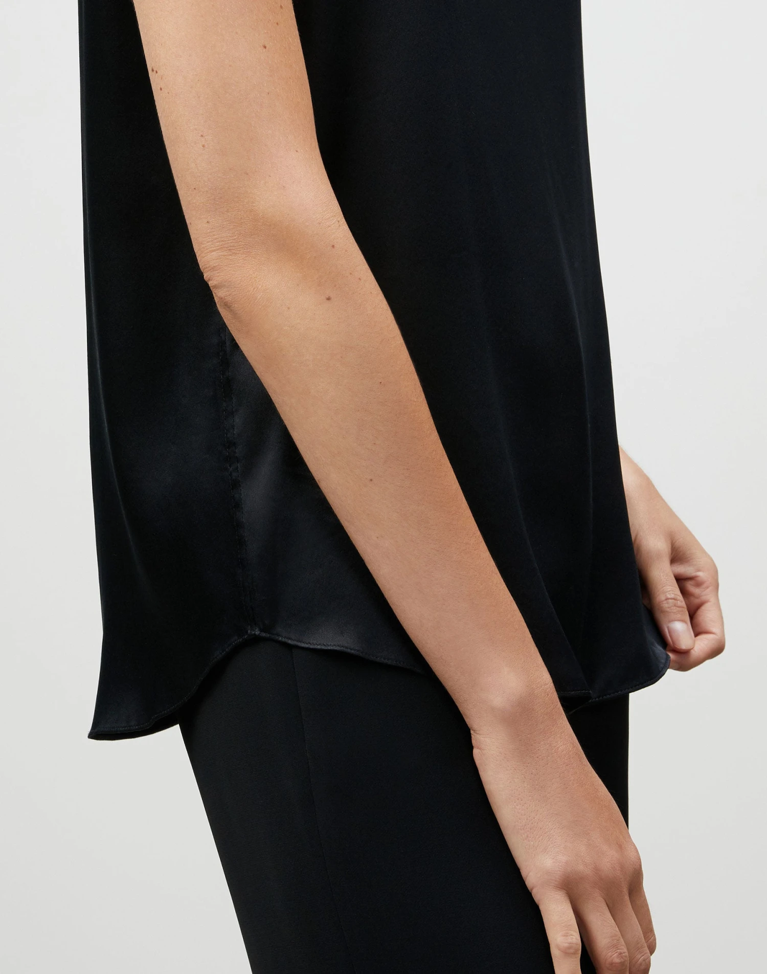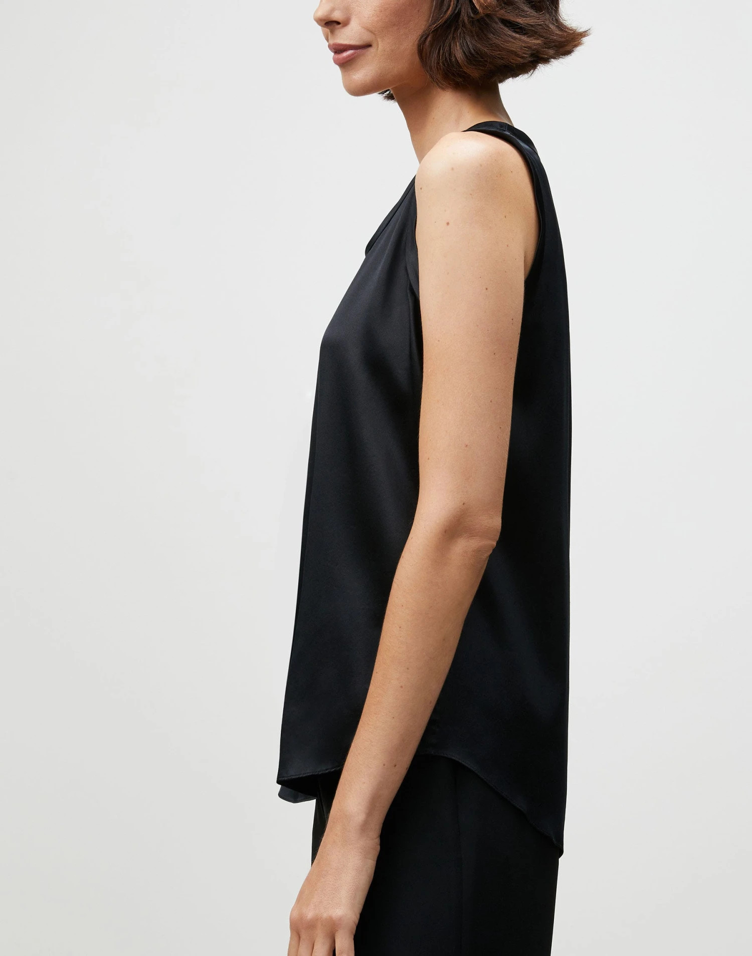 An L148 elevated essential, this sleeveless blouse is crafted from lustrous silk charmeuse that reverses to a smooth matte finish. The minimalist design is defined by a rounded neckline and softened shirttail hem.
