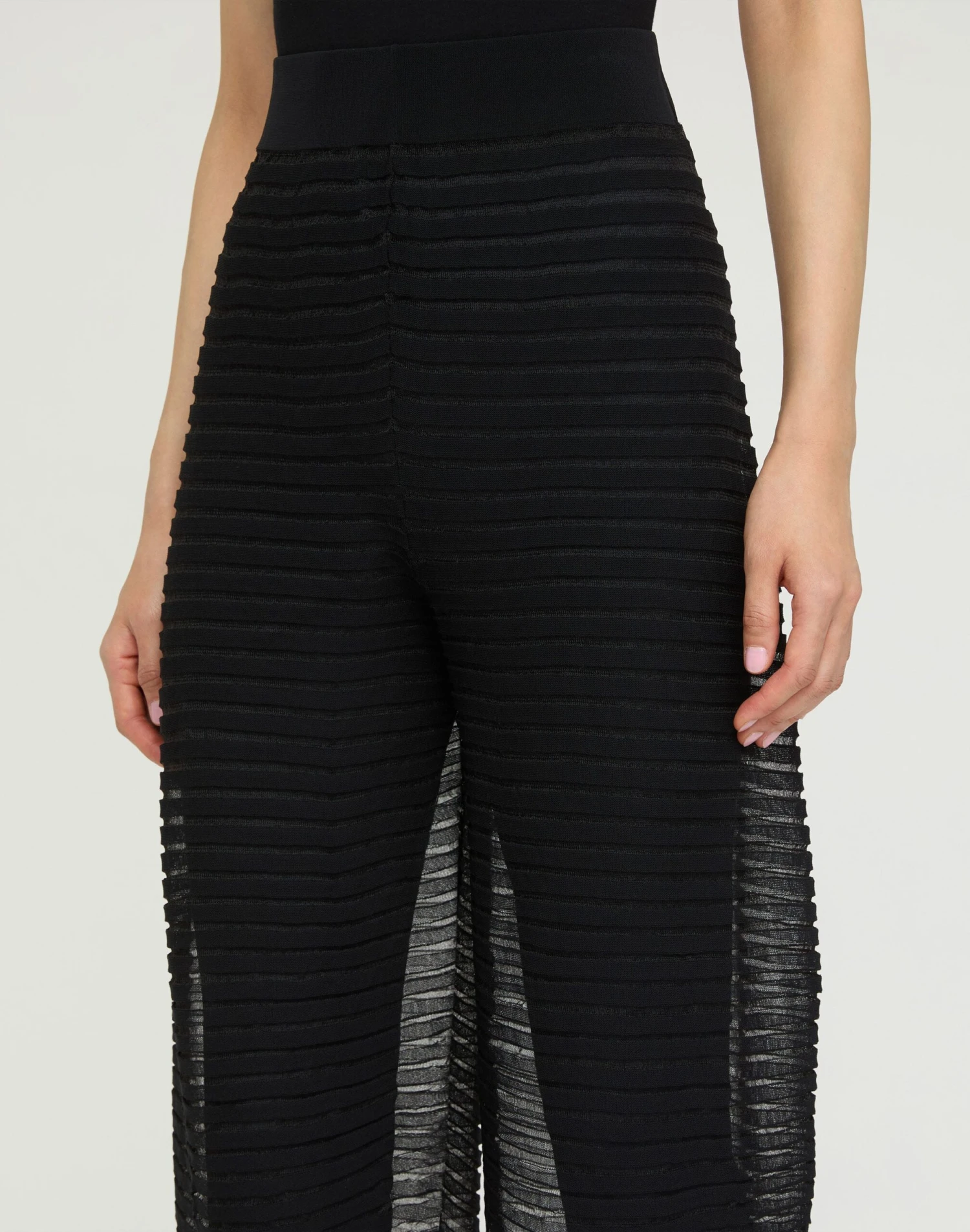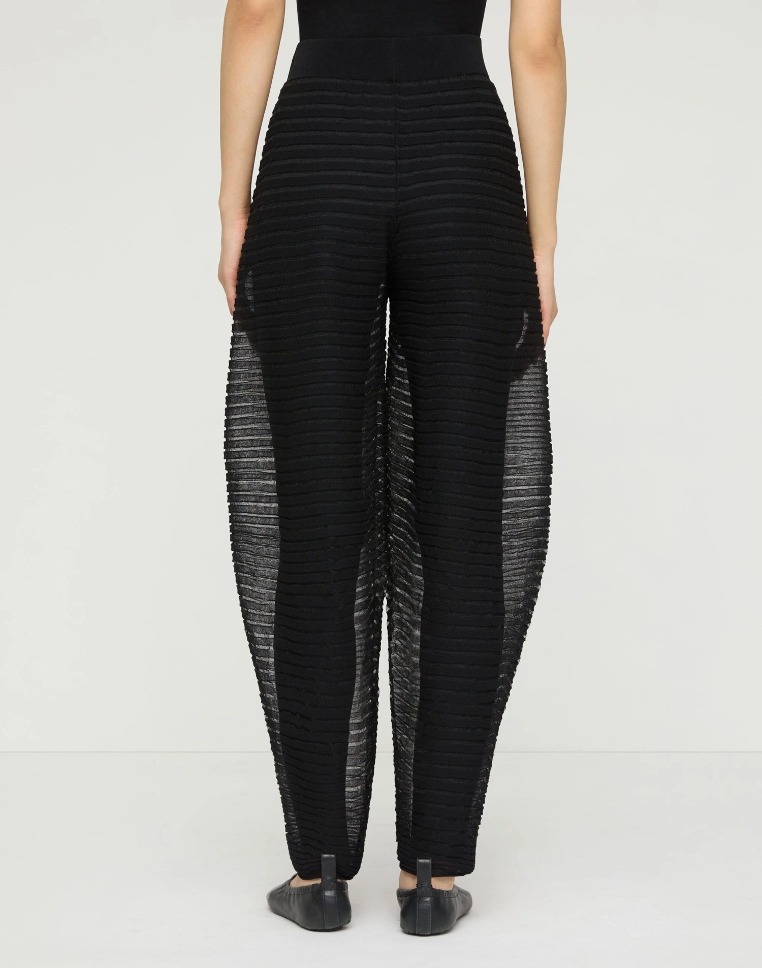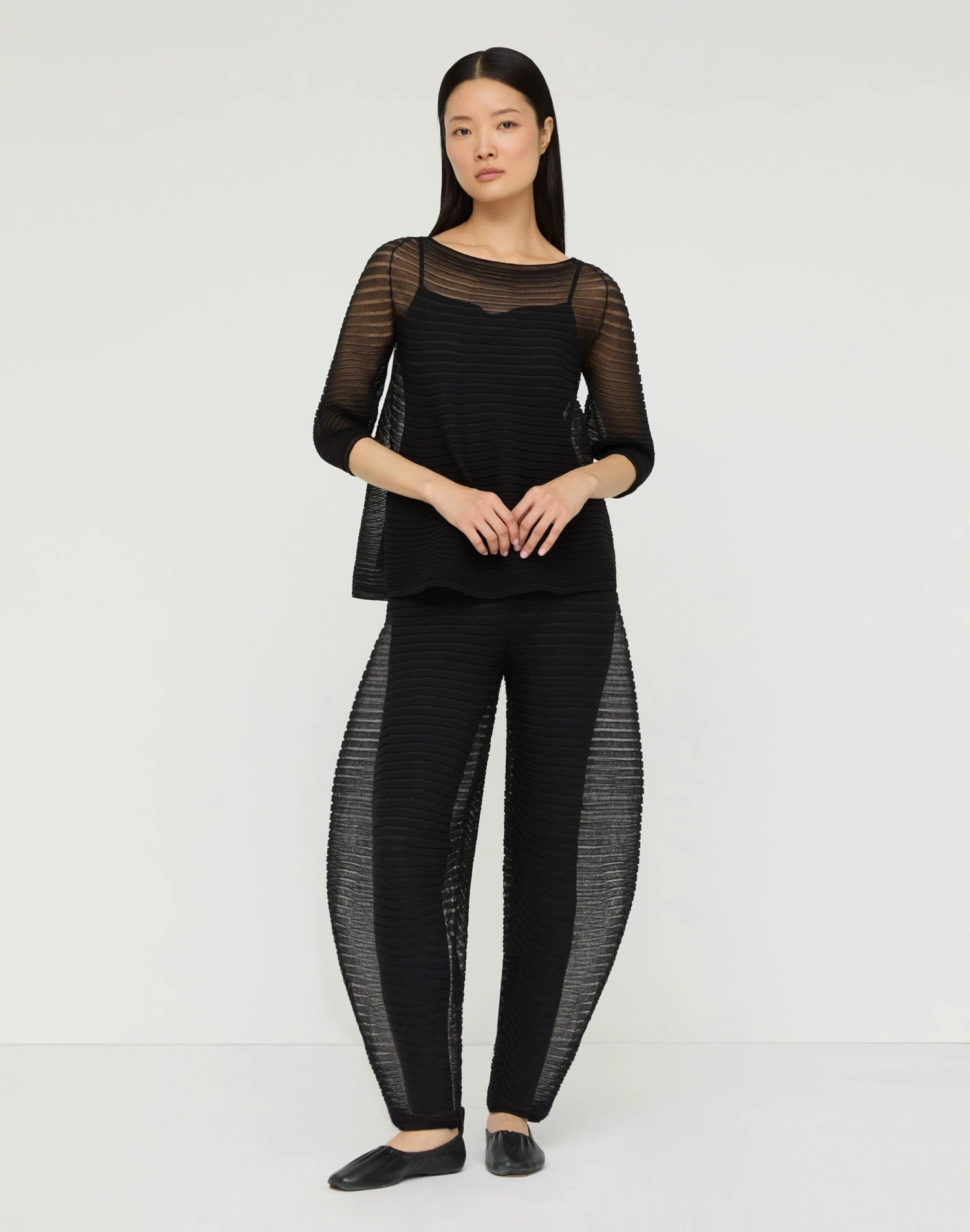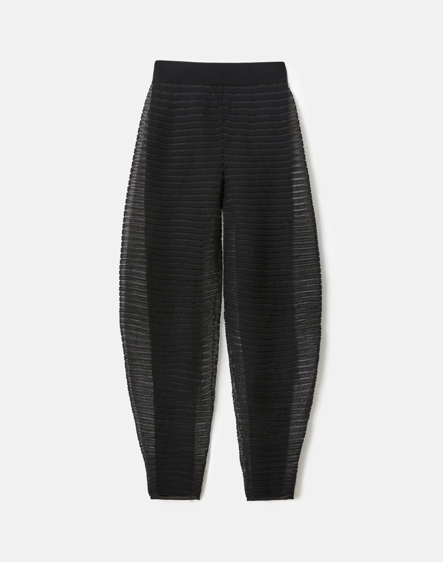 Inspired by ceramic shapes, this airy summer knit pant is crafted from silk crepe yarn with intricate pleats, creating soft volume. Featuring a curved leg that tapers toward the ankle, the transparent design is layered over opaque leggings for a silhouetted effect. It’s part of a set with the matching top. top.