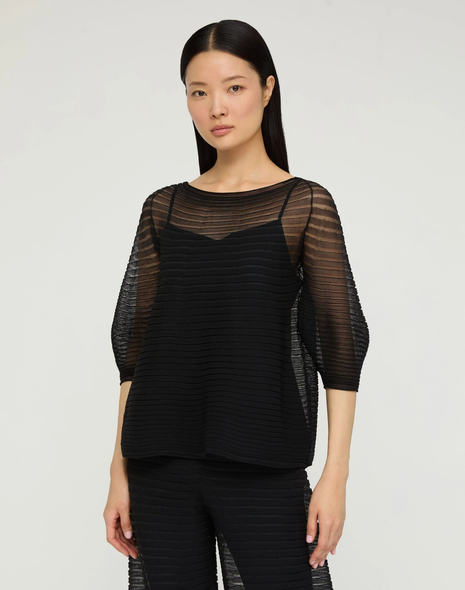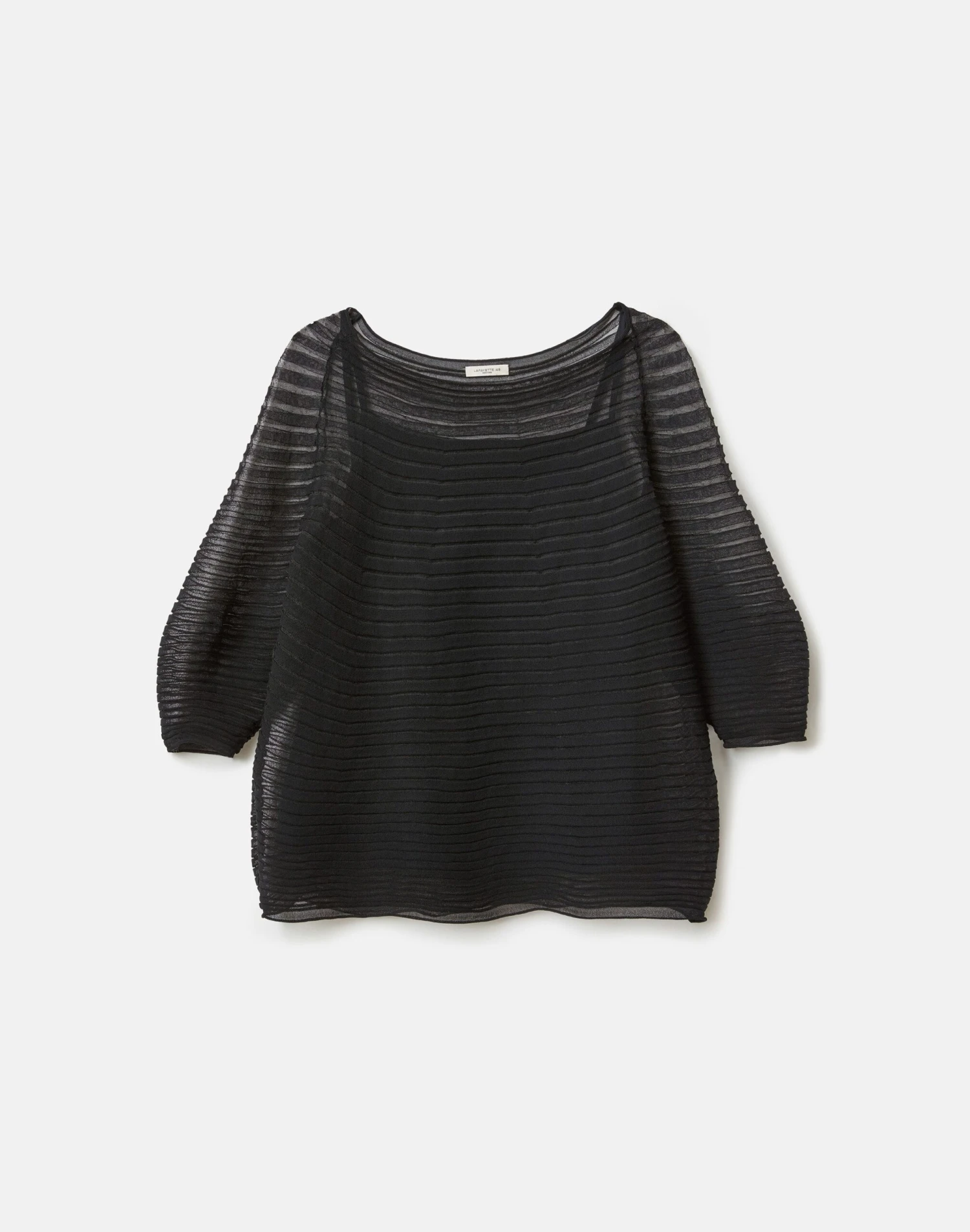 Inspired by ceramic shapes, this airy summer knit layer is crafted from silk crepe yarn with intricate pleats, creating soft volume. The relaxed-fit top is defined by curved three-quarter sleeves and is paired with an opaque camisole to balance the transparent design. It’s part of a set with a matching pant.