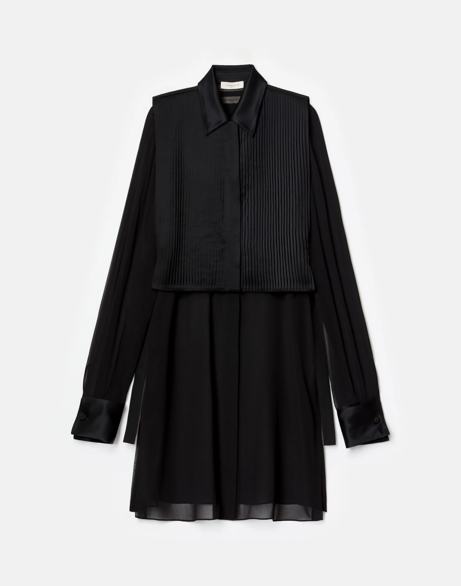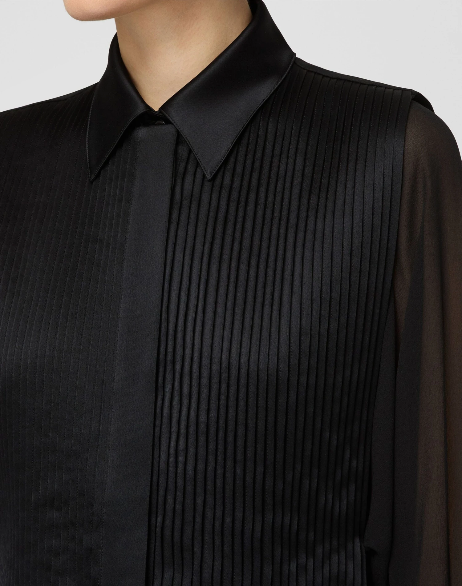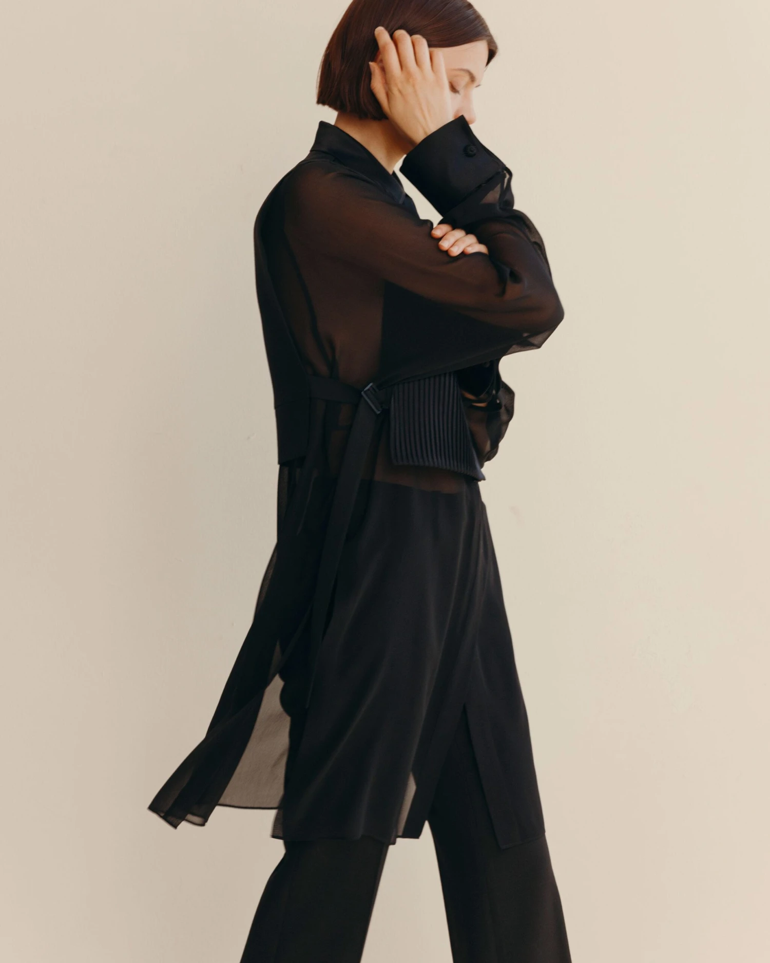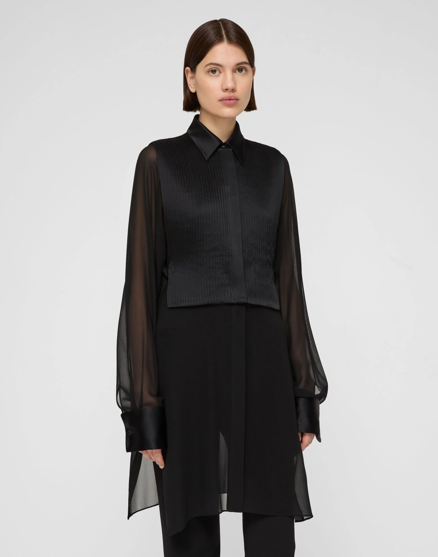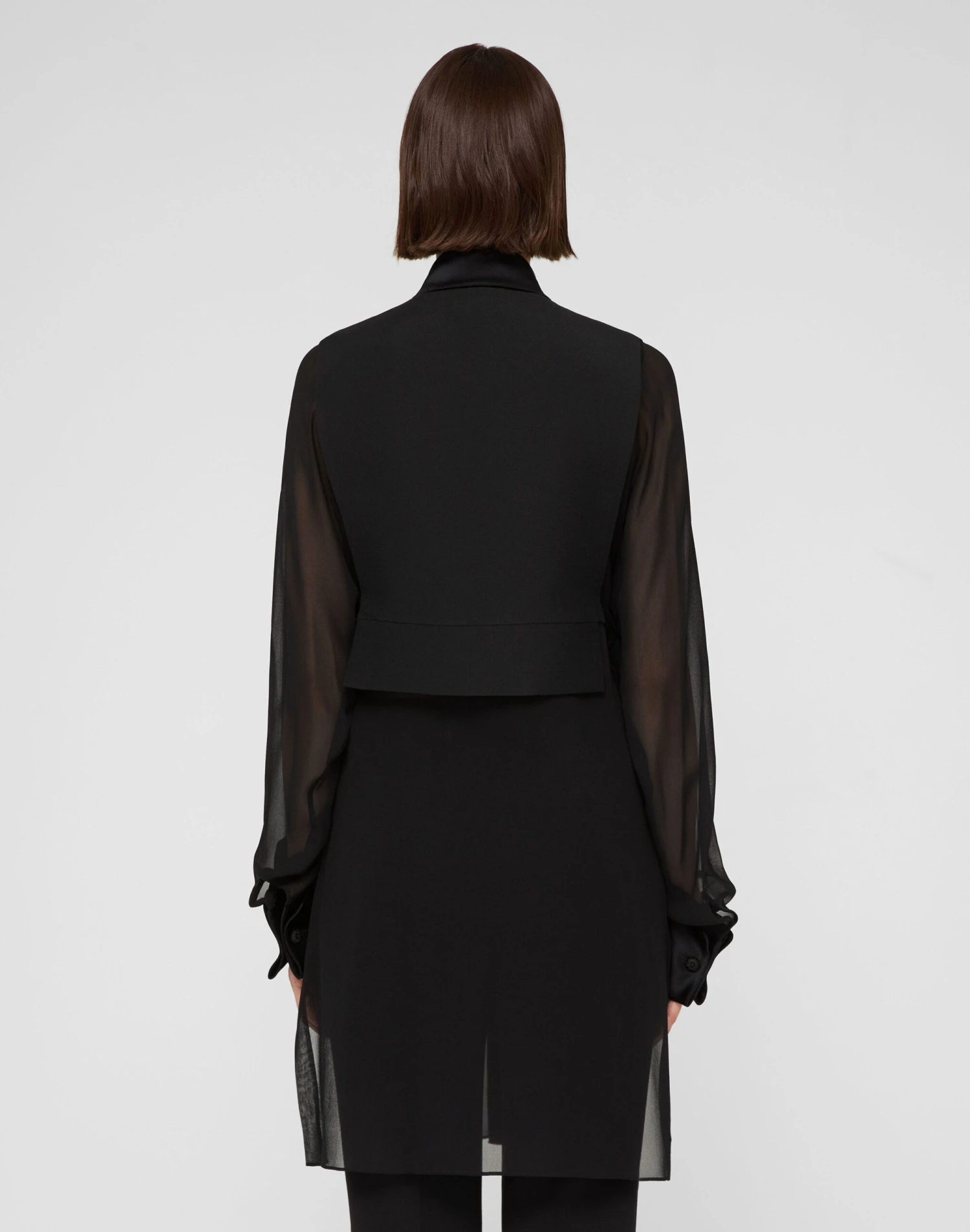 This tuxedo-inspired two-piece set pairs a sheer silk French cuff tunic with a pintucked cropped vest, crafted in satin and wool-silk crepe with adjustable D-ring side ties. The convertible design transitions between occasions for versatile styling—layered or worn separately.