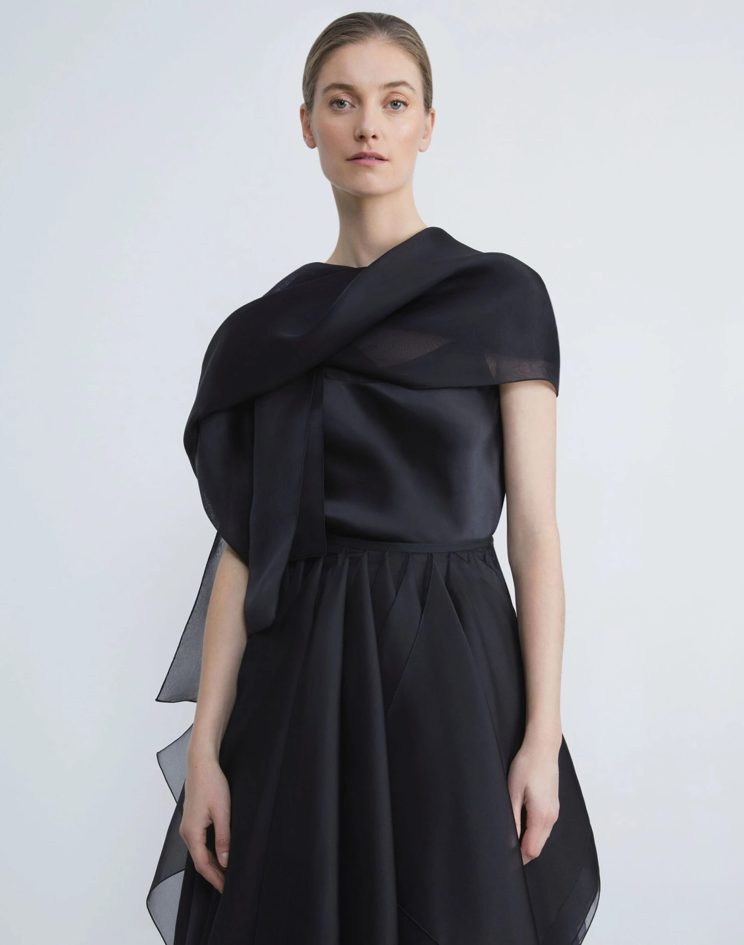This semi-sheer silk organza stole drapes over the shoulders in an understated, elongated shape. Featherlight and refined, it’s finished with hand-rolled edges.