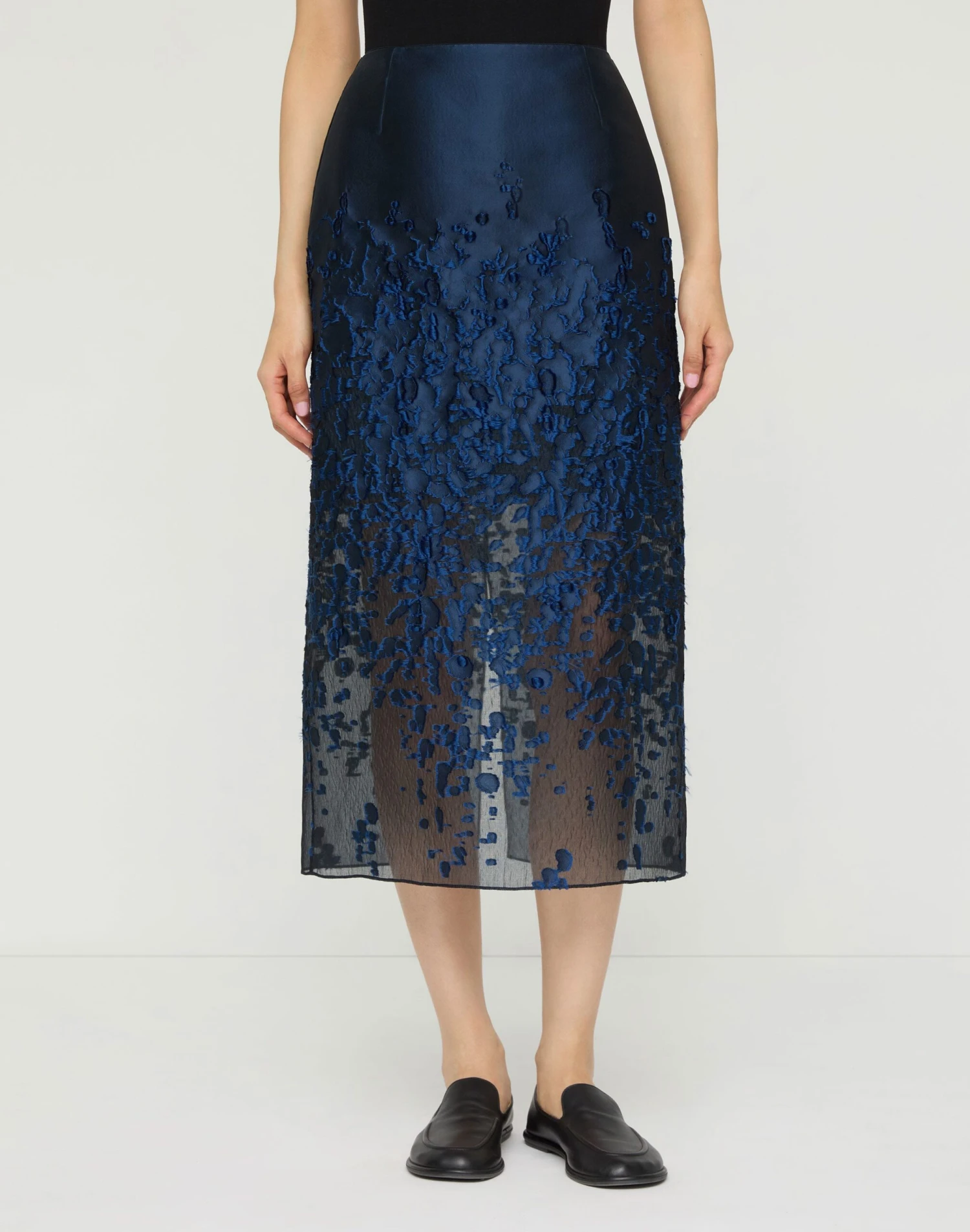 A custom-designed Italian fil coupé jacquard, crafted with gauzy lightness, channels the ceramic textures of Pre-Fall 2025 in unexpectedly feminine event dressing. The straight-fit skirt is cut to a midi hem with a high-slit back and features a semi-sheer design, partially lined for a silhouetted effect. Pair it with the coordinating cropped jacket.