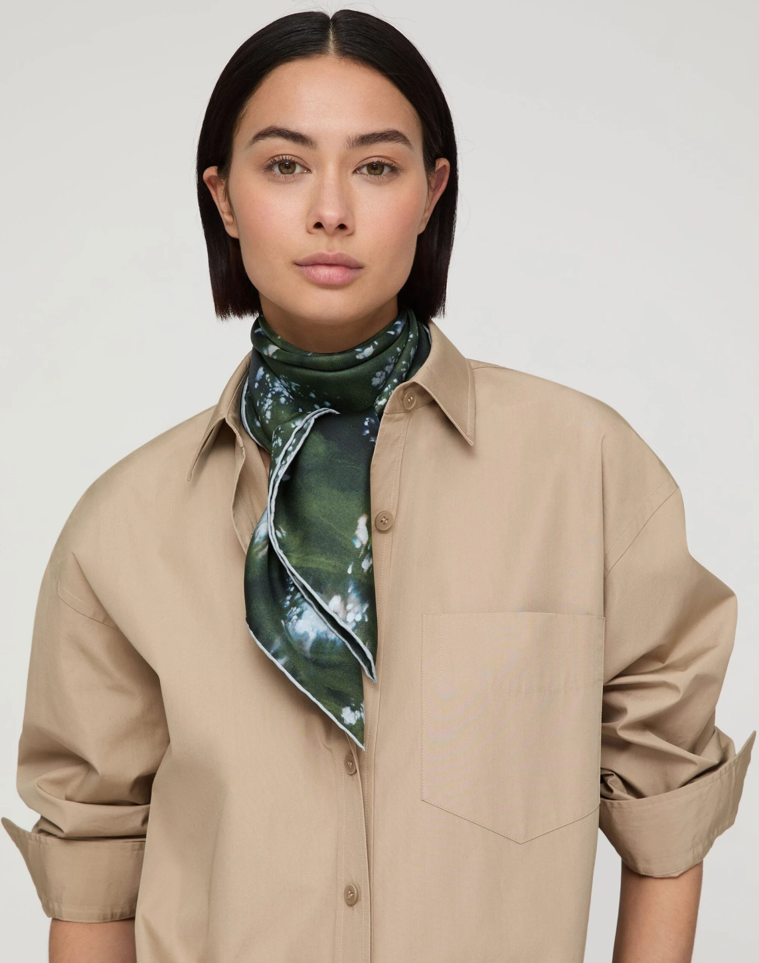 Crafted in Italy, this scarf features Pre-Fall 2025’s Splattered Glaze artwork, printed with a rich luster on pure silk twill. With hand-rolled edges and a soft finish, its square shape is made to fold, knot or tie with ease.