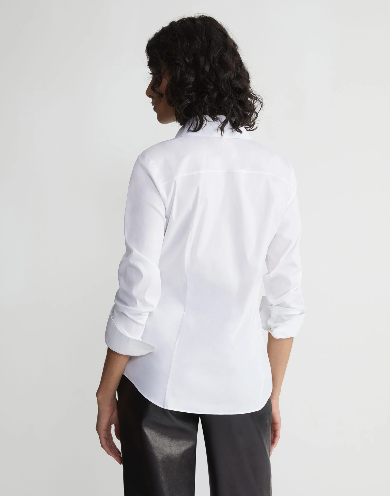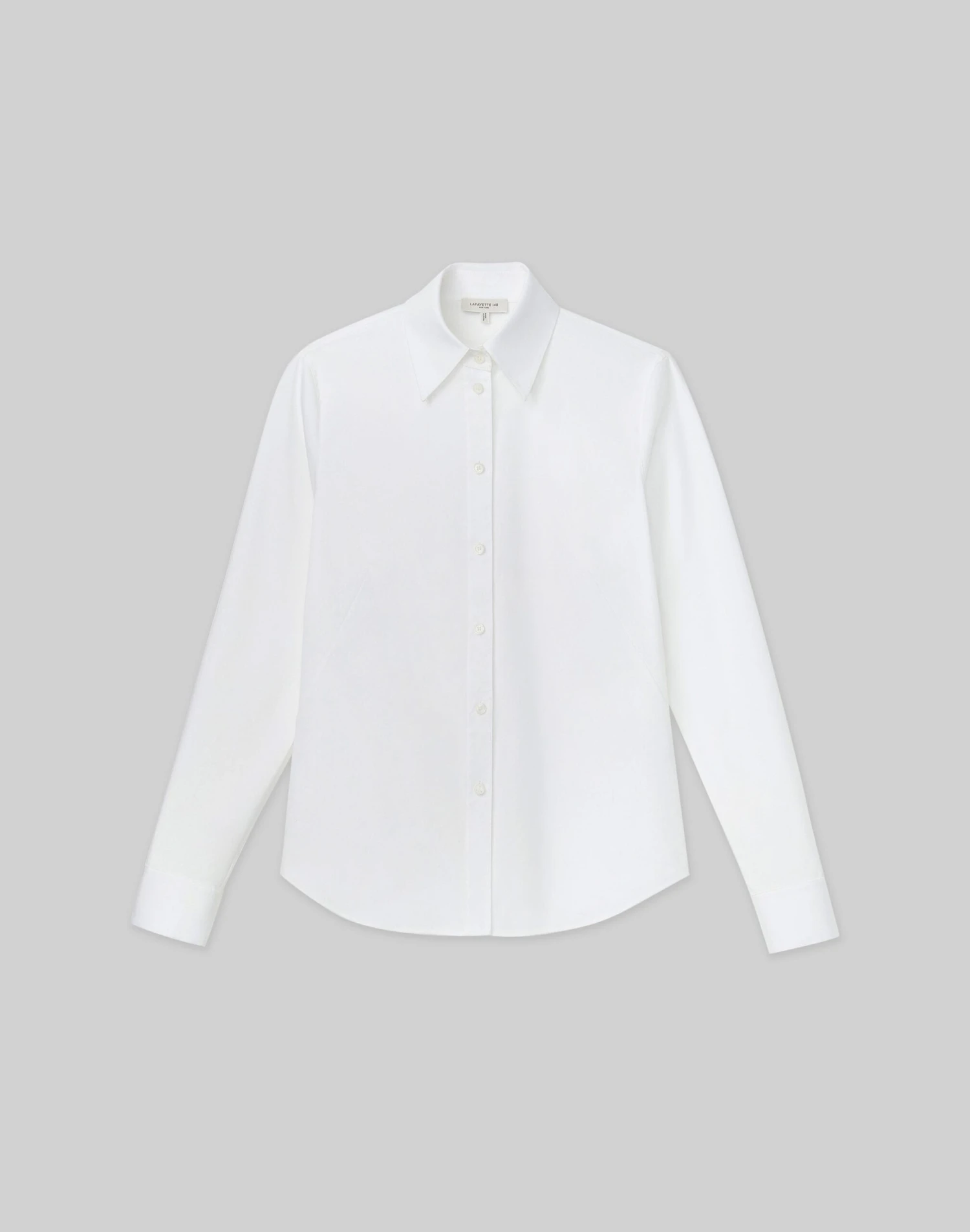 Distilling the classic button-up to its purest form, this slim-cut shirt is flawlessly tailored from L148’s heritage soft, crisp cotton poplin infused with a hint of stretch for exceptional fit. This feminine shape is contoured through precise French darting, while a high architectural collar, clean back yoke and shirttail hem lend to its structured form.