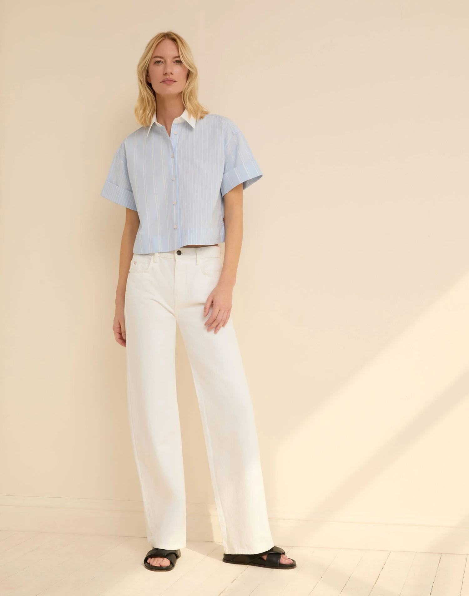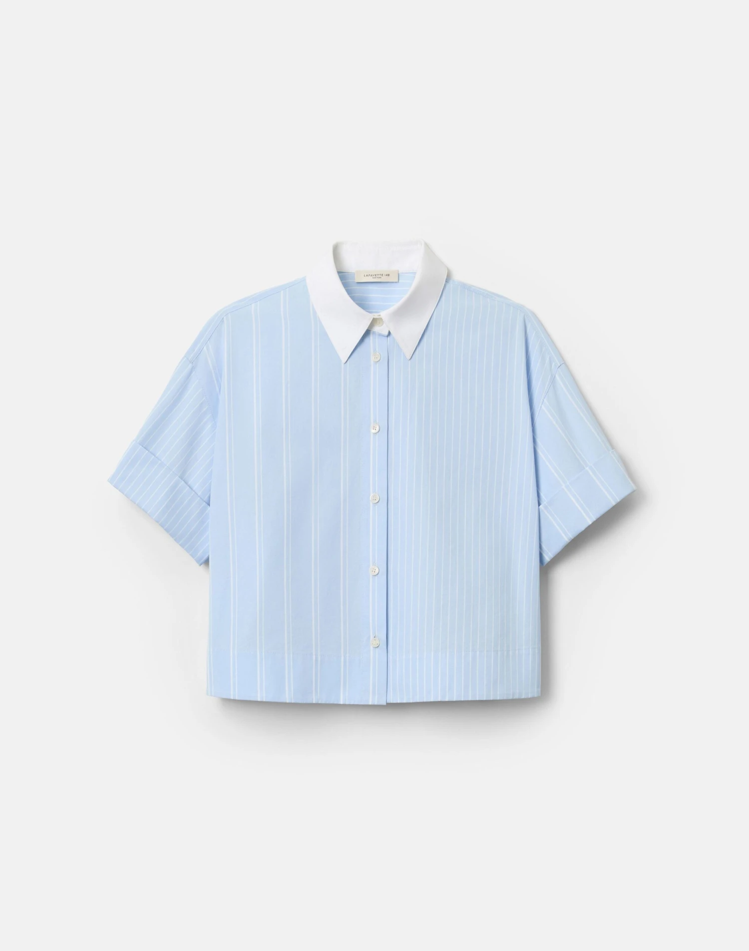 The Montauk shirt features a blocked stripe design and crisp contrast collar. Lightly structured in cool cotton, it’s cut in a boxy, cropped shape with cuffed short sleeves.