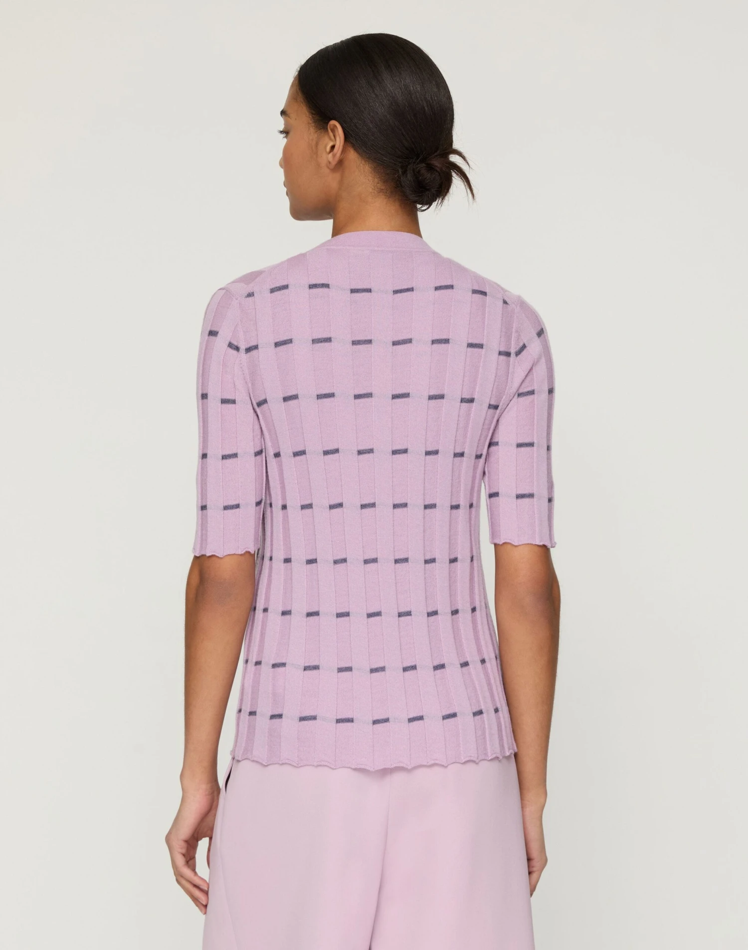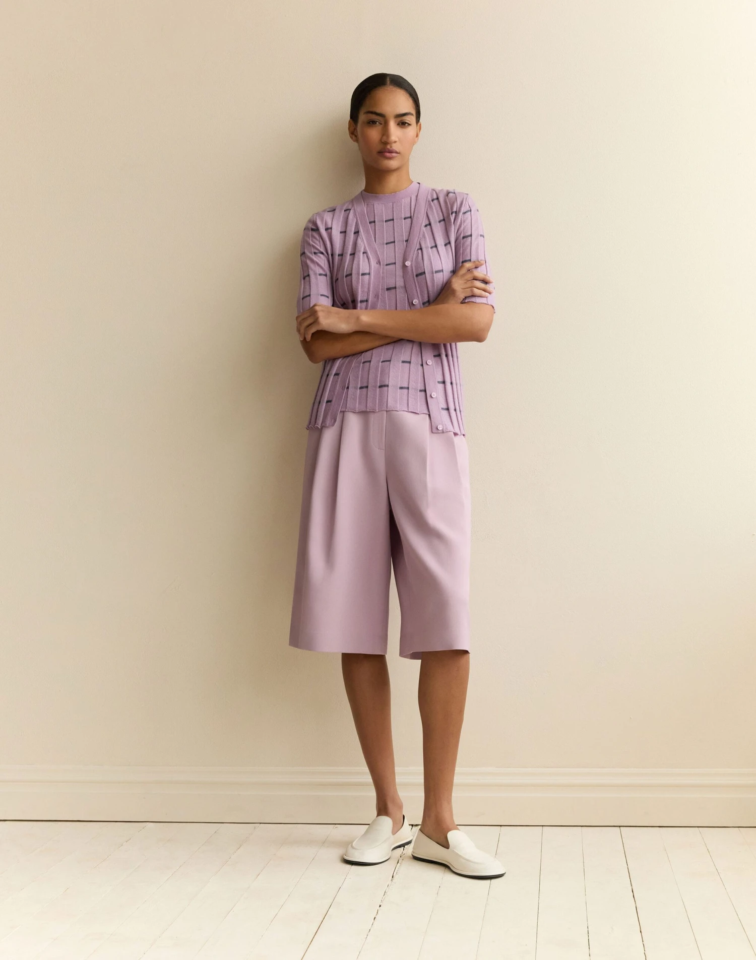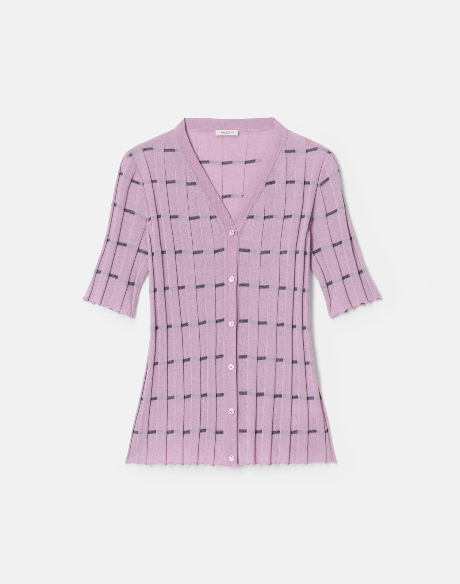 Exceptionally soft and light in finespun cashmere, this short sleeve cardigan features contrasting stripes woven into the wide ribbed design. It fastens with mother-of-pearl buttons and pairs with the coordinating shell for a complete set.