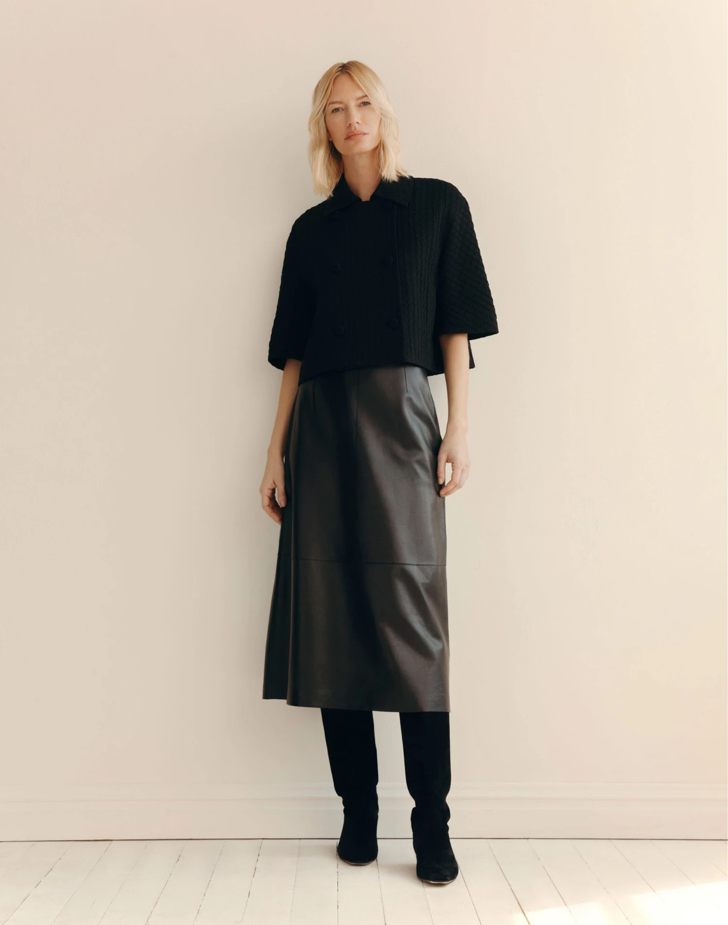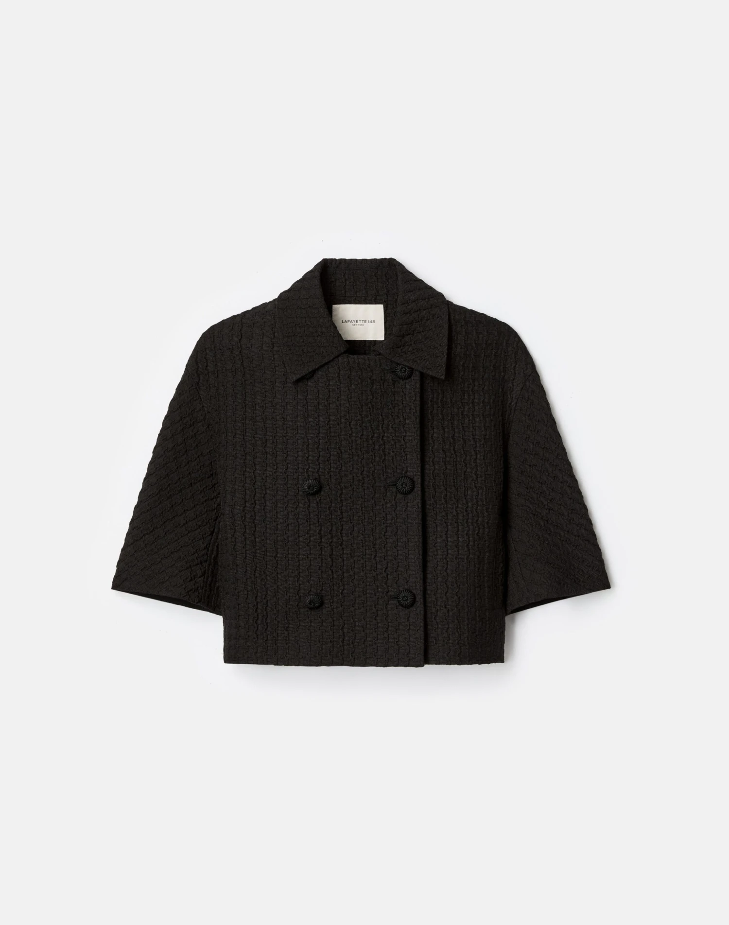 This cropped double-breasted jacket is tailored from lightweight Italian houndstooth jacquard, defined by its dimensional effect. It’s cut in a straight fit with short dolman sleeves and fastens with ribbon soutache buttons.