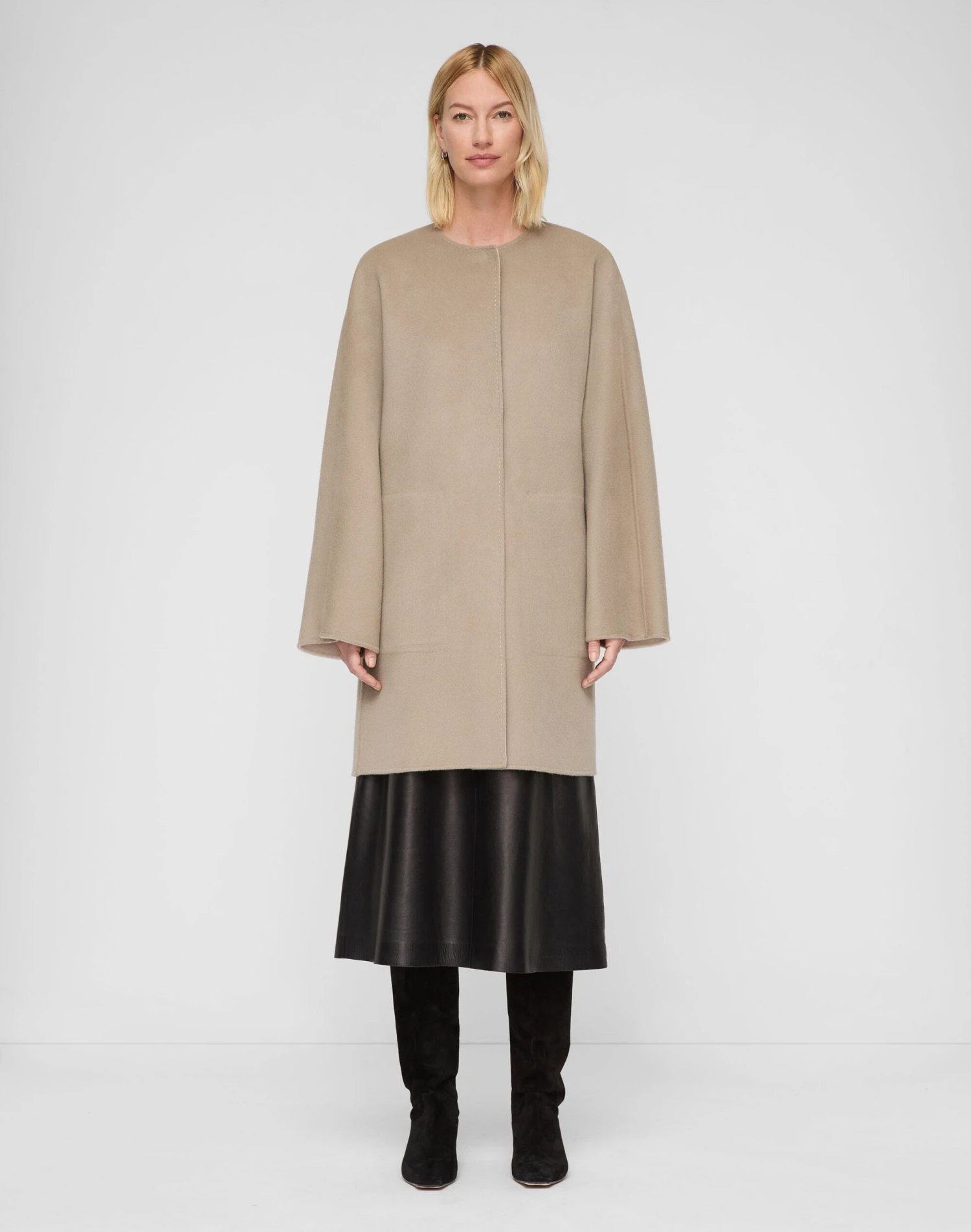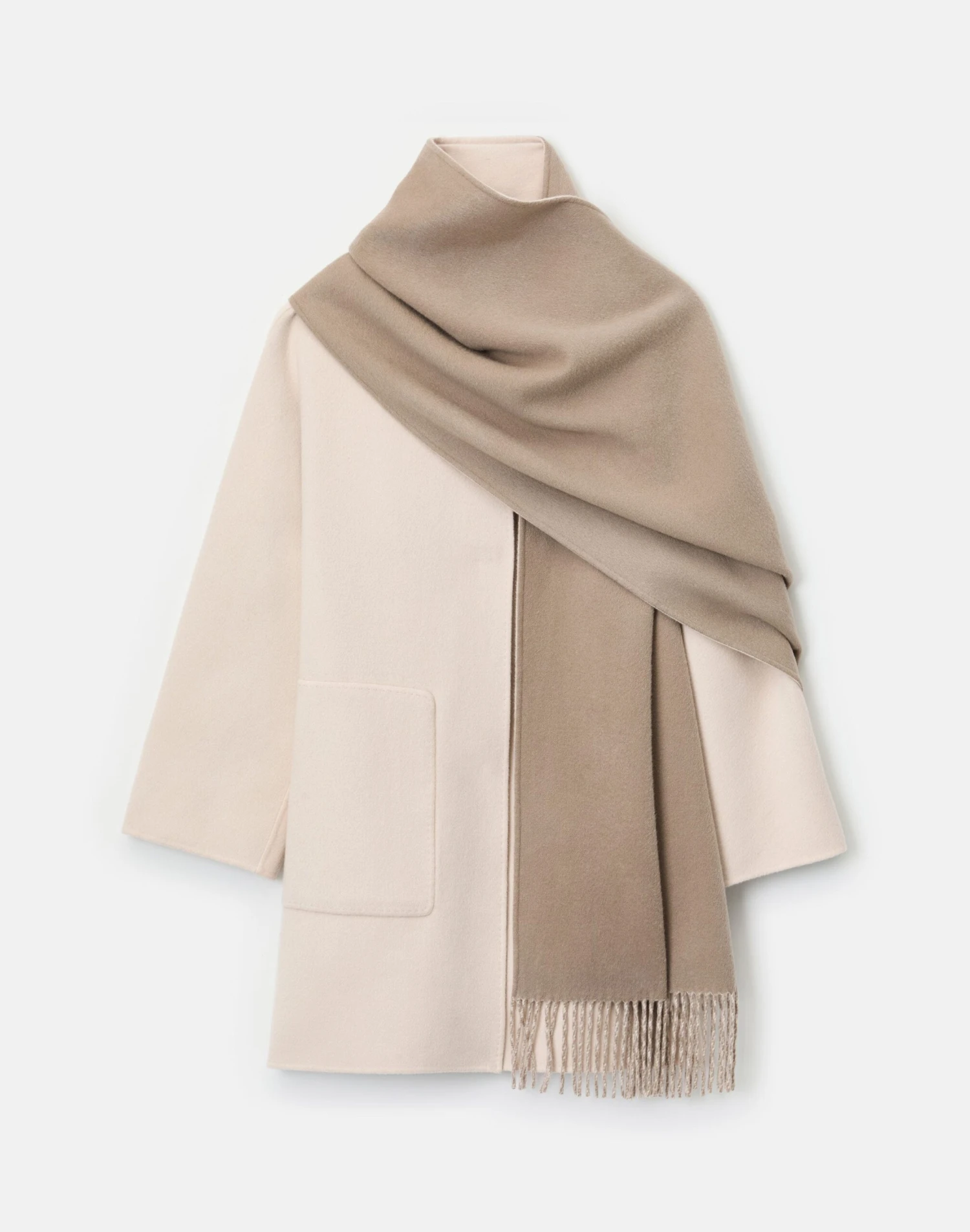 Soft and plush in pure cashmere, this two-tone reversible coat is crafted using the House’s double-face construction with hand-finished pickstitched seams and includes a detachable fringed scarf. The collarless A-line silhouette features long dolman sleeves and a snap-front closure.