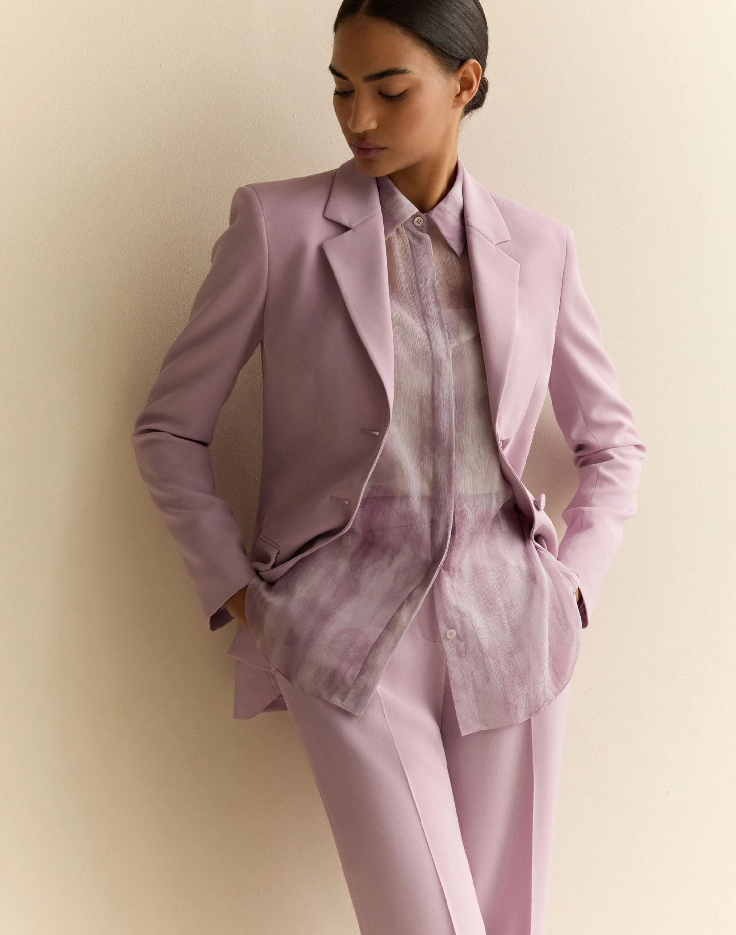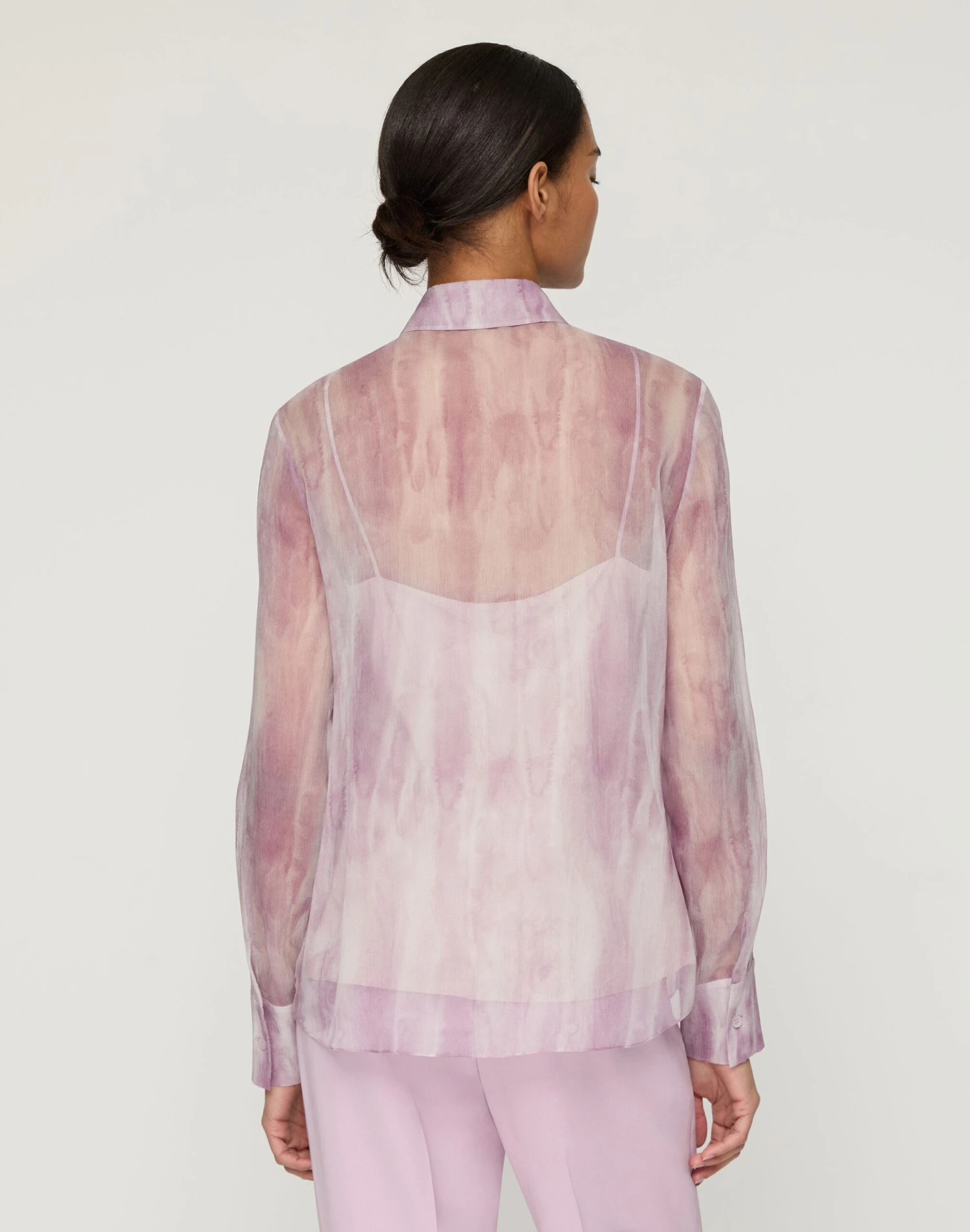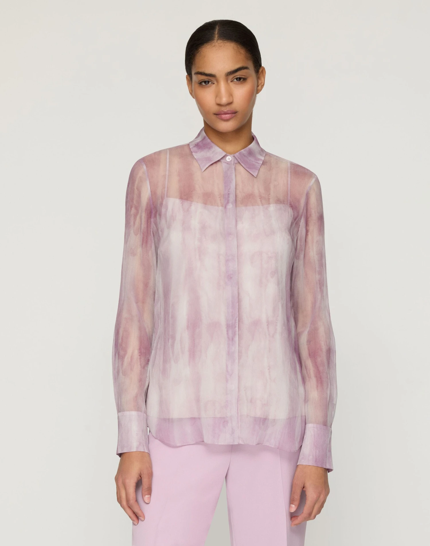 Lafayette 148’s signature button-up blouse features Pre-Fall 2025’s Washed Glaze artwork, printed on airy Italian silk crépon with a soft crinkle effect. The straight-fit silhouette includes a removable camisole to balance the semi-sheer design.
