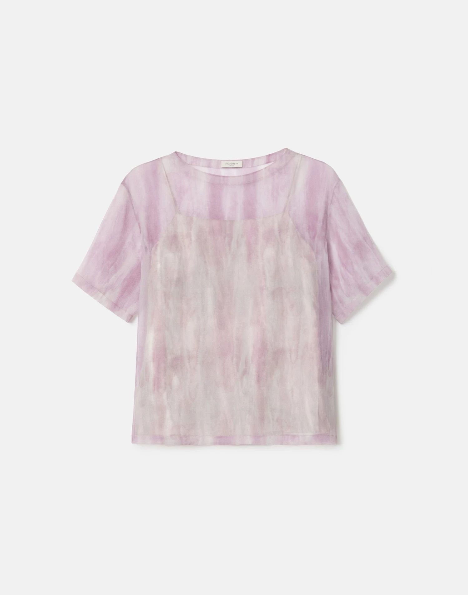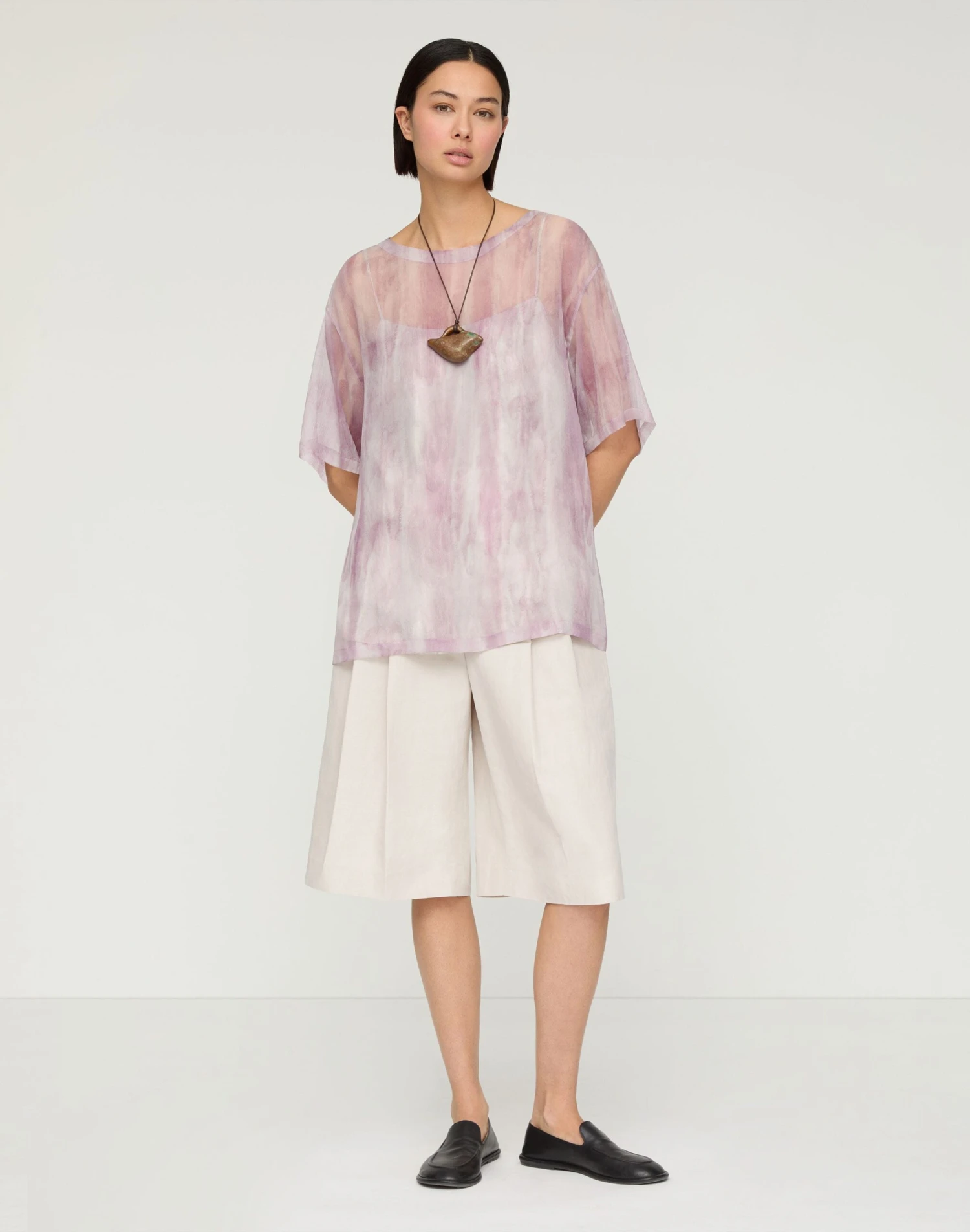 This short sleeve blouse features Pre-Fall 2025’s Washed Glaze artwork, printed on airy silk crépon with a soft crinkle effect. The relaxed silhouette includes a removable printed camisole to complement the semi-sheer design.