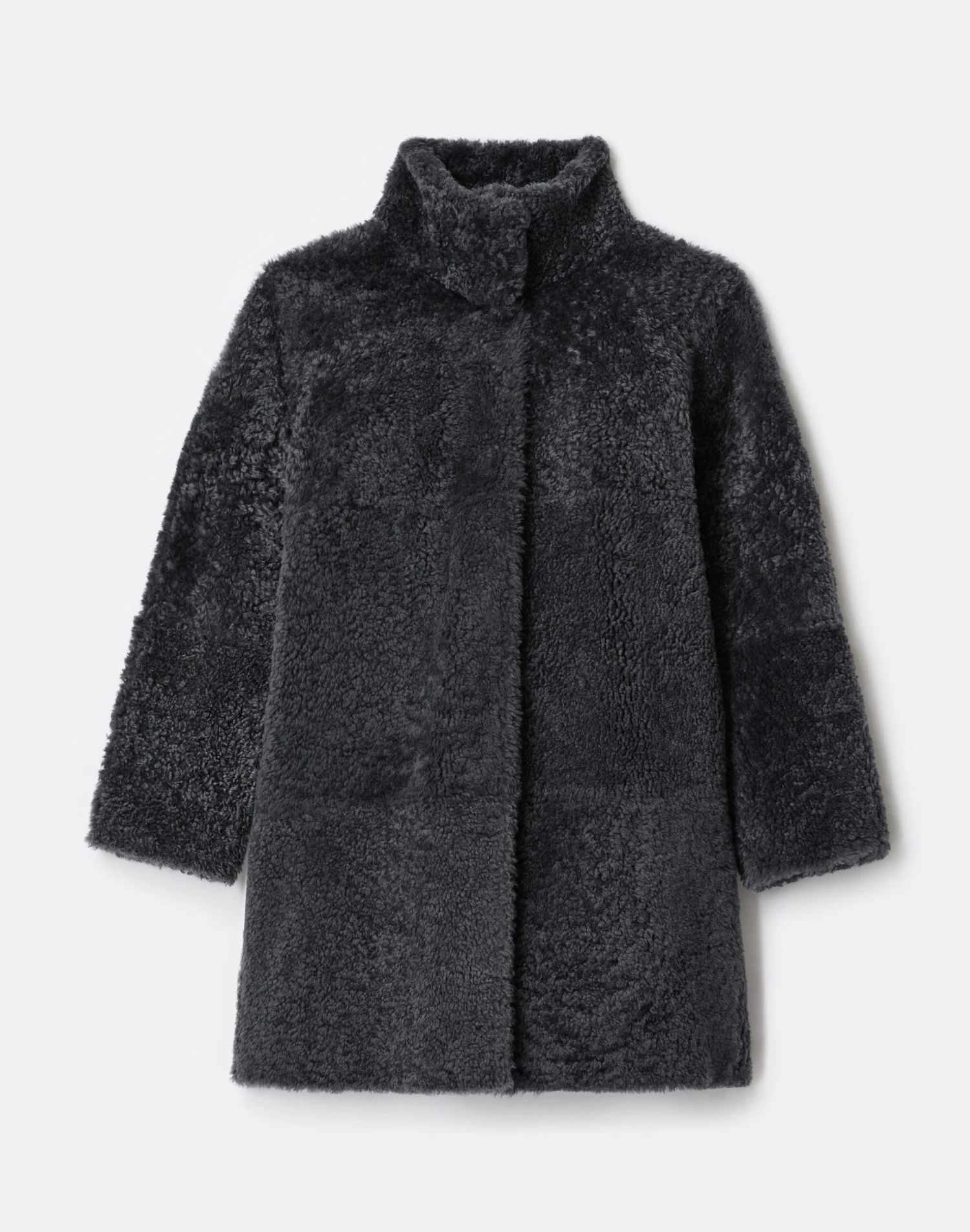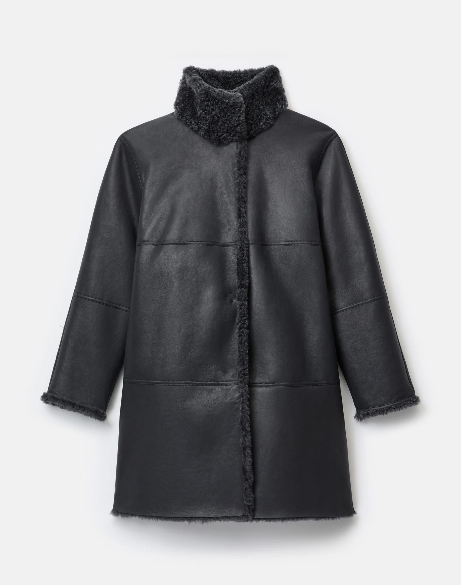 This cocooning coat reverses from plush, wavy shearling to supple leather, finished with hand-painted edges. The straight shape is relaxed through dropped shoulders, with a funnel collar and leather-trimmed snap closure.