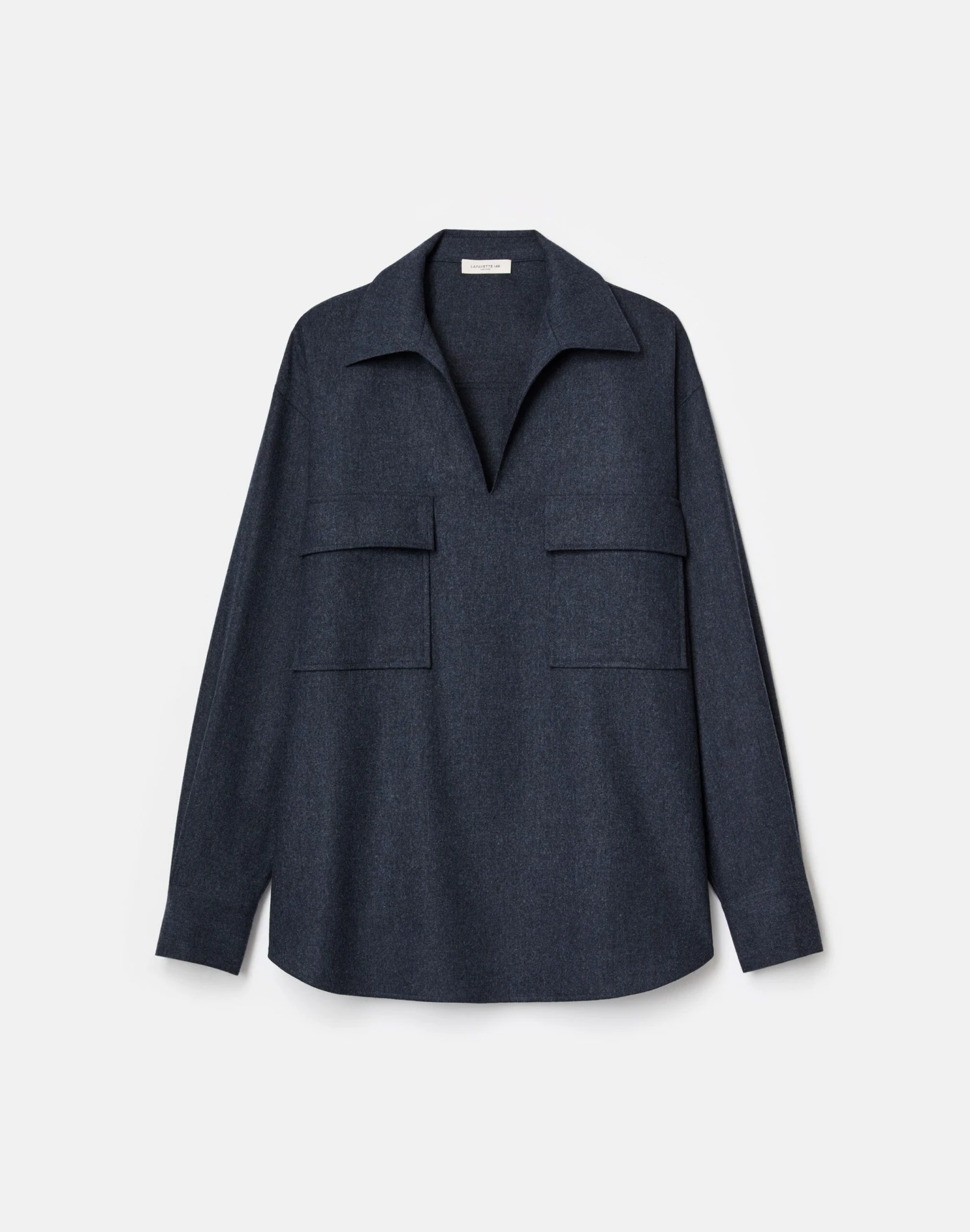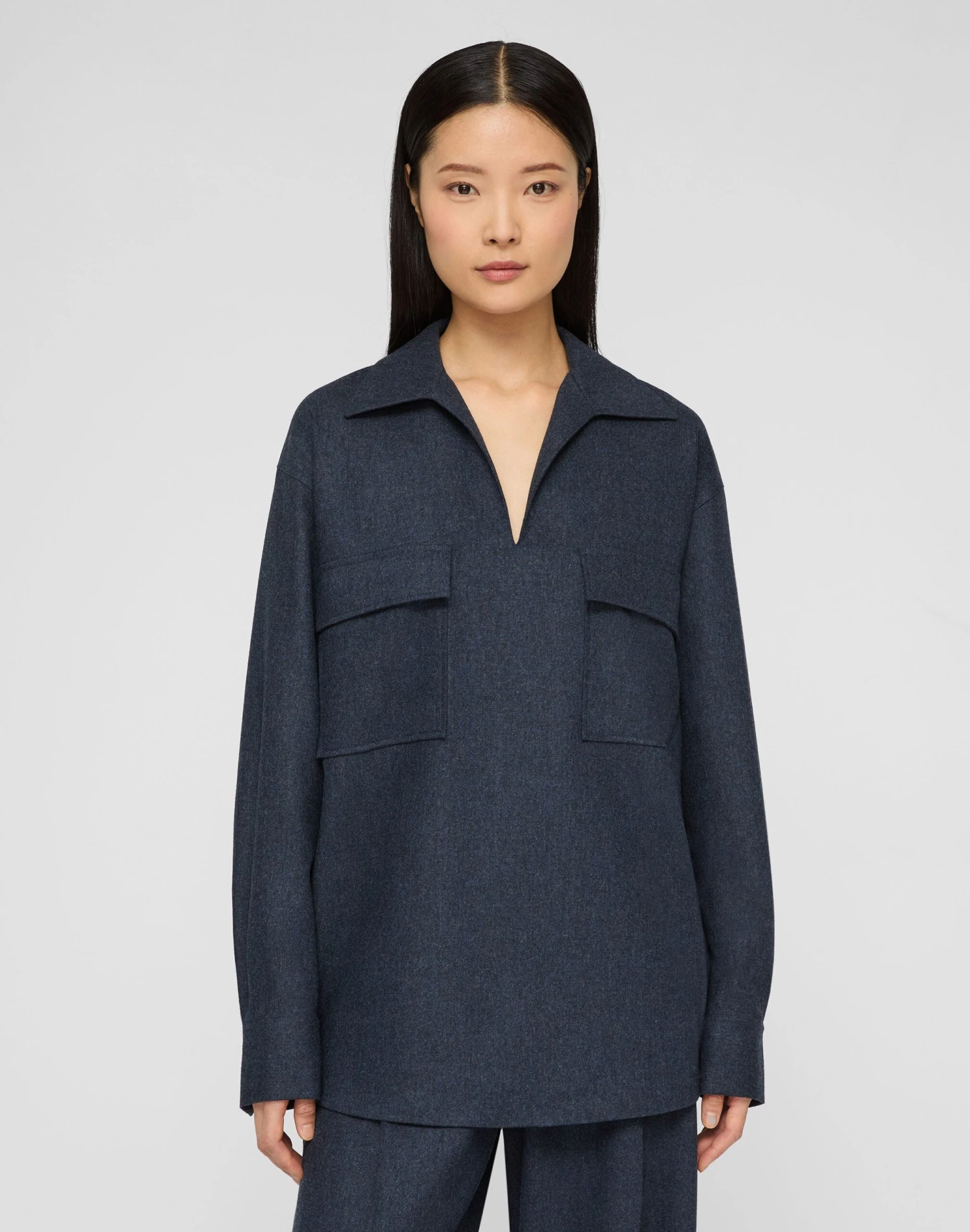 Defined by oversized flap pockets, this collared popover blouse is crafted in lightweight brushed flannel woven from the finest Merino wool infused with cashmere. The relaxed shape extends through dropped shoulders to an elongated hem, finished with buttoned cuffs.