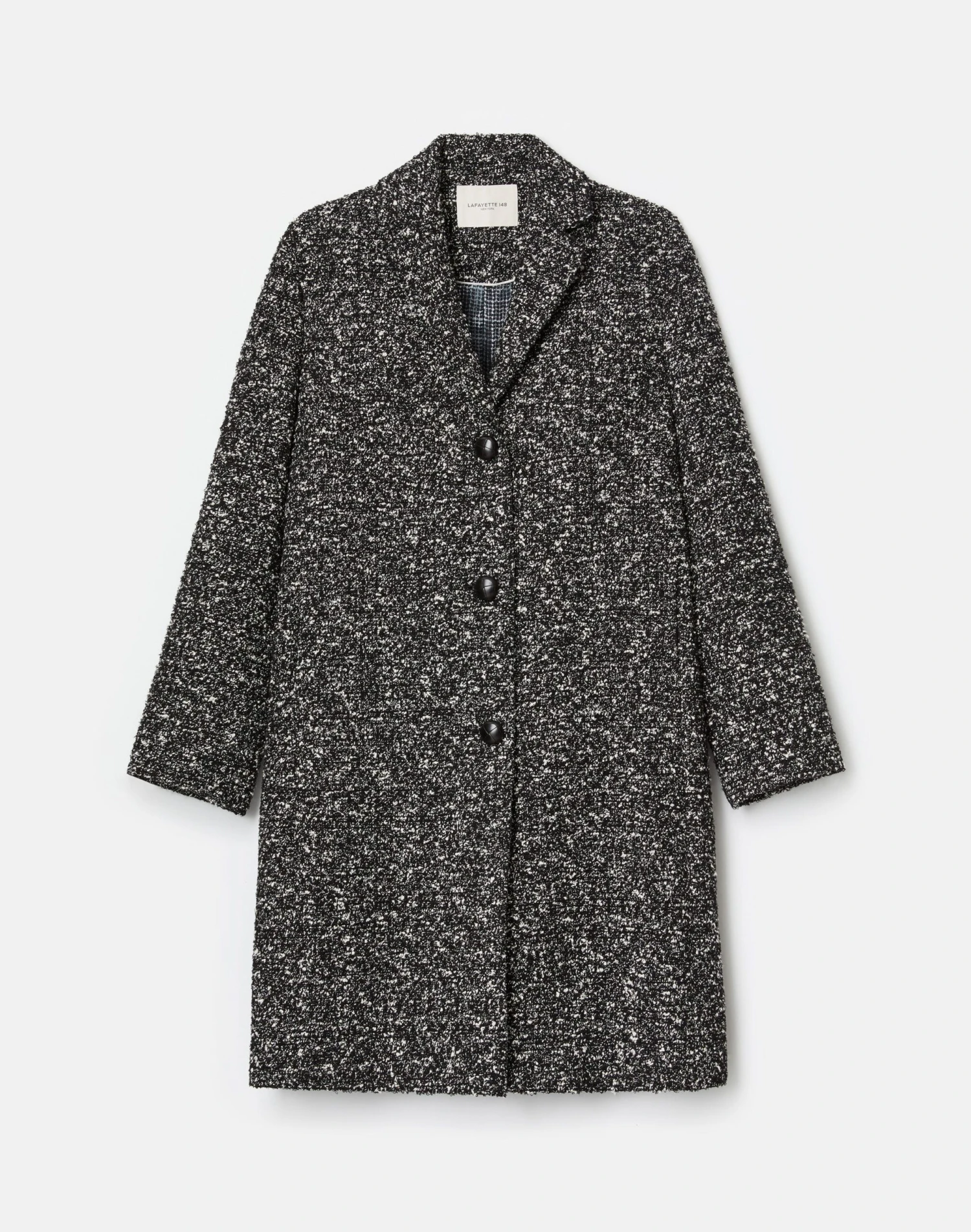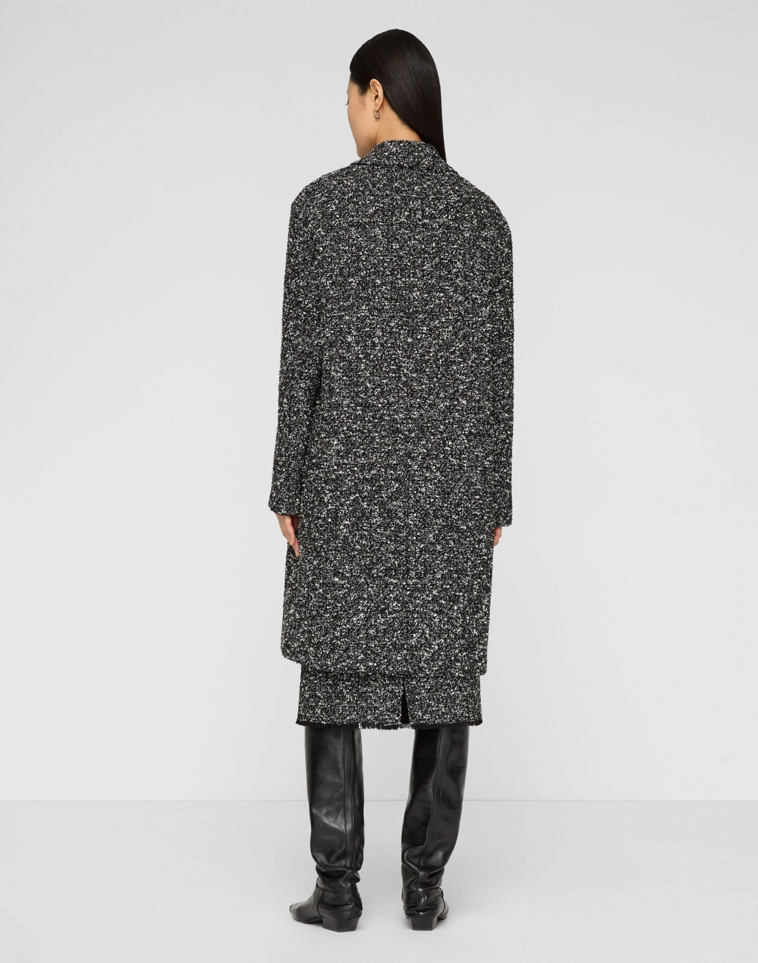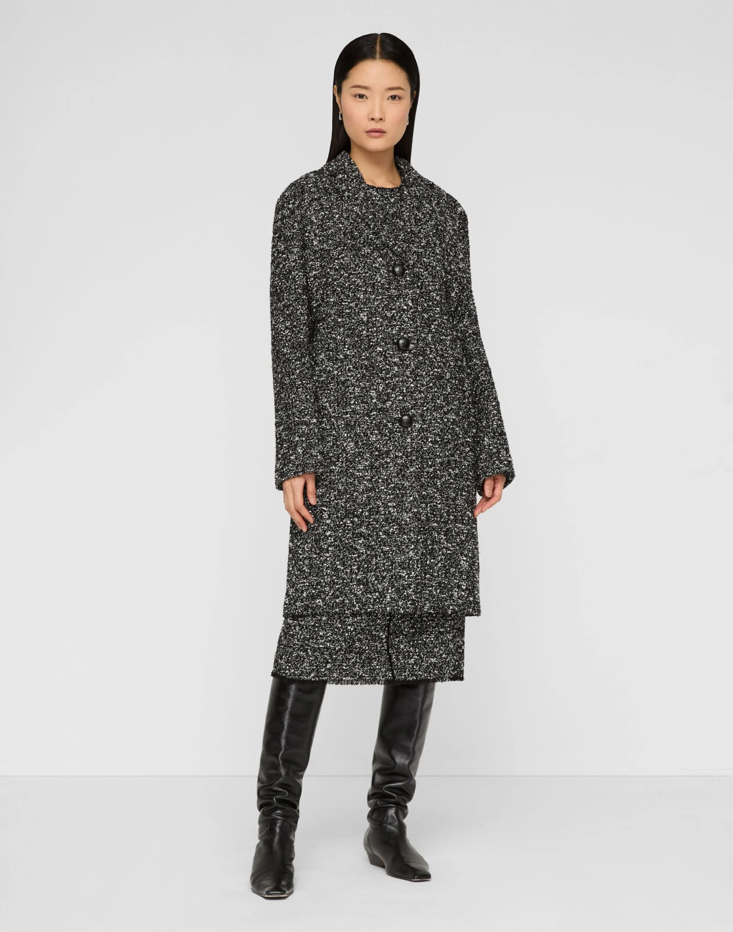 This tailored coat is crafted from Italian wool-cotton tweed with a lofty bouclé effect and raw-edged finish. It features a straight cut, dropped shoulders and a vented back, fastening at the front with three braided leather buttons.
